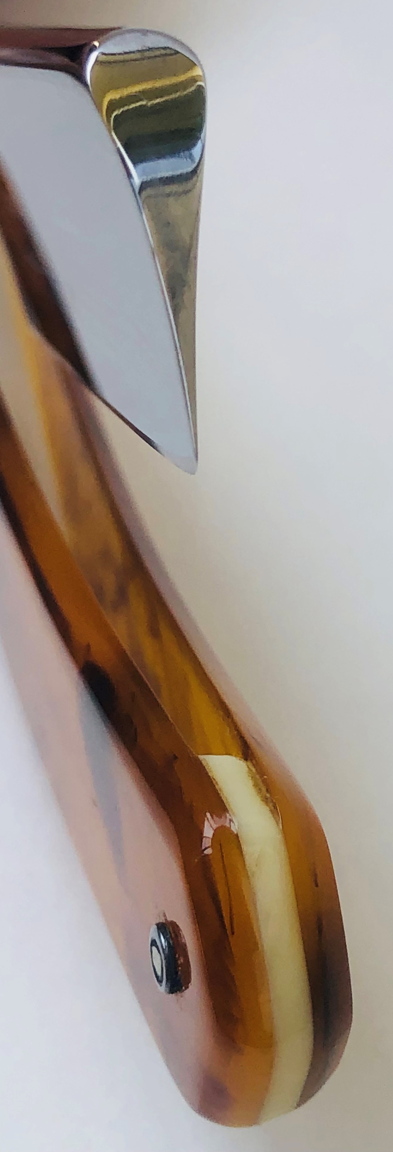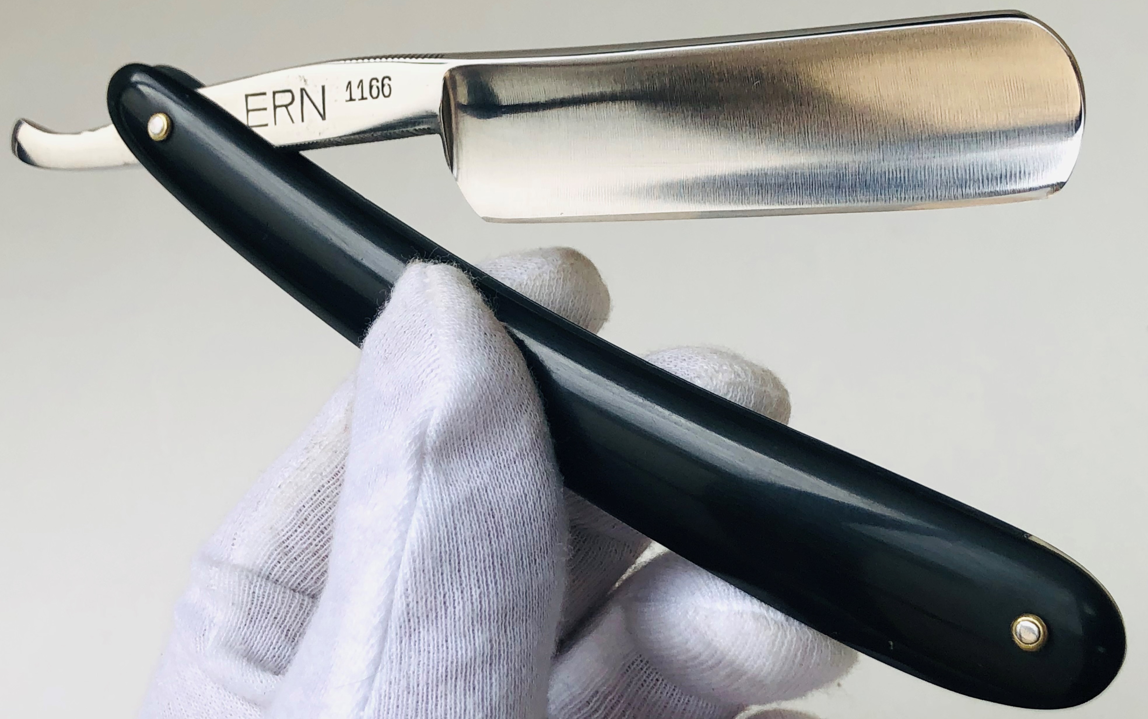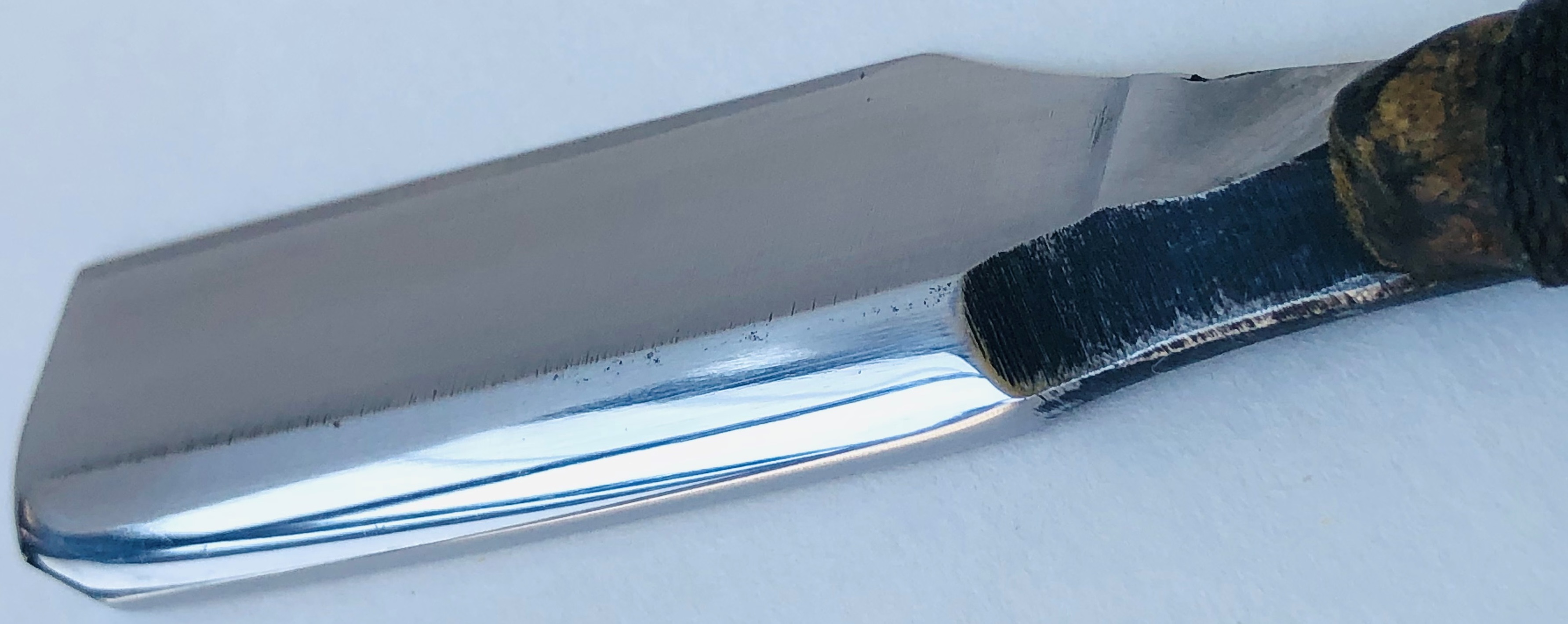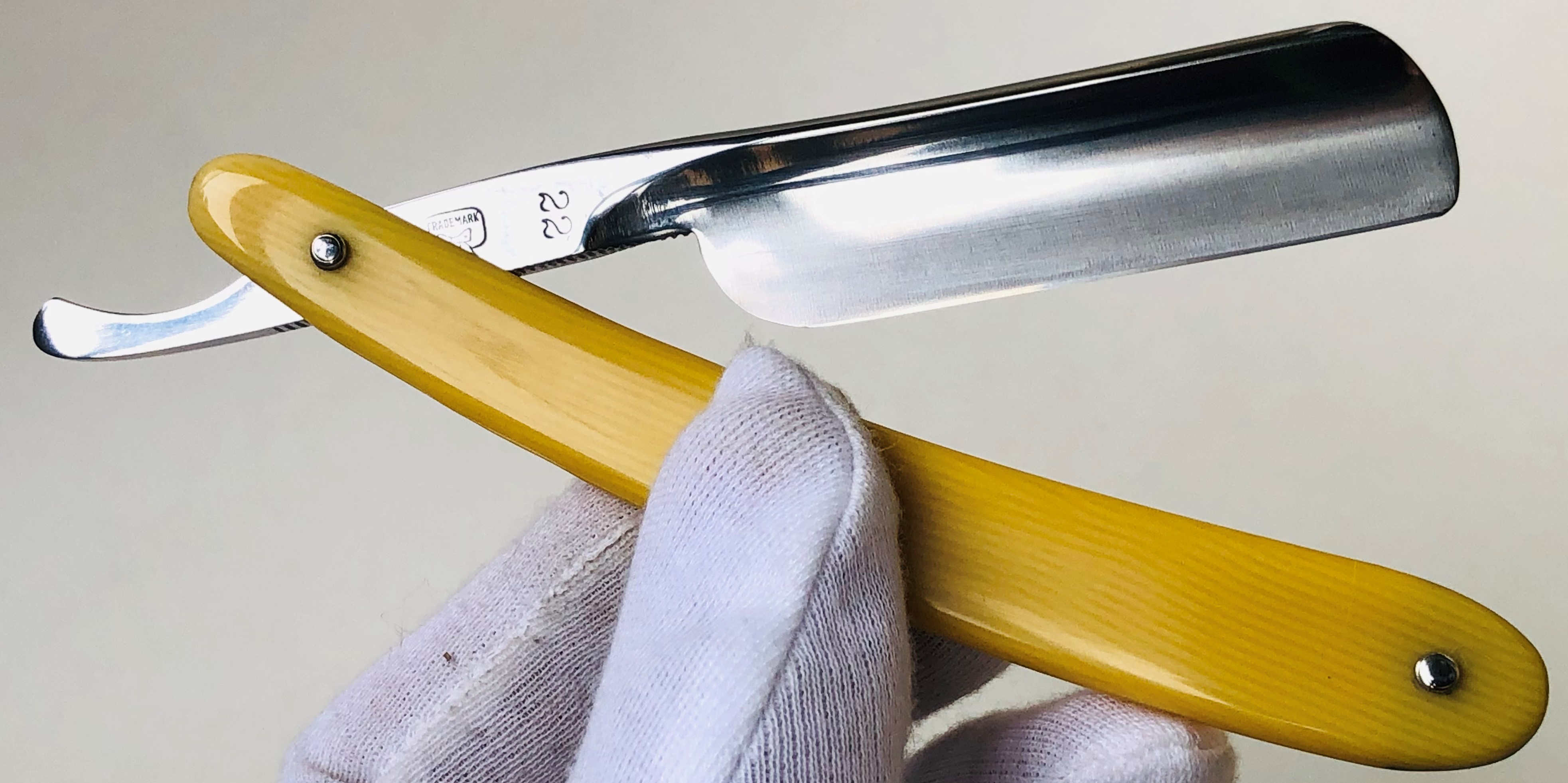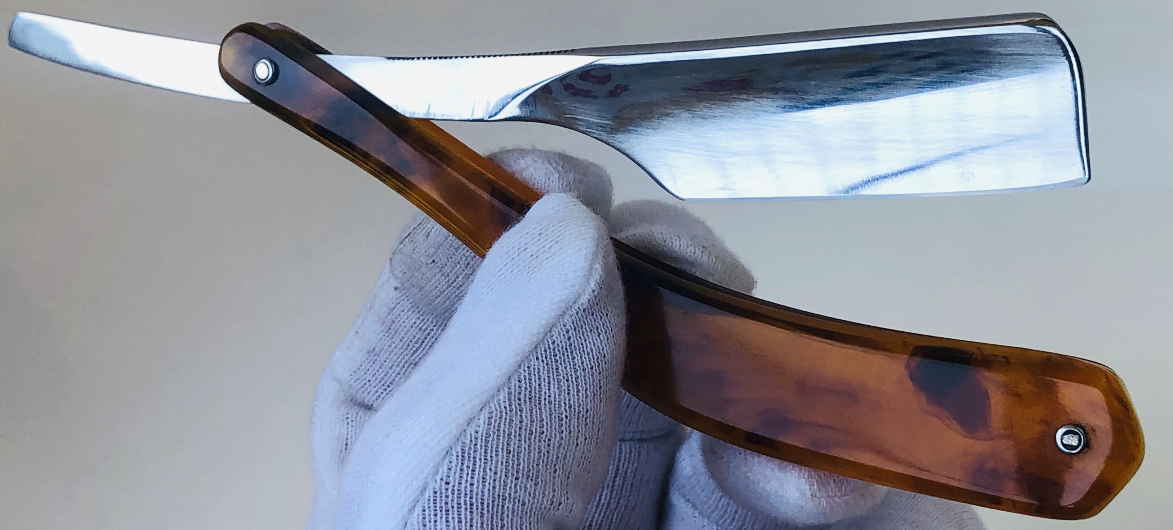 Был у меня старенький клинок,до которого не доходили руки. Древняя бритва, с достаточно значительными "следами времени", в виде патины и каверн. Полотно было по возможности очищено, а на эрле и обушке все оставил как есть, дабы придать бритве естественный, антикварный вид,соответствующий её приличному возрасту.Старую оправу из оргстекла подобрал под размер клинка.Новые втулки и внутренние шайбы. Заточил и лично протестировал. Тут сталь достаточно твердая, так что на первый раз бритьё прошло с элементом агрессии,но все чисто и без раздражения.В общем и целом неплохая и совершенно недорогая бритва,со "следами времени". Заточена и готова к бритью.