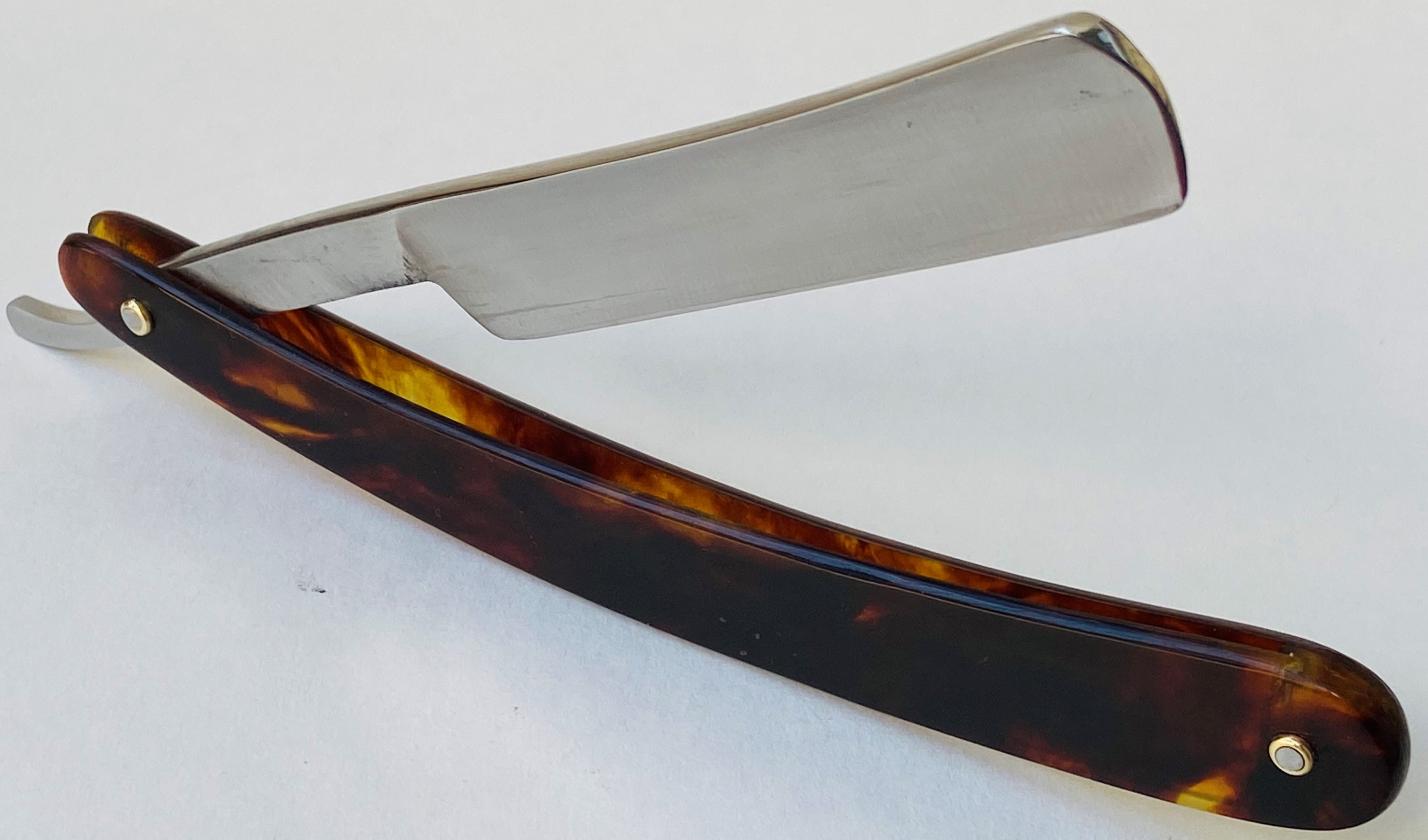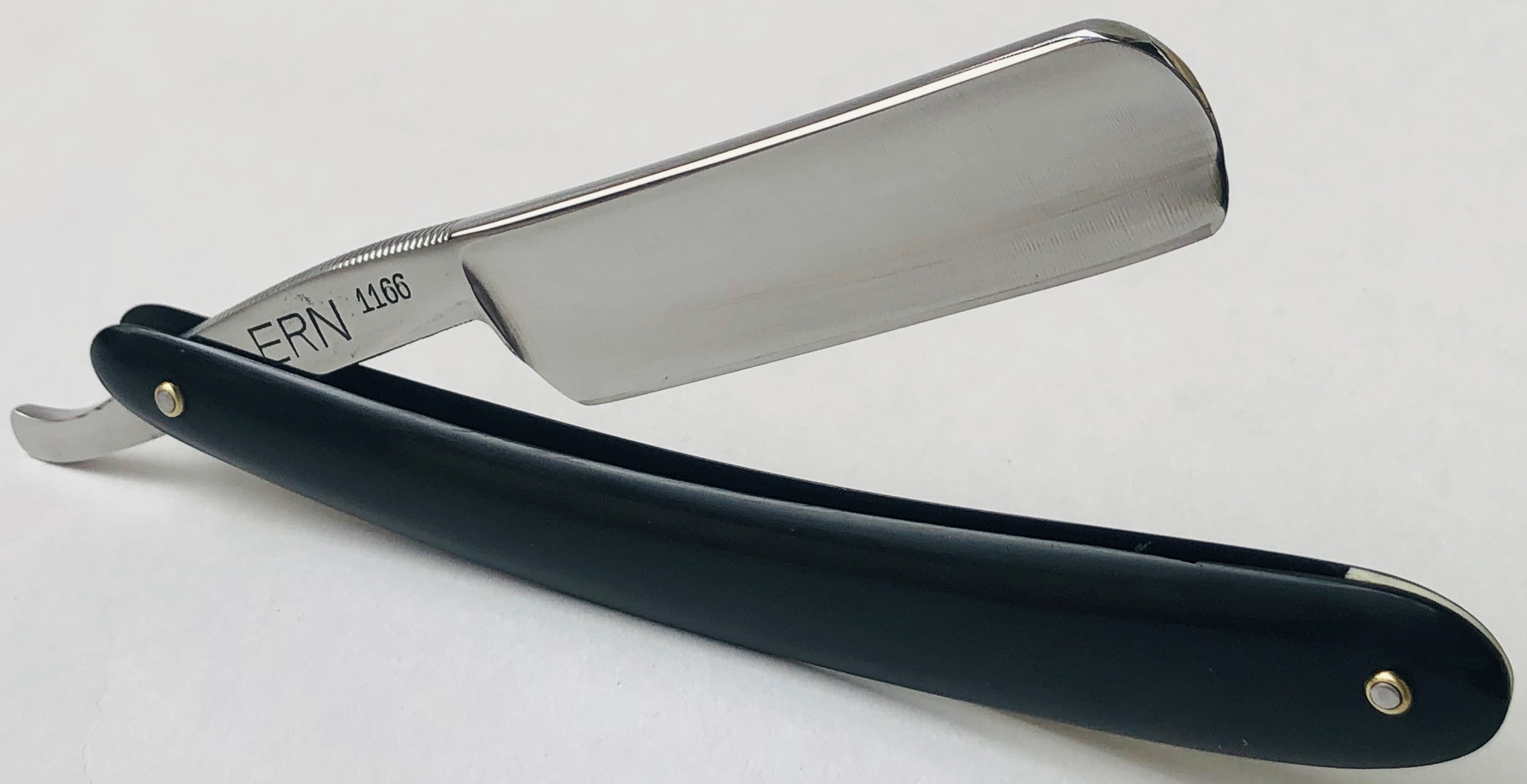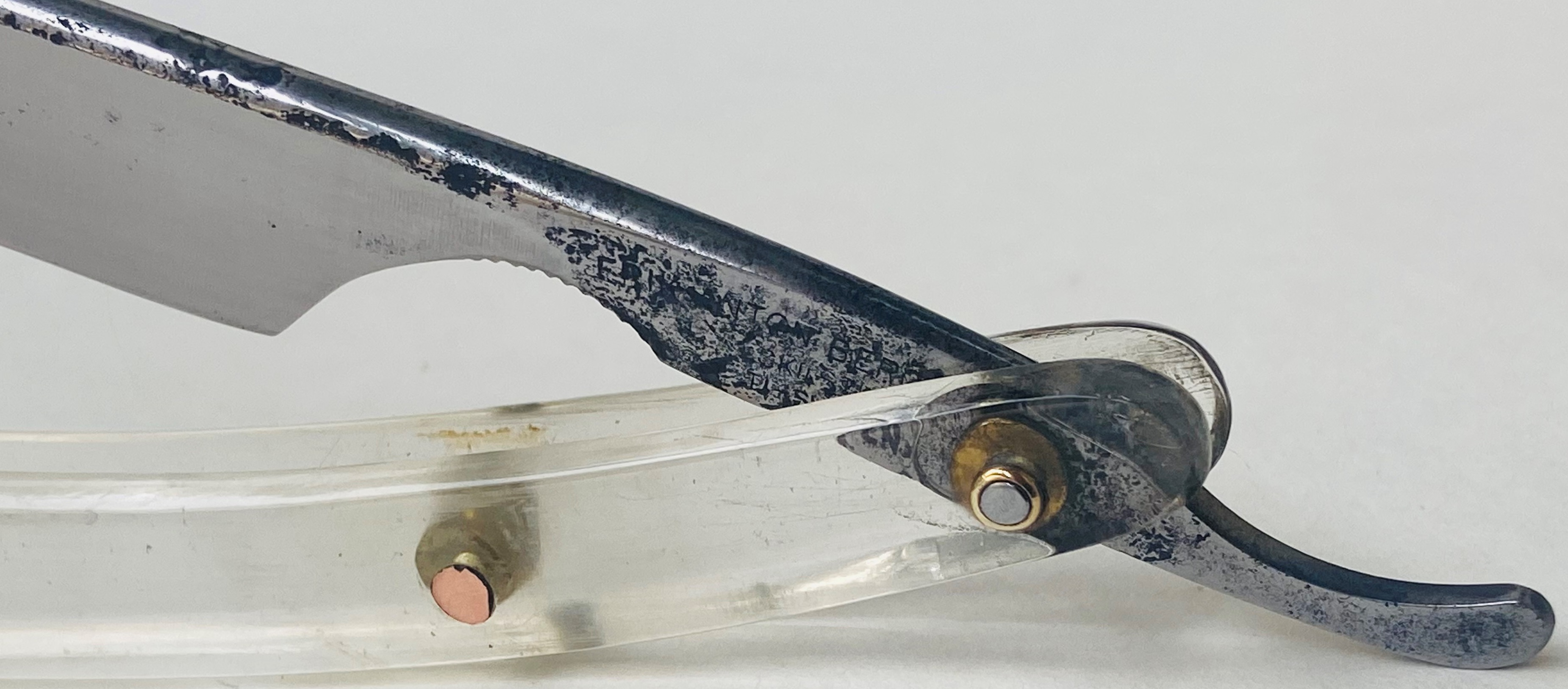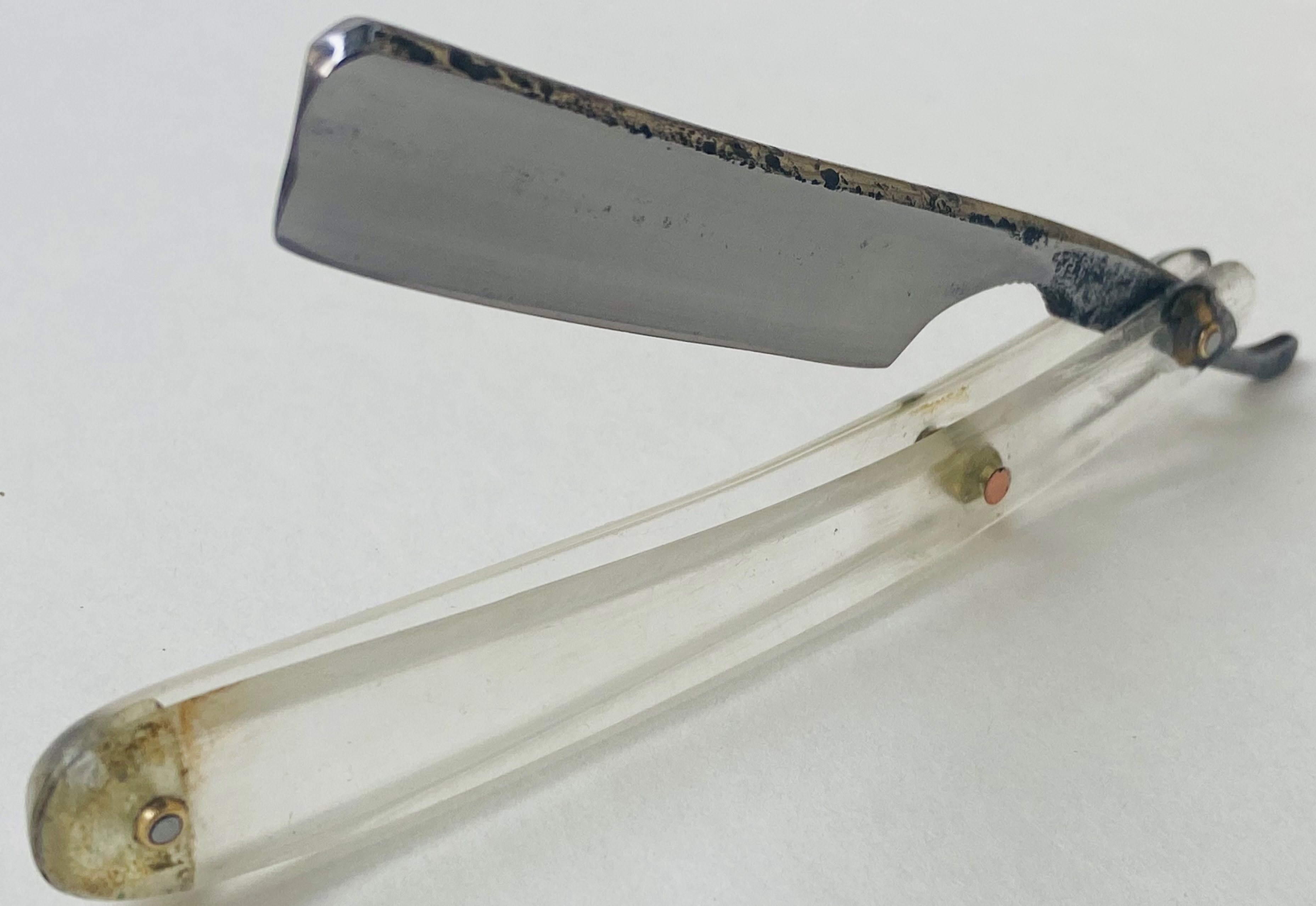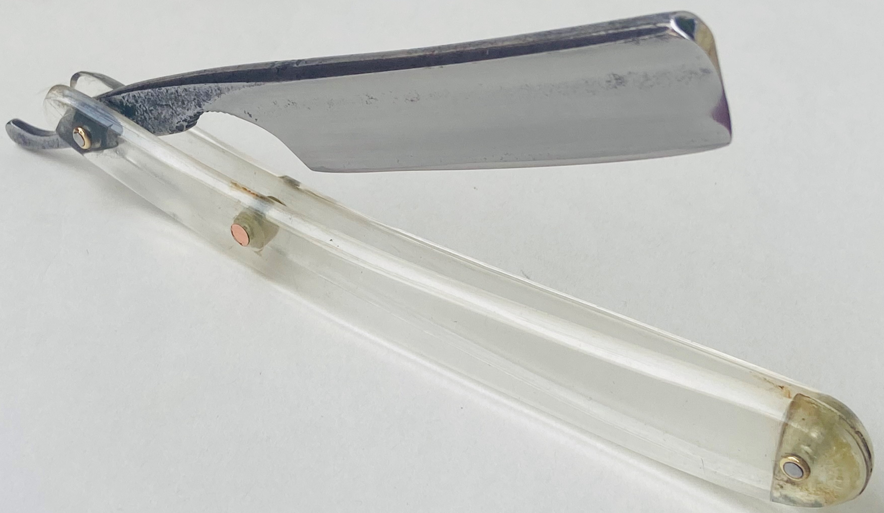 Был у меня старенький клинок,до которого не доходили руки. Древняя бритва, с достаточно значительными "следами времени", в виде патины и каверн. Полотно было по возможности очищено, а на эрле и обушке все оставил как есть, дабы придать бритве естественный, антикварный вид,соответствующий её приличному возрасту.Старую оправу из оргстекла подобрал под размер клинка.Новые втулки и внутренние шайбы. Заточил и лично протестировал. Тут сталь достаточно твердая, так что на первый раз бритьё прошло с элементом агрессии,но все чисто и без раздражения.В общем и целом неплохая и совершенно недорогая бритва,со "следами времени". Заточена и готова к бритью.