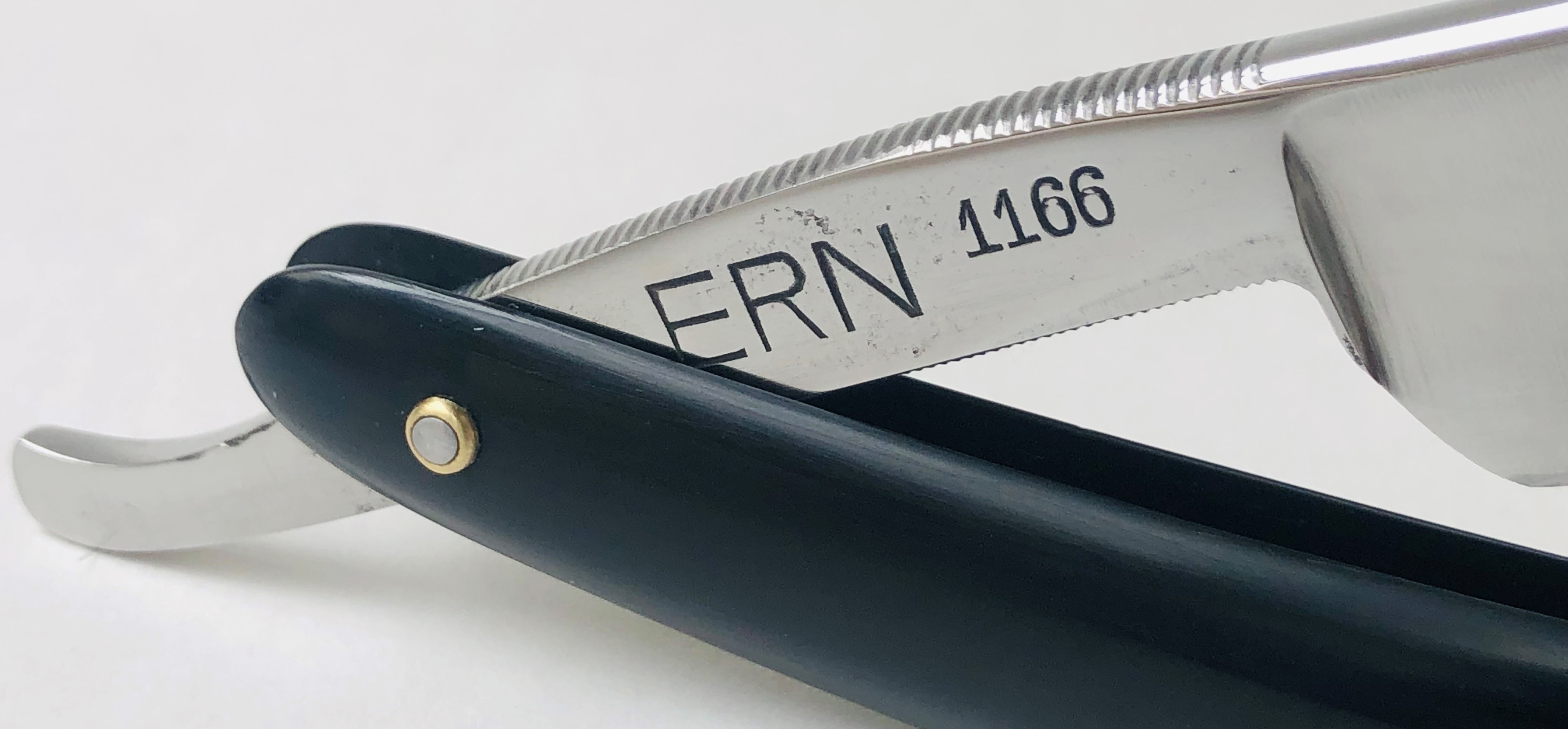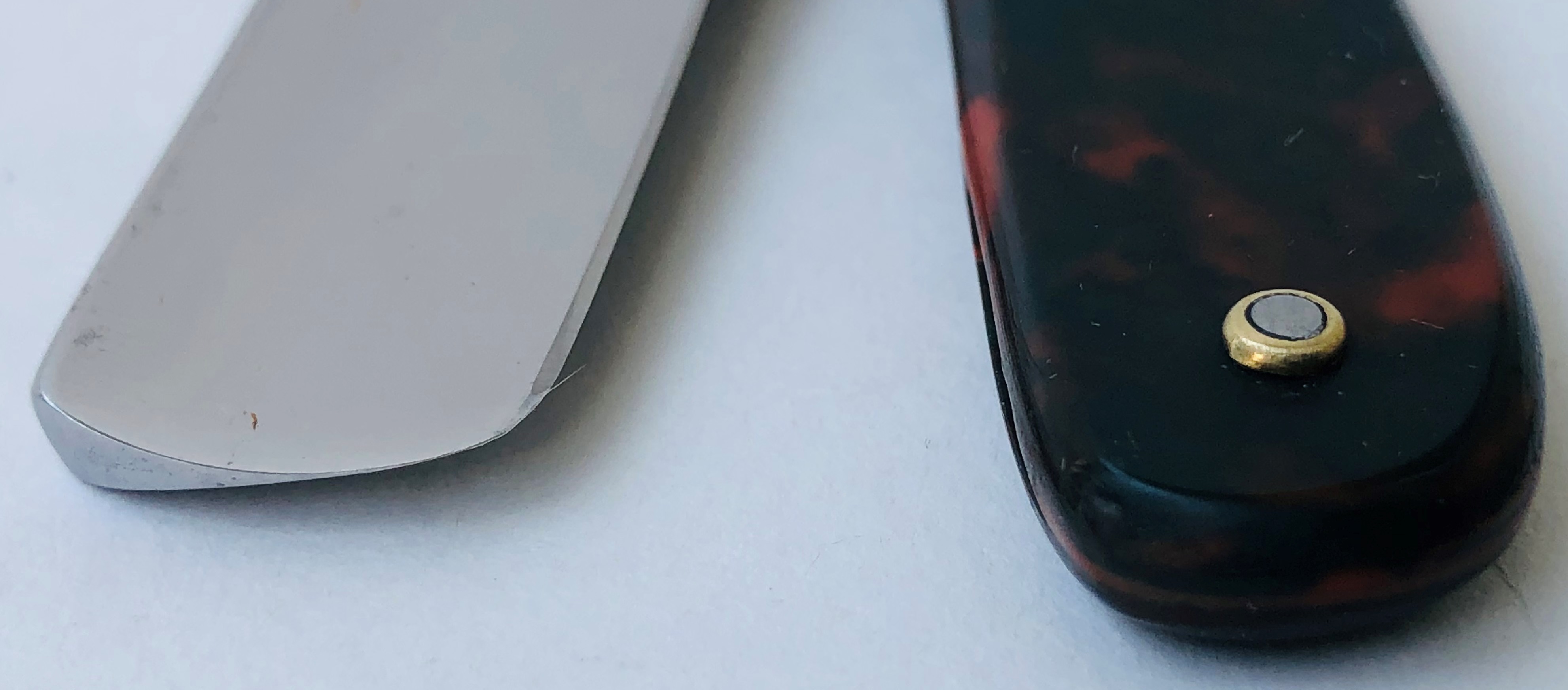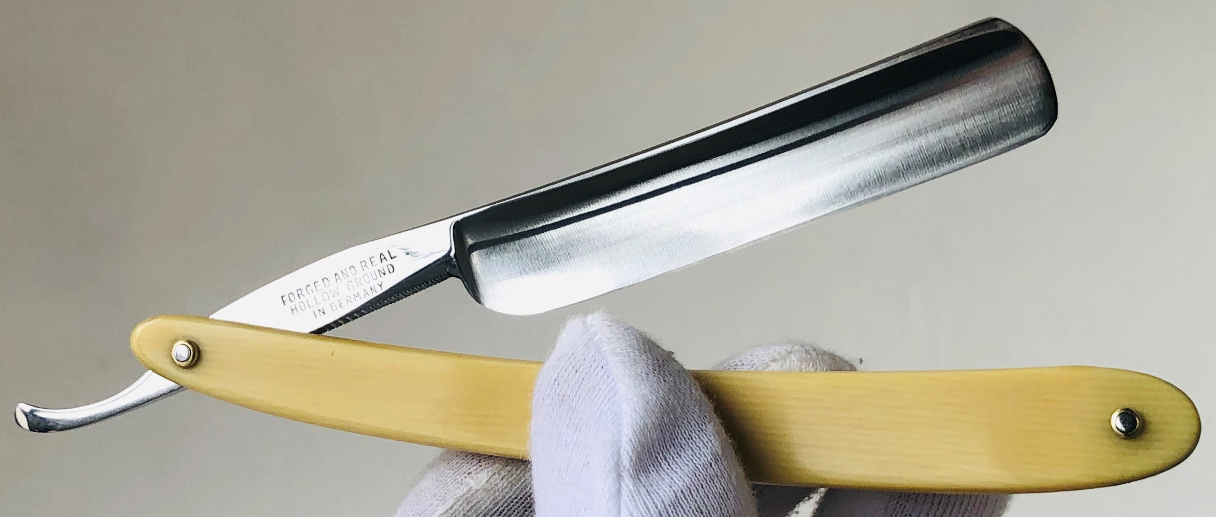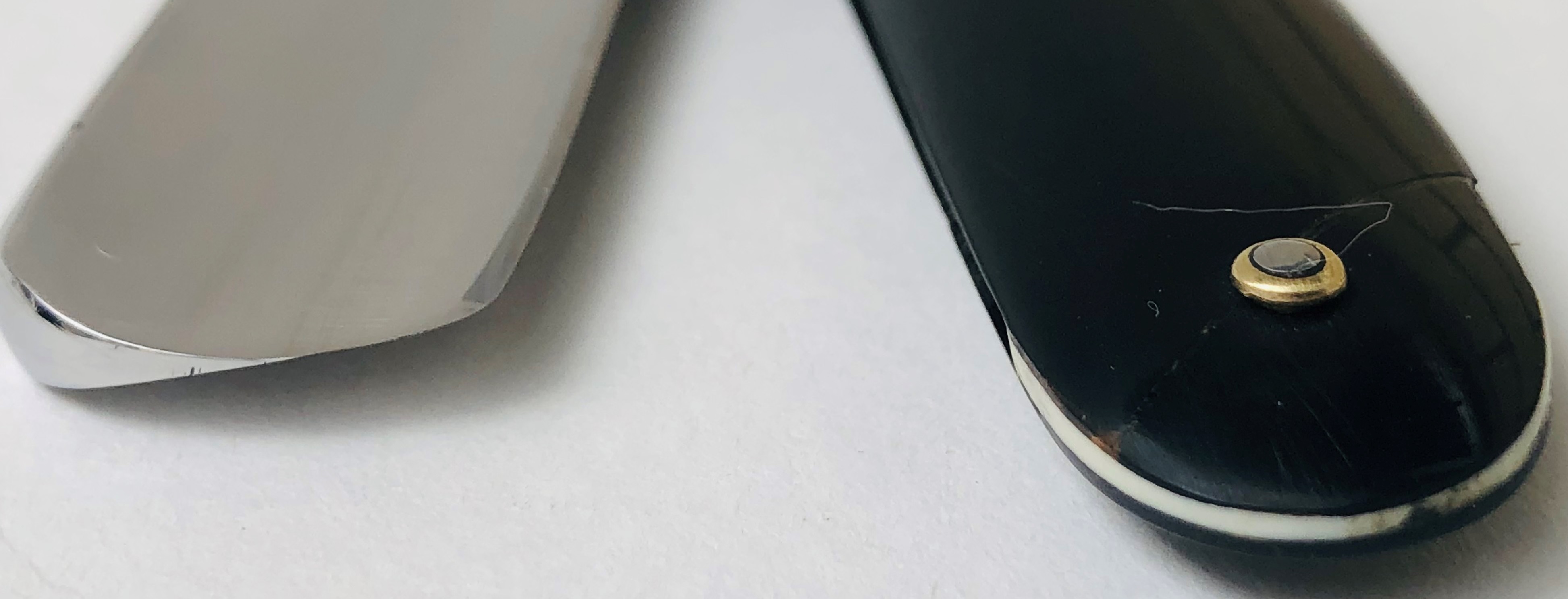 Был у меня старенький клинок,до которого не доходили руки. Древняя бритва, с достаточно значительными "следами времени", в виде патины и каверн. Полотно было по возможности очищено, а на эрле и обушке все оставил как есть, дабы придать бритве естественный, антикварный вид,соответствующий её приличному возрасту.Старую оправу из оргстекла подобрал под размер клинка.Новые втулки и внутренние шайбы. Заточил и лично протестировал. Тут сталь достаточно твердая, так что на первый раз бритьё прошло с элементом агрессии,но все чисто и без раздражения.В общем и целом неплохая и совершенно недорогая бритва,со "следами времени". Заточена и готова к бритью.