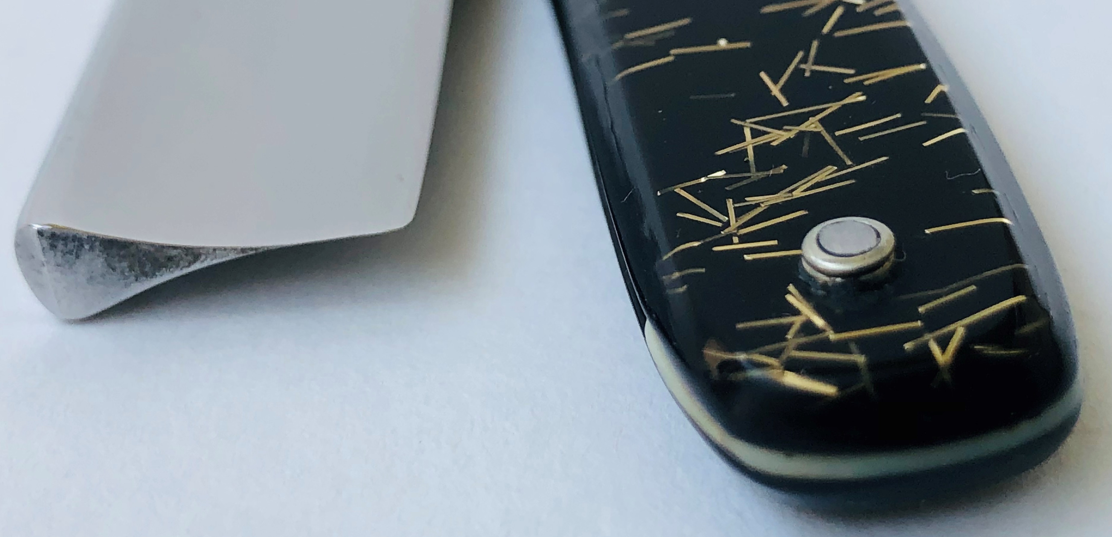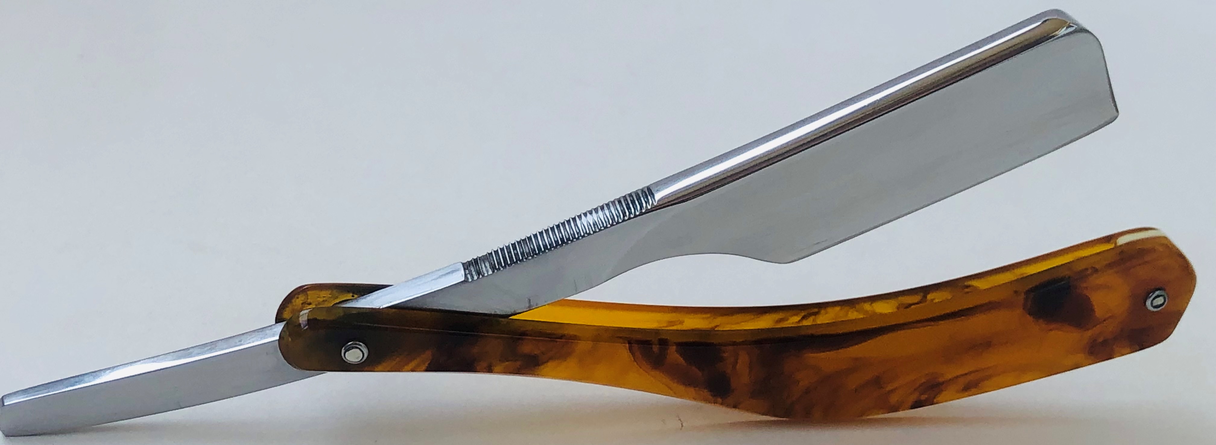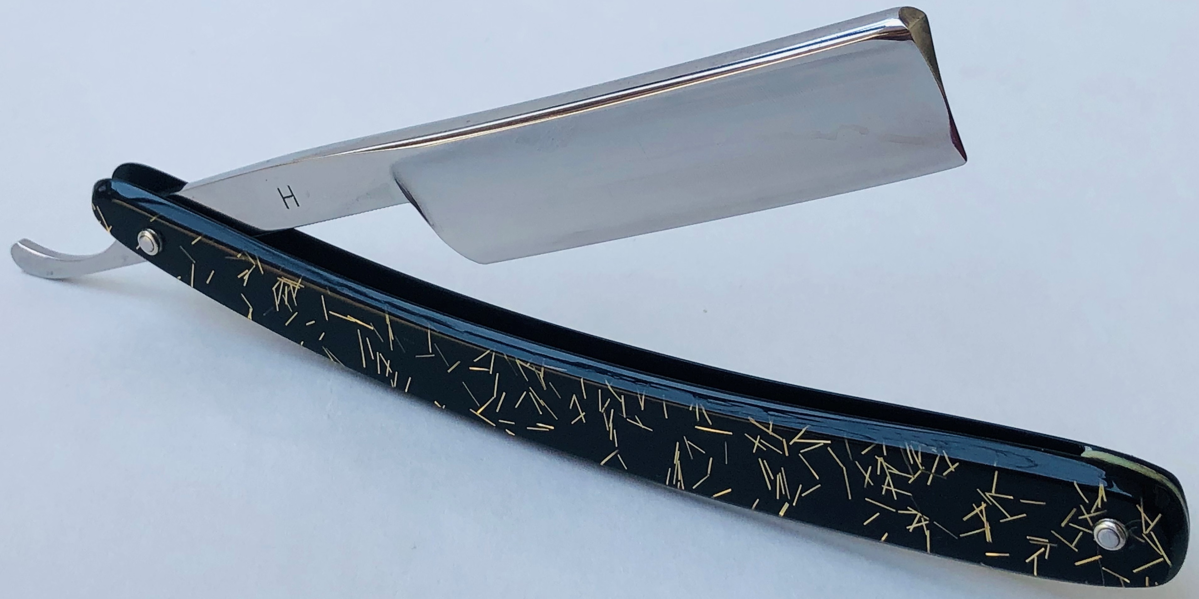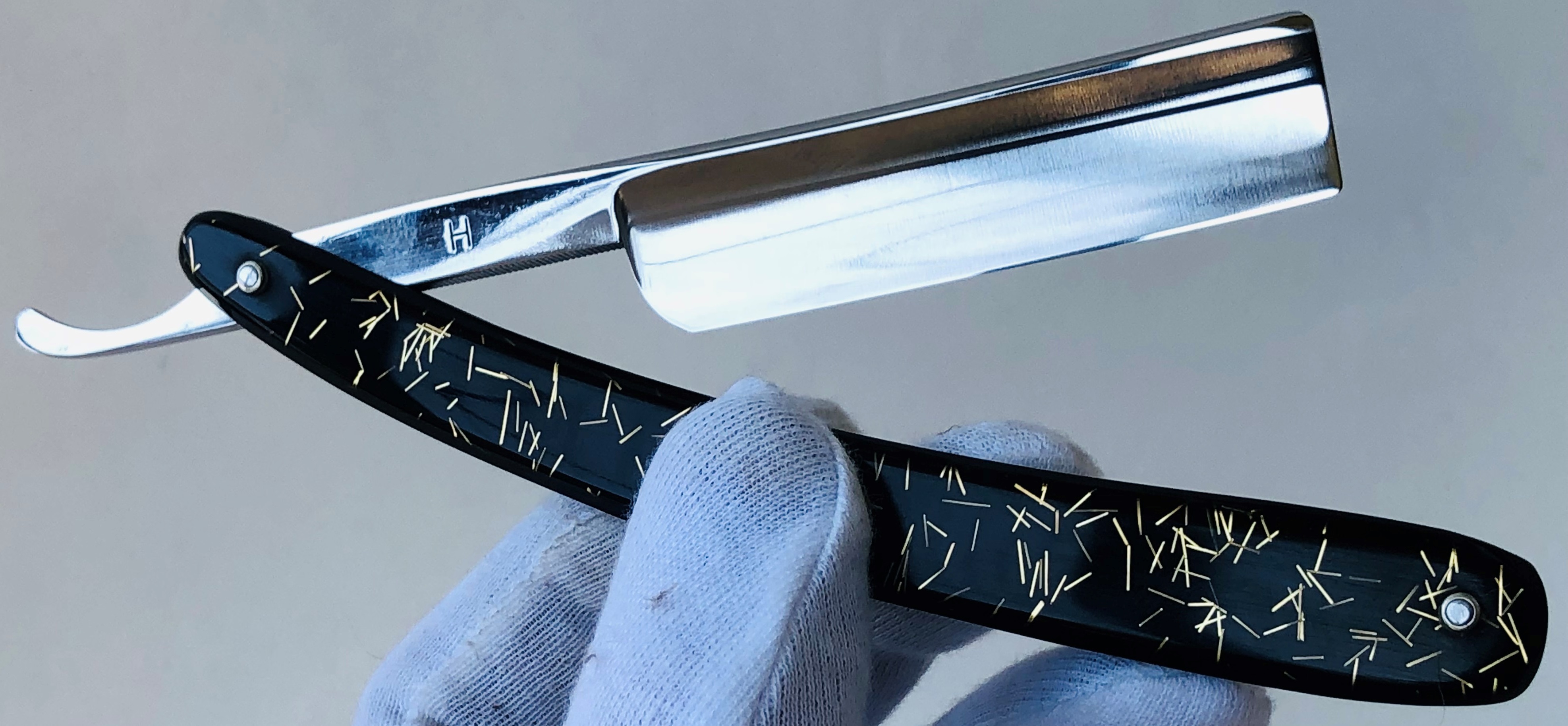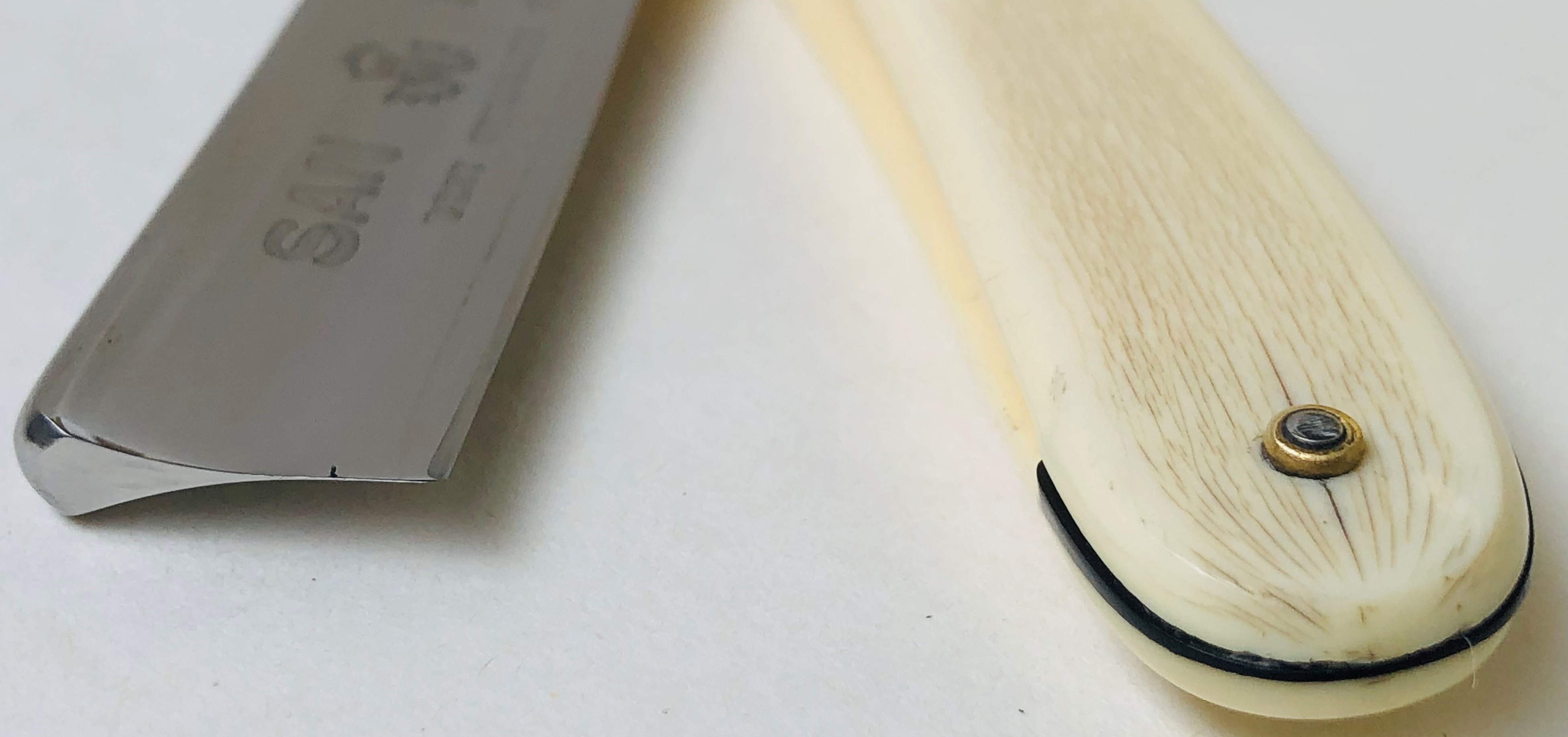 Был у меня старенький клинок,до которого не доходили руки. Древняя бритва, с достаточно значительными "следами времени", в виде патины и каверн. Полотно было по возможности очищено, а на эрле и обушке все оставил как есть, дабы придать бритве естественный, антикварный вид,соответствующий её приличному возрасту.Старую оправу из оргстекла подобрал под размер клинка.Новые втулки и внутренние шайбы. Заточил и лично протестировал. Тут сталь достаточно твердая, так что на первый раз бритьё прошло с элементом агрессии,но все чисто и без раздражения.В общем и целом неплохая и совершенно недорогая бритва,со "следами времени". Заточена и готова к бритью.