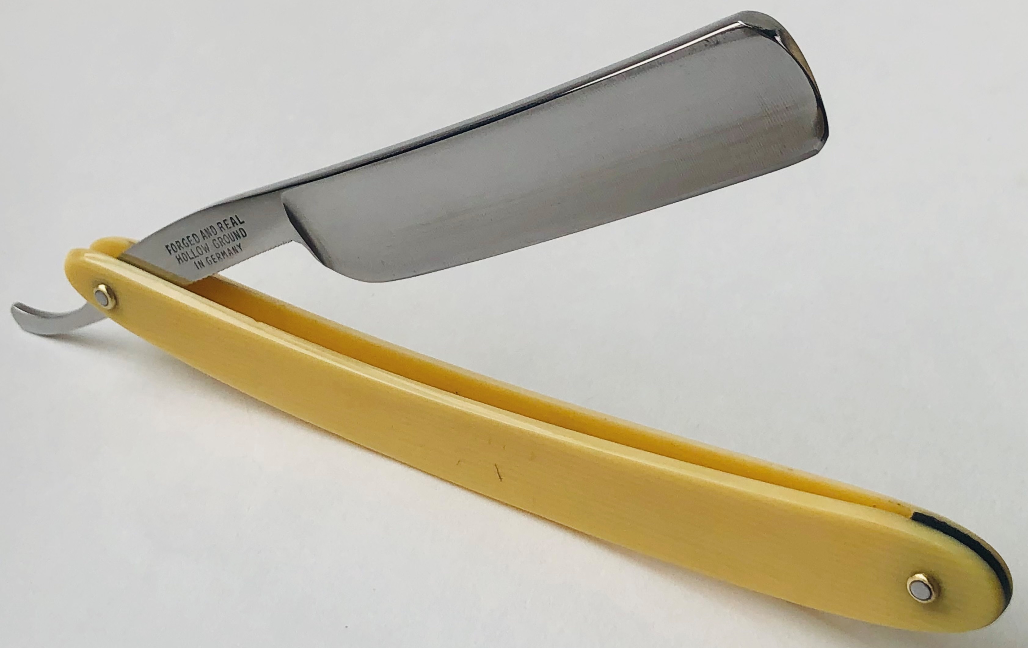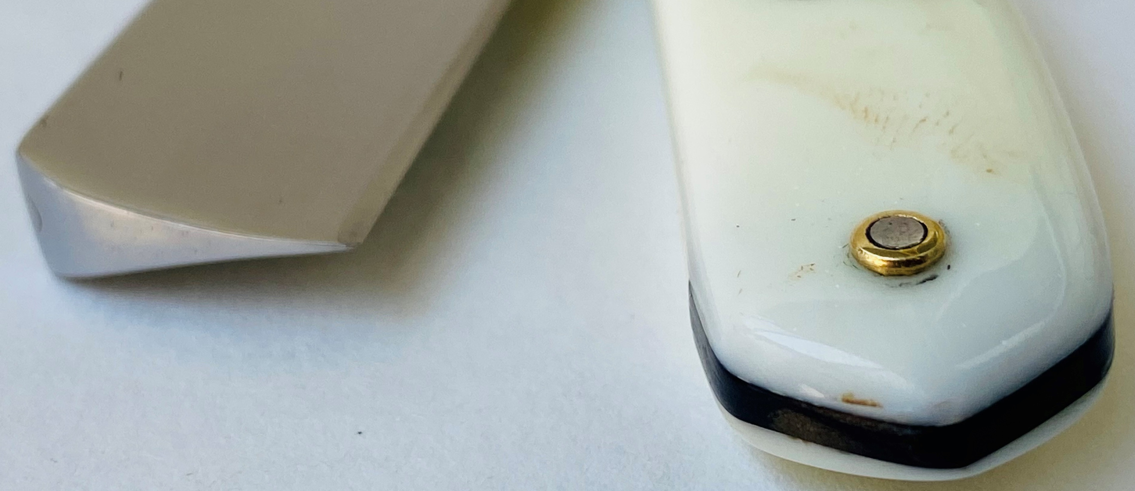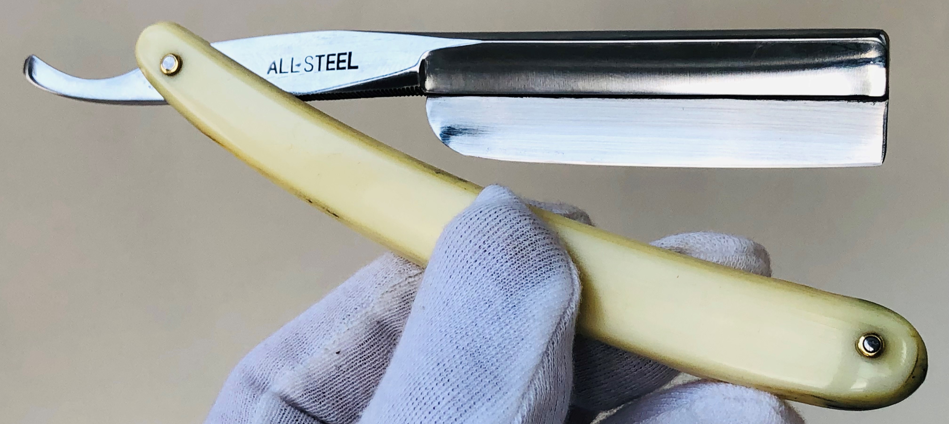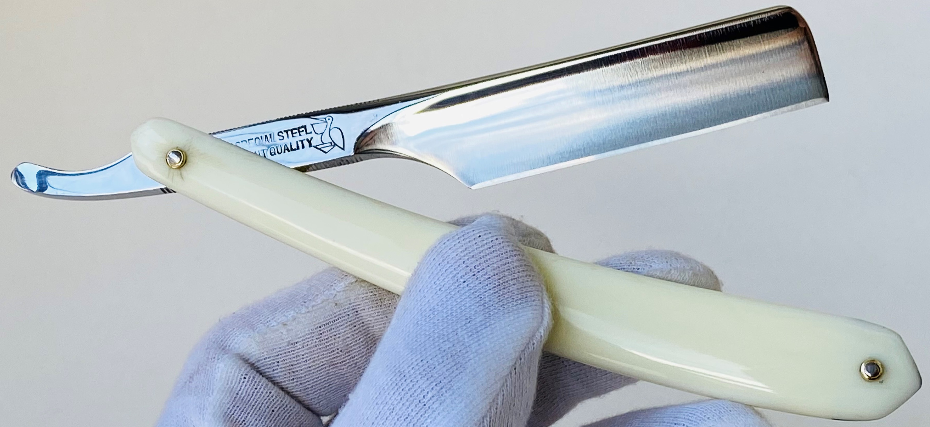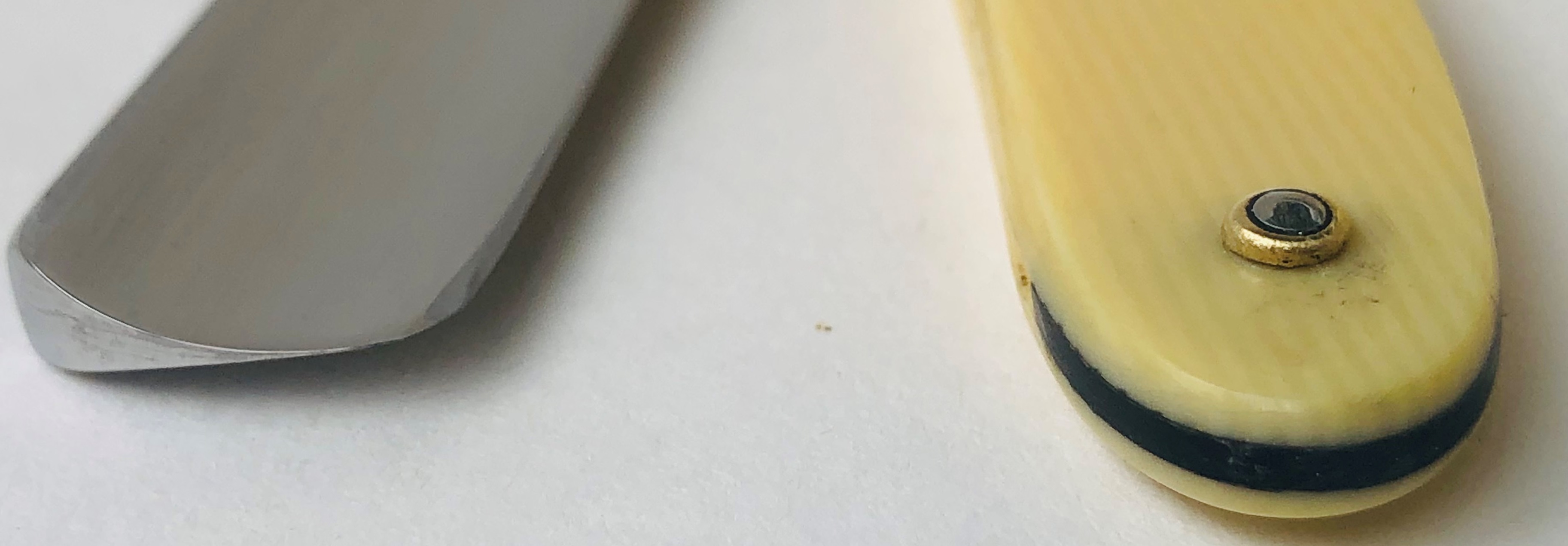 Был у меня старенький клинок,до которого не доходили руки. Древняя бритва, с достаточно значительными "следами времени", в виде патины и каверн. Полотно было по возможности очищено, а на эрле и обушке все оставил как есть, дабы придать бритве естественный, антикварный вид,соответствующий её приличному возрасту.Старую оправу из оргстекла подобрал под размер клинка.Новые втулки и внутренние шайбы. Заточил и лично протестировал. Тут сталь достаточно твердая, так что на первый раз бритьё прошло с элементом агрессии,но все чисто и без раздражения.В общем и целом неплохая и совершенно недорогая бритва,со "следами времени". Заточена и готова к бритью.