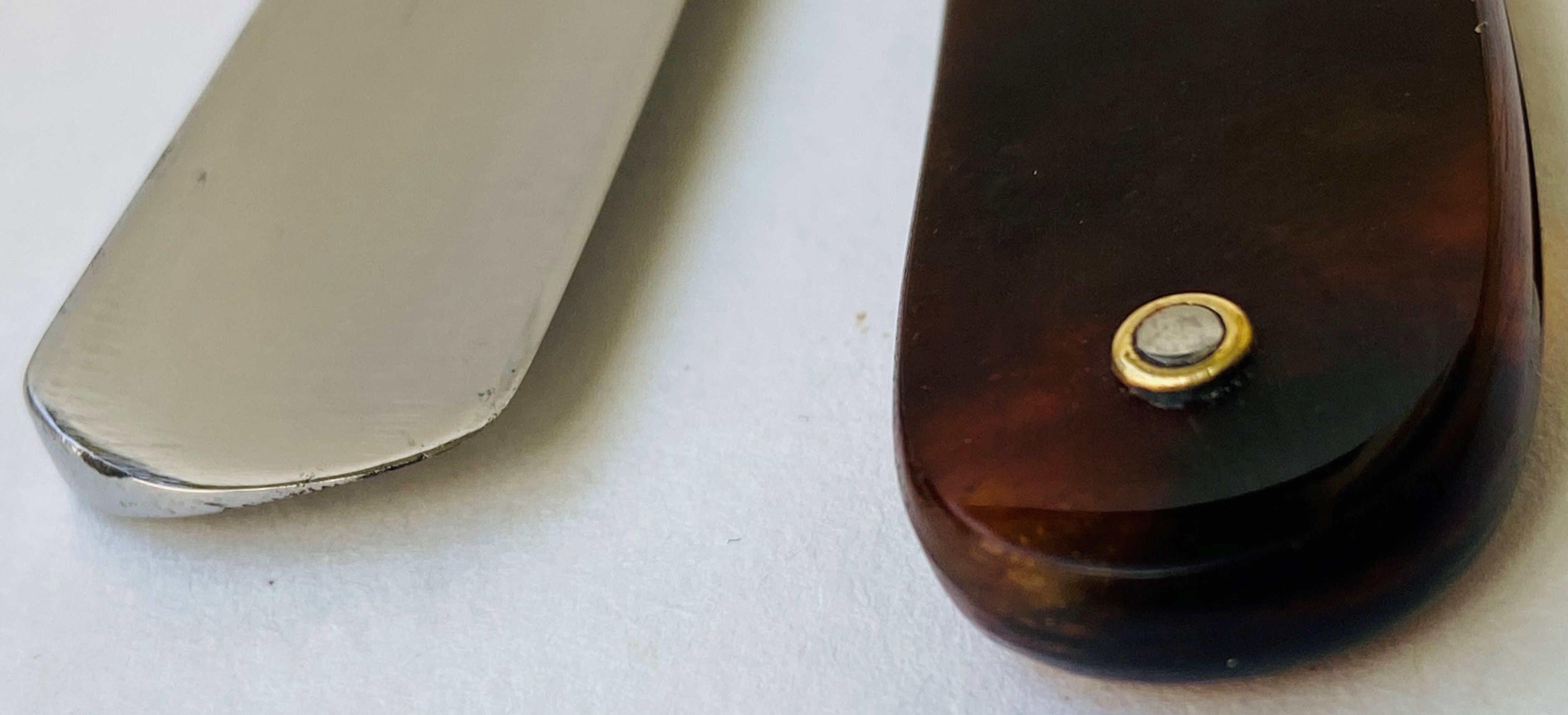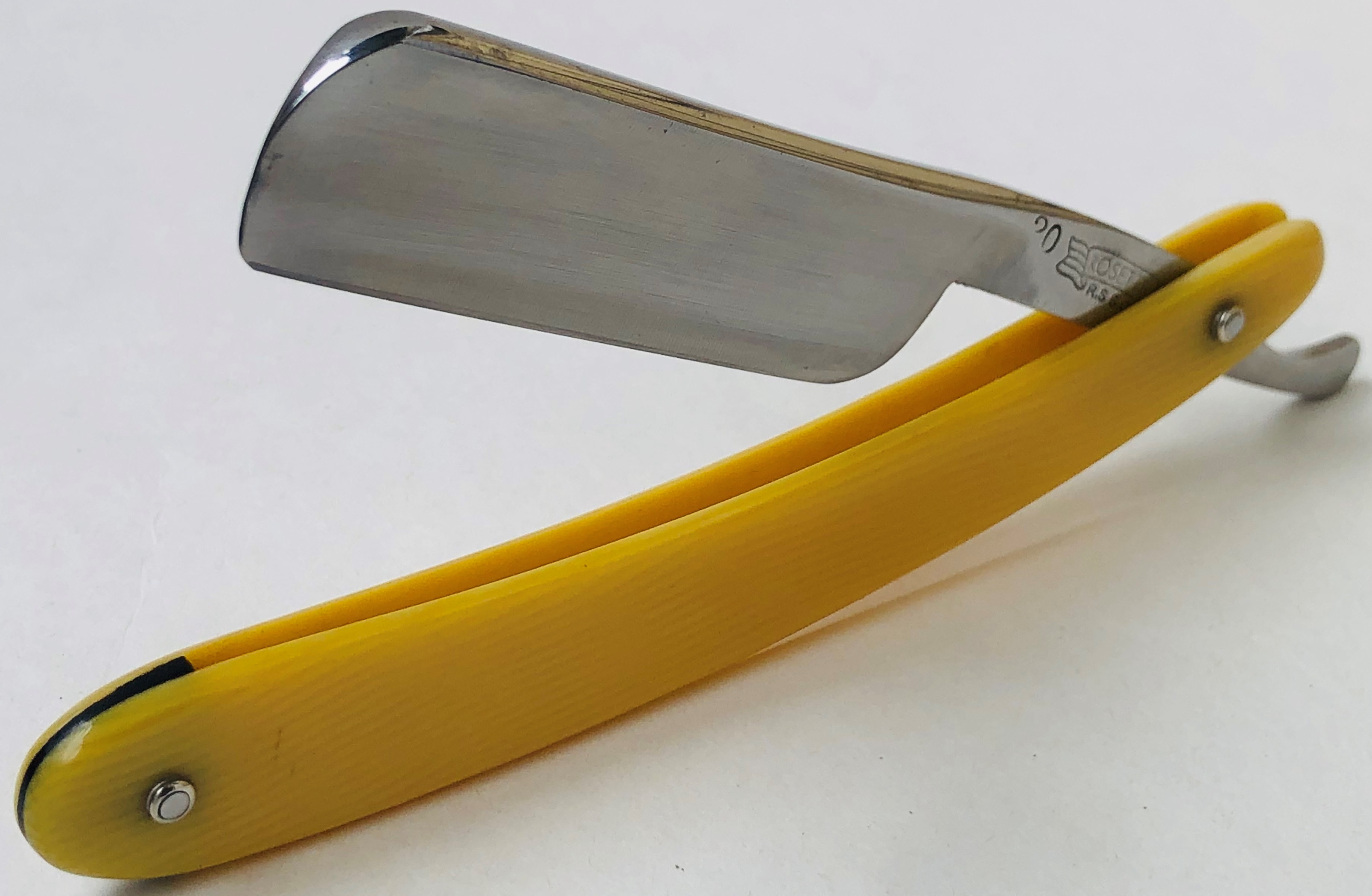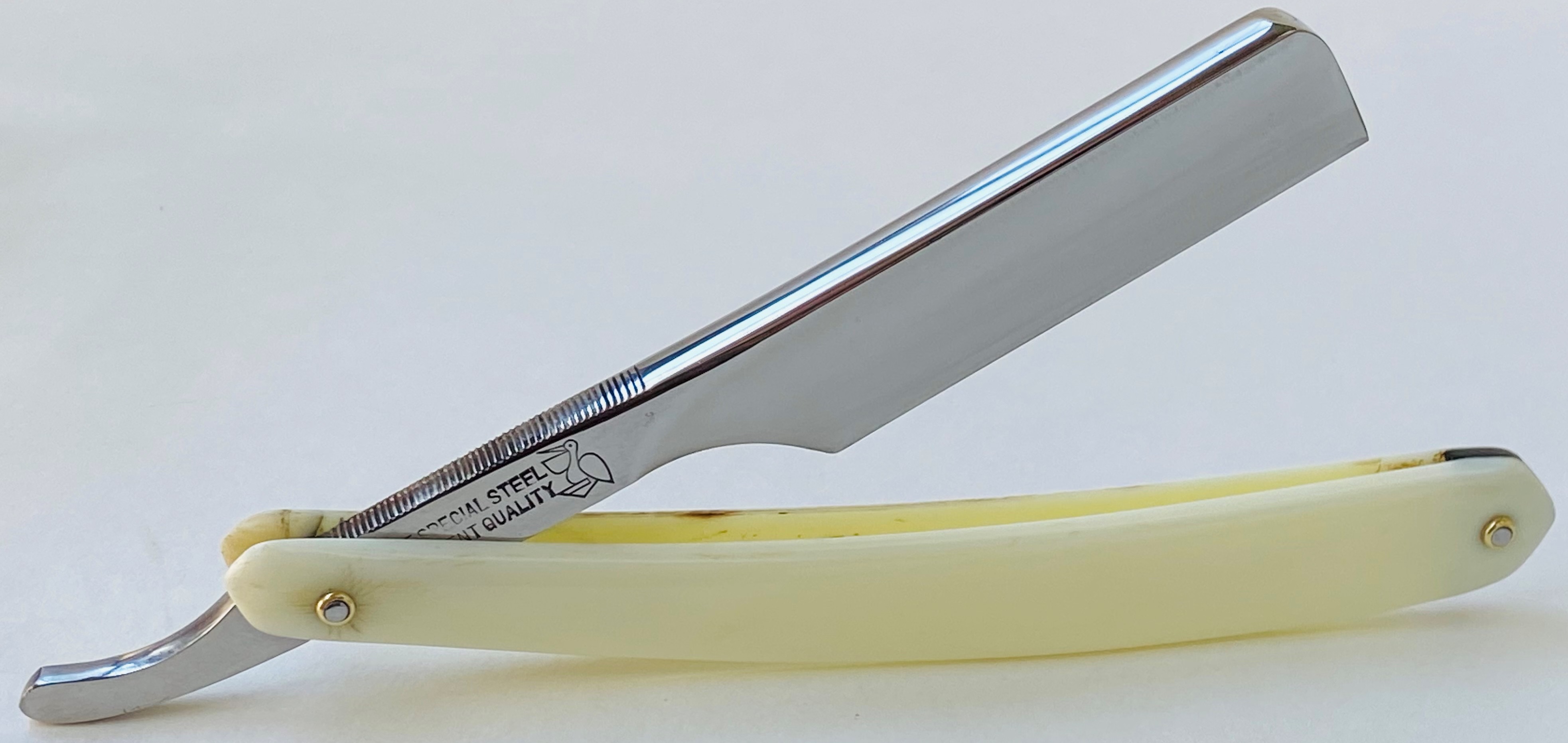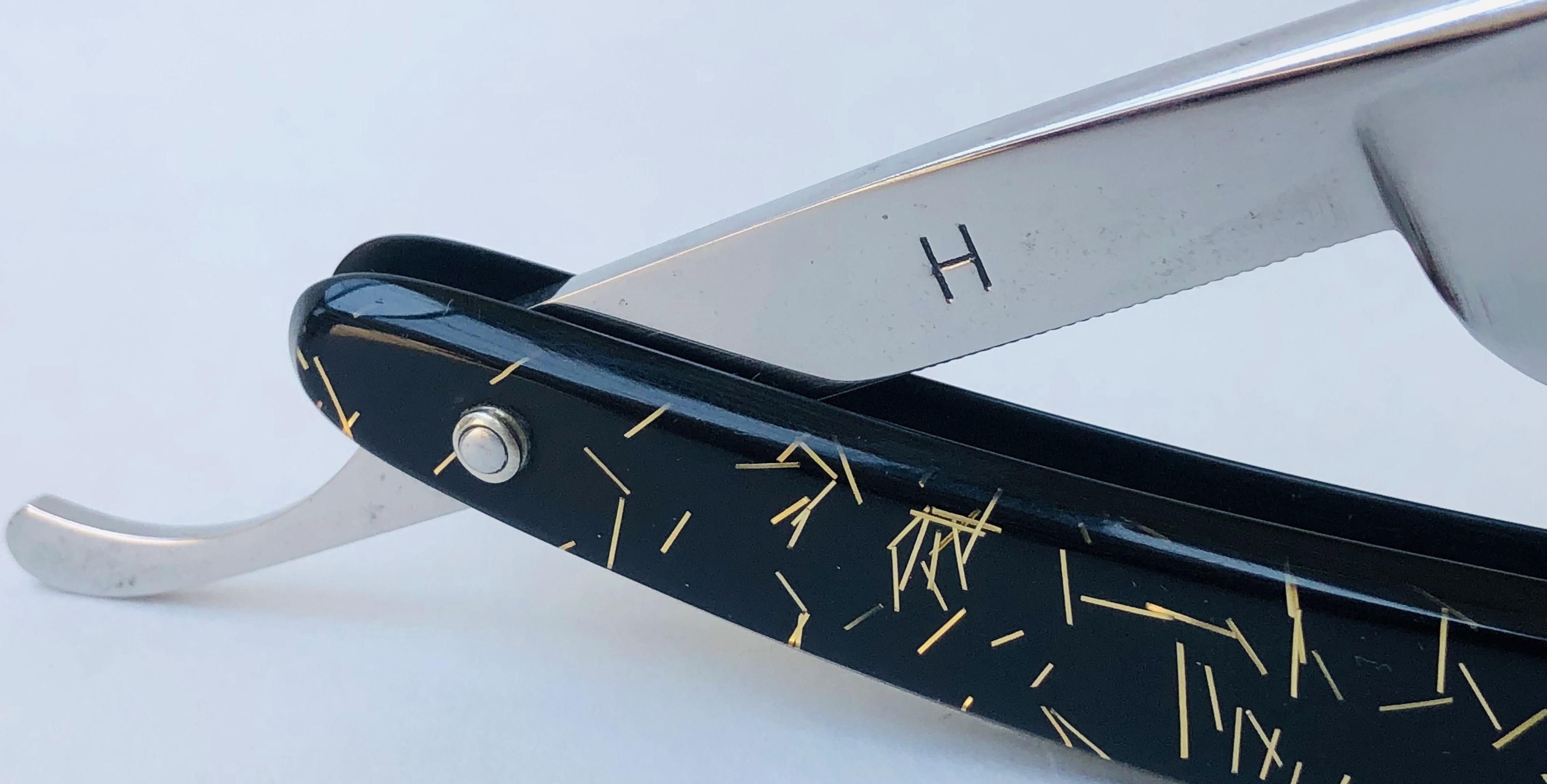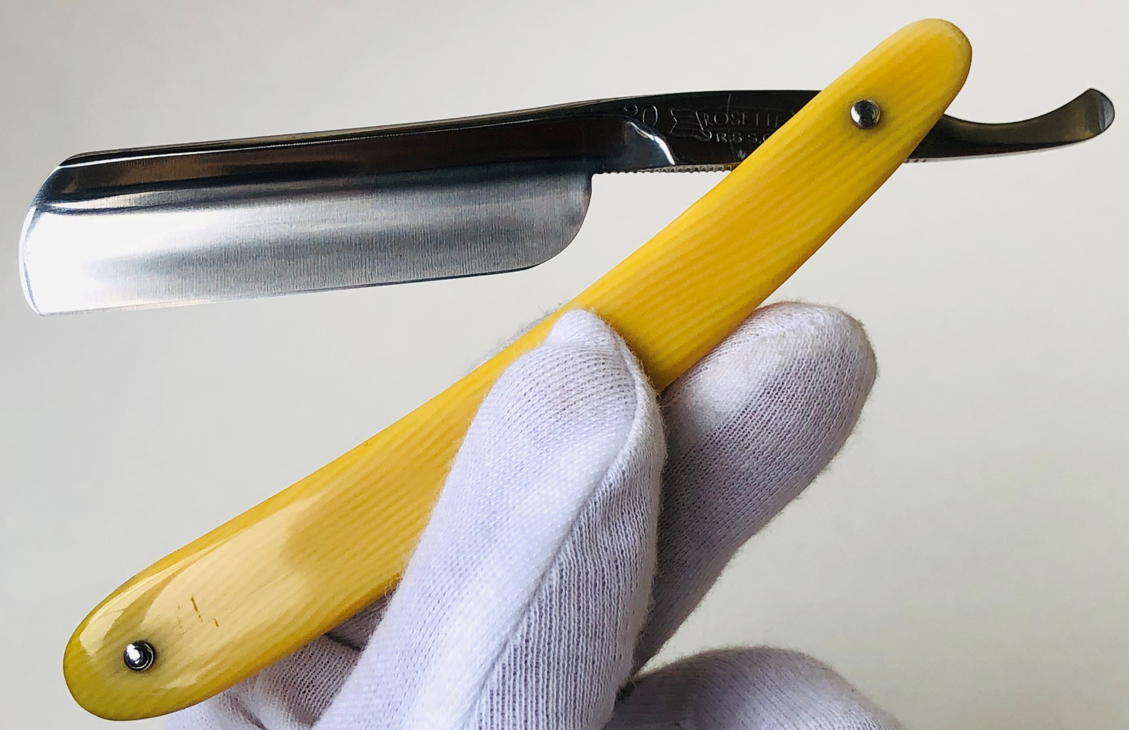 Был у меня старенький клинок,до которого не доходили руки. Древняя бритва, с достаточно значительными "следами времени", в виде патины и каверн. Полотно было по возможности очищено, а на эрле и обушке все оставил как есть, дабы придать бритве естественный, антикварный вид,соответствующий её приличному возрасту.Старую оправу из оргстекла подобрал под размер клинка.Новые втулки и внутренние шайбы. Заточил и лично протестировал. Тут сталь достаточно твердая, так что на первый раз бритьё прошло с элементом агрессии,но все чисто и без раздражения.В общем и целом неплохая и совершенно недорогая бритва,со "следами времени". Заточена и готова к бритью.