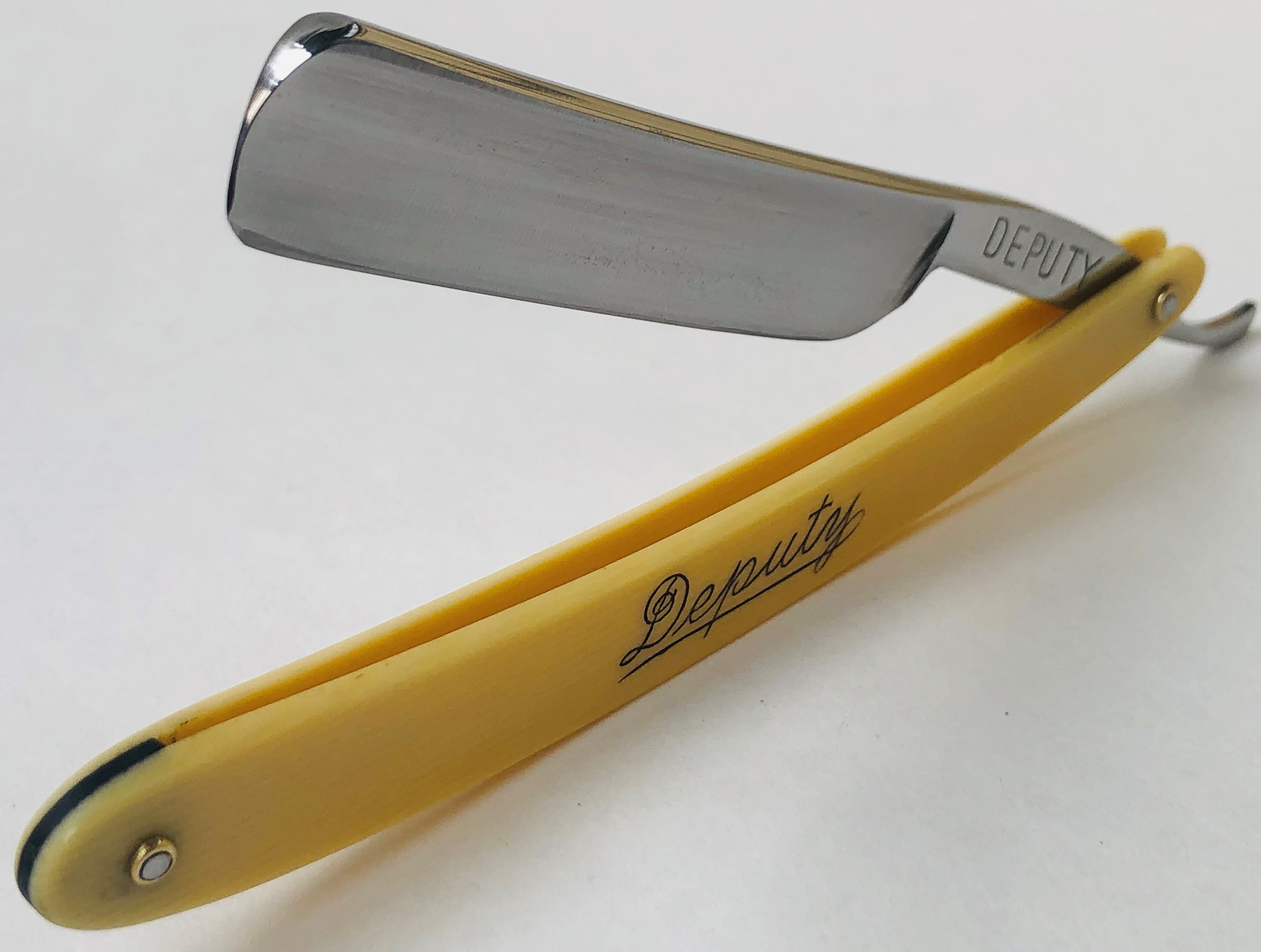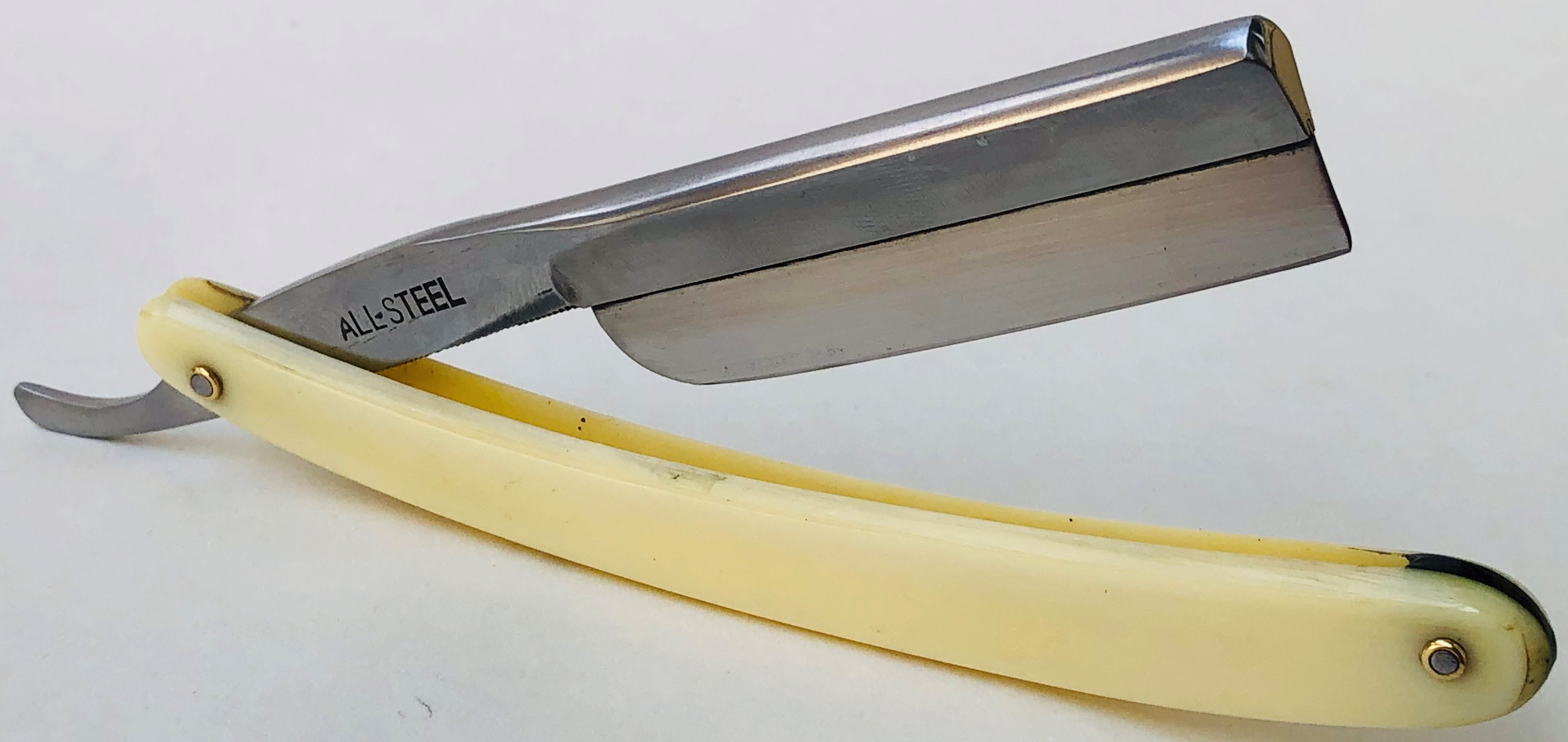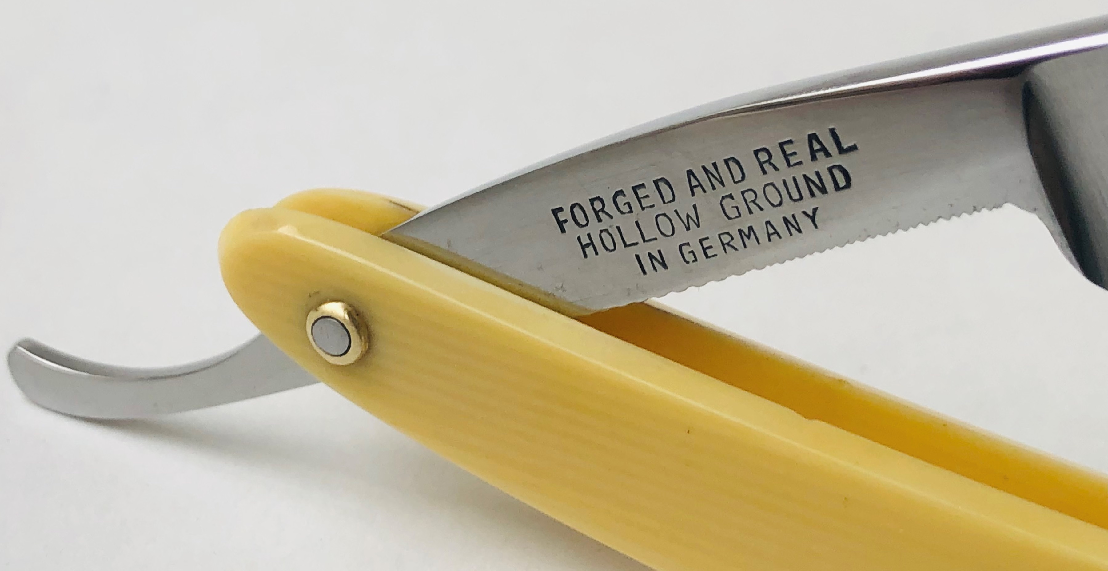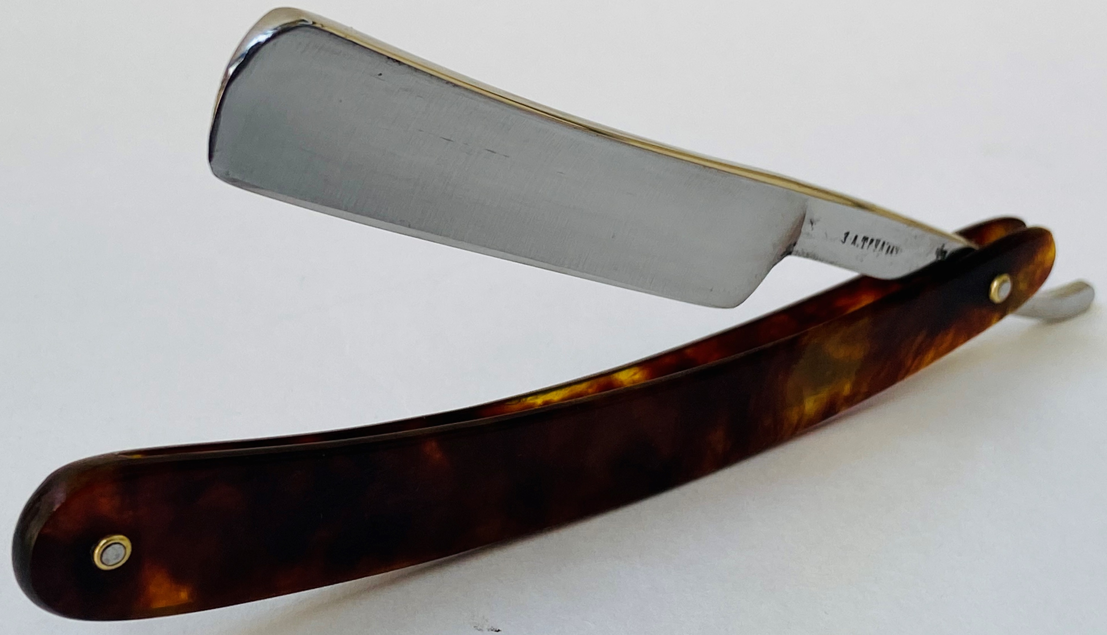 Был у меня старенький клинок,до которого не доходили руки. Древняя бритва, с достаточно значительными "следами времени", в виде патины и каверн. Полотно было по возможности очищено, а на эрле и обушке все оставил как есть, дабы придать бритве естественный, антикварный вид,соответствующий её приличному возрасту.Старую оправу из оргстекла подобрал под размер клинка.Новые втулки и внутренние шайбы. Заточил и лично протестировал. Тут сталь достаточно твердая, так что на первый раз бритьё прошло с элементом агрессии,но все чисто и без раздражения.В общем и целом неплохая и совершенно недорогая бритва,со "следами времени". Заточена и готова к бритью.