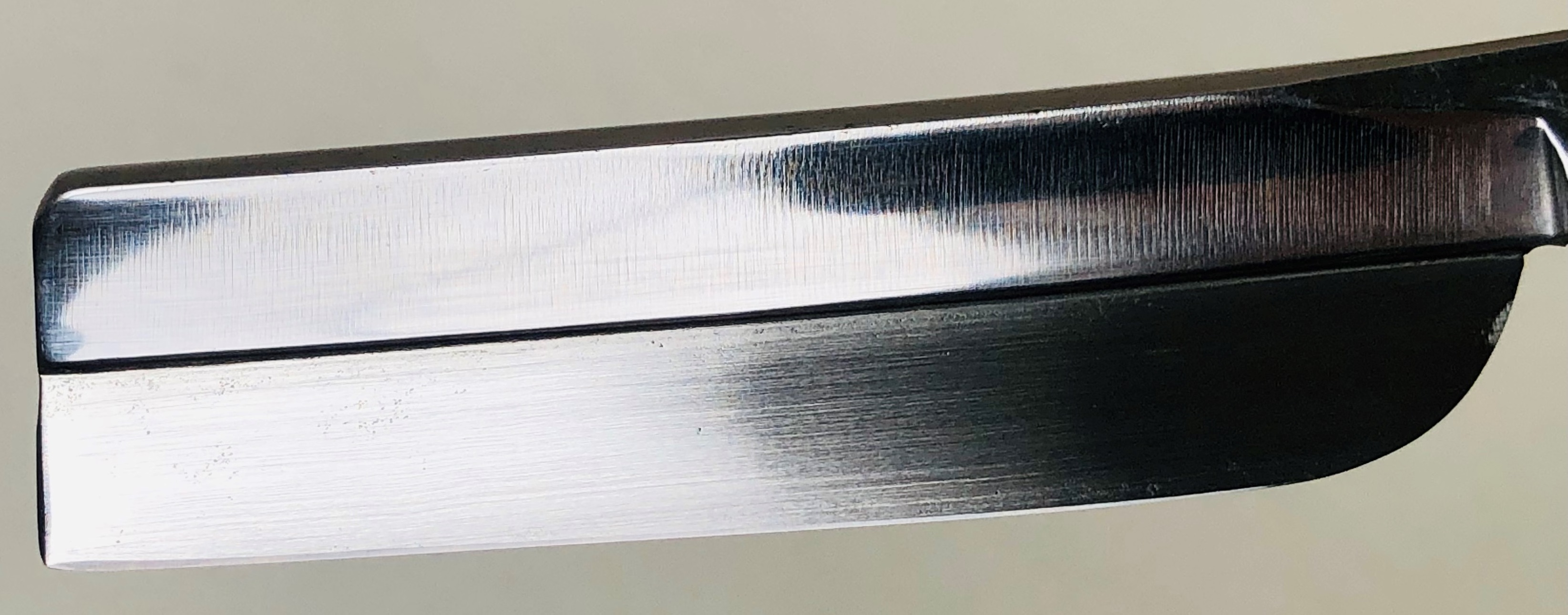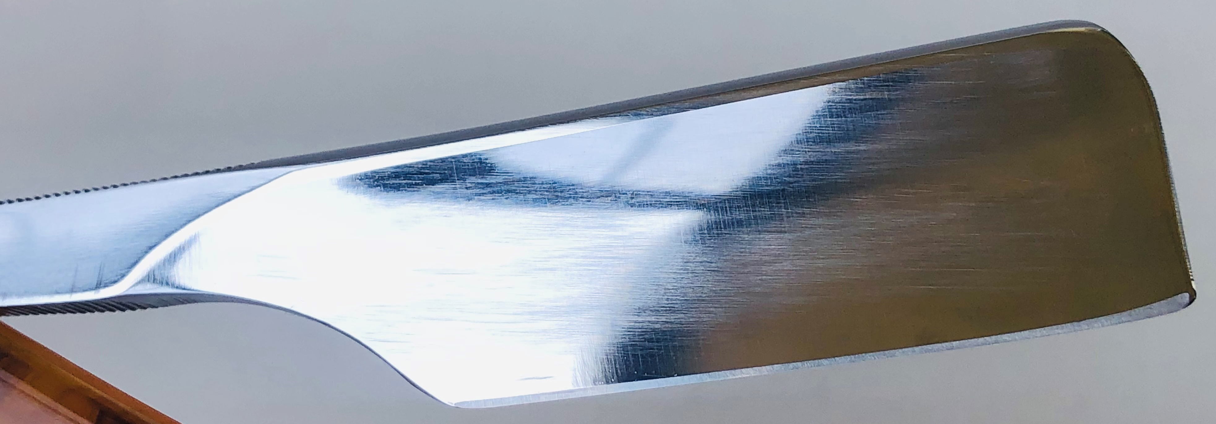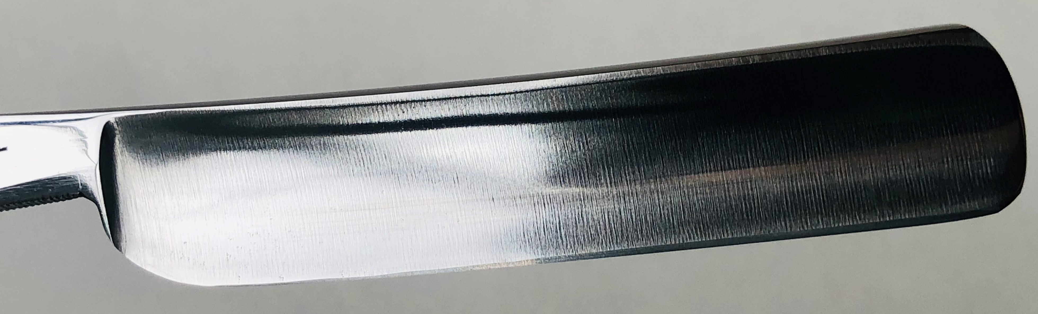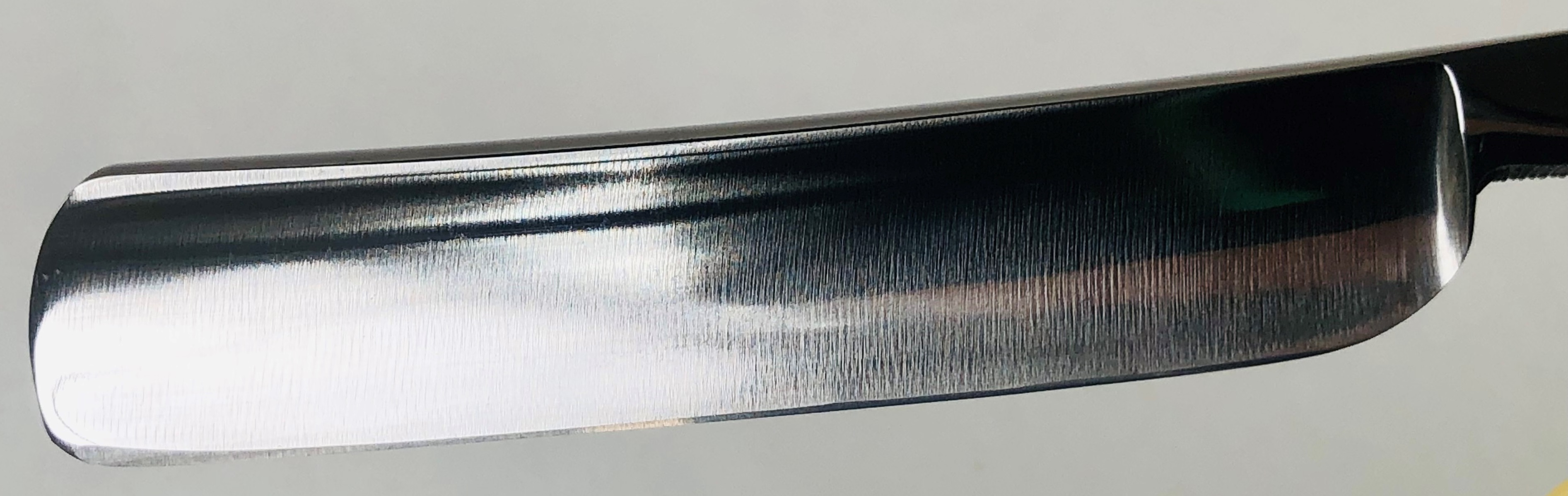 Бритва скорее всего в пользовании не была, но потребовались минимальные ,косметические работы.Умеренная,комбинированная продольно-поперечная шлифовка и умеренная полировка. Идеальная геометрия клинка:кромочка равномерна по всей длине. Новые втулки и внутренние шайбы. Бритва заточена и готова к бритью.