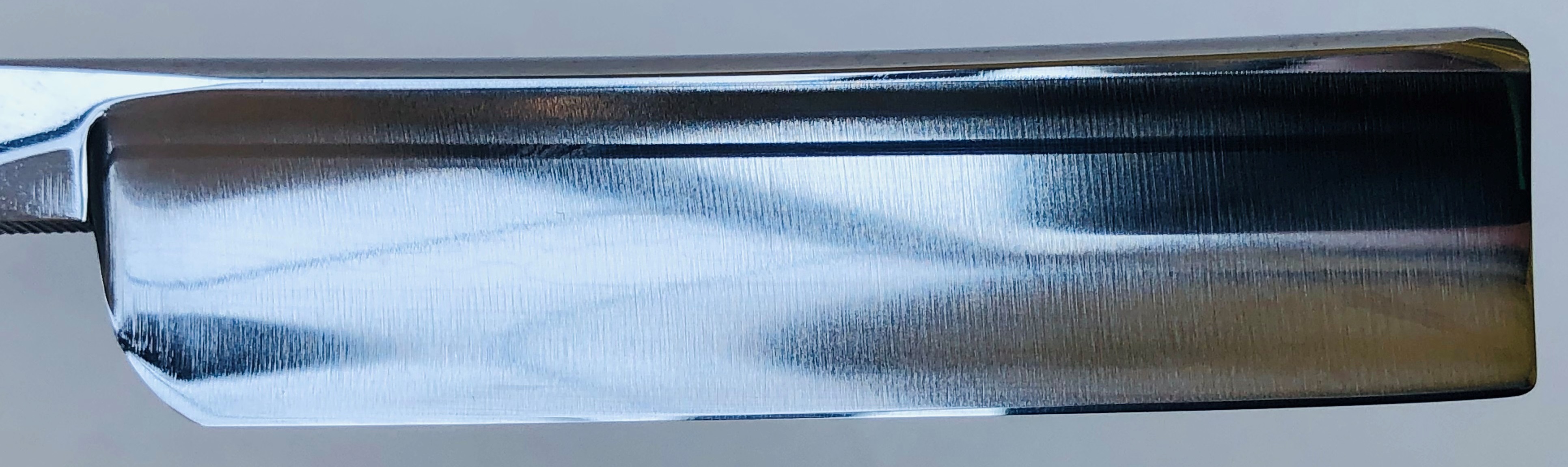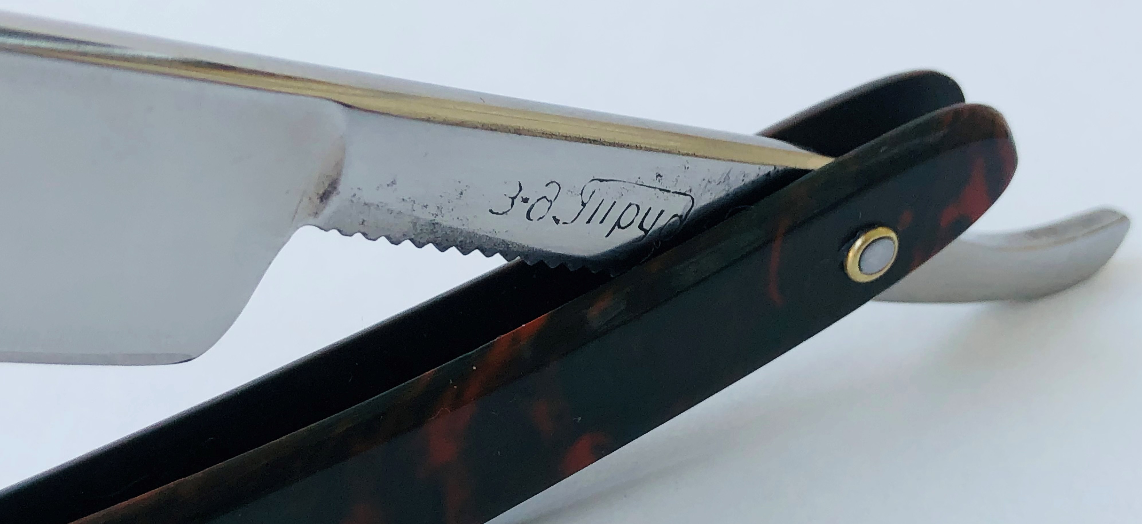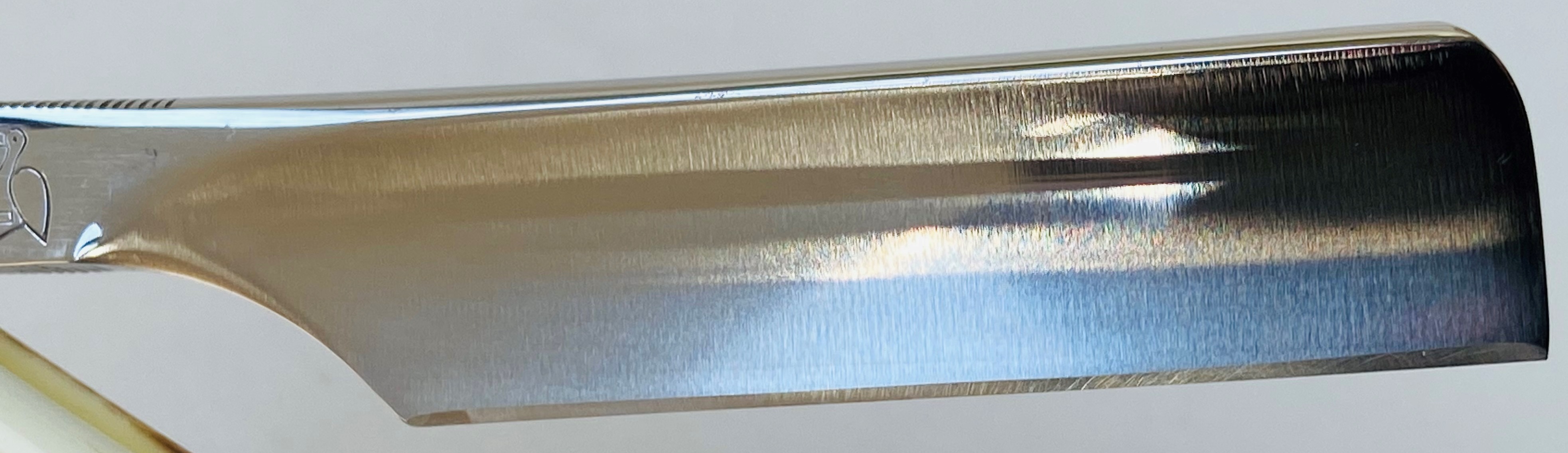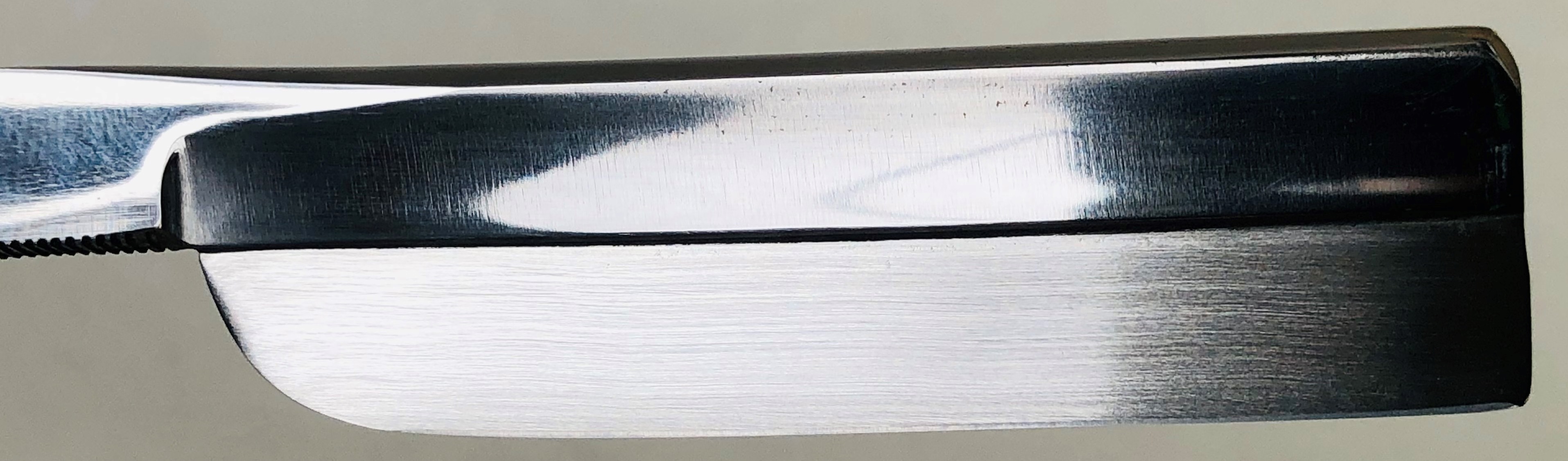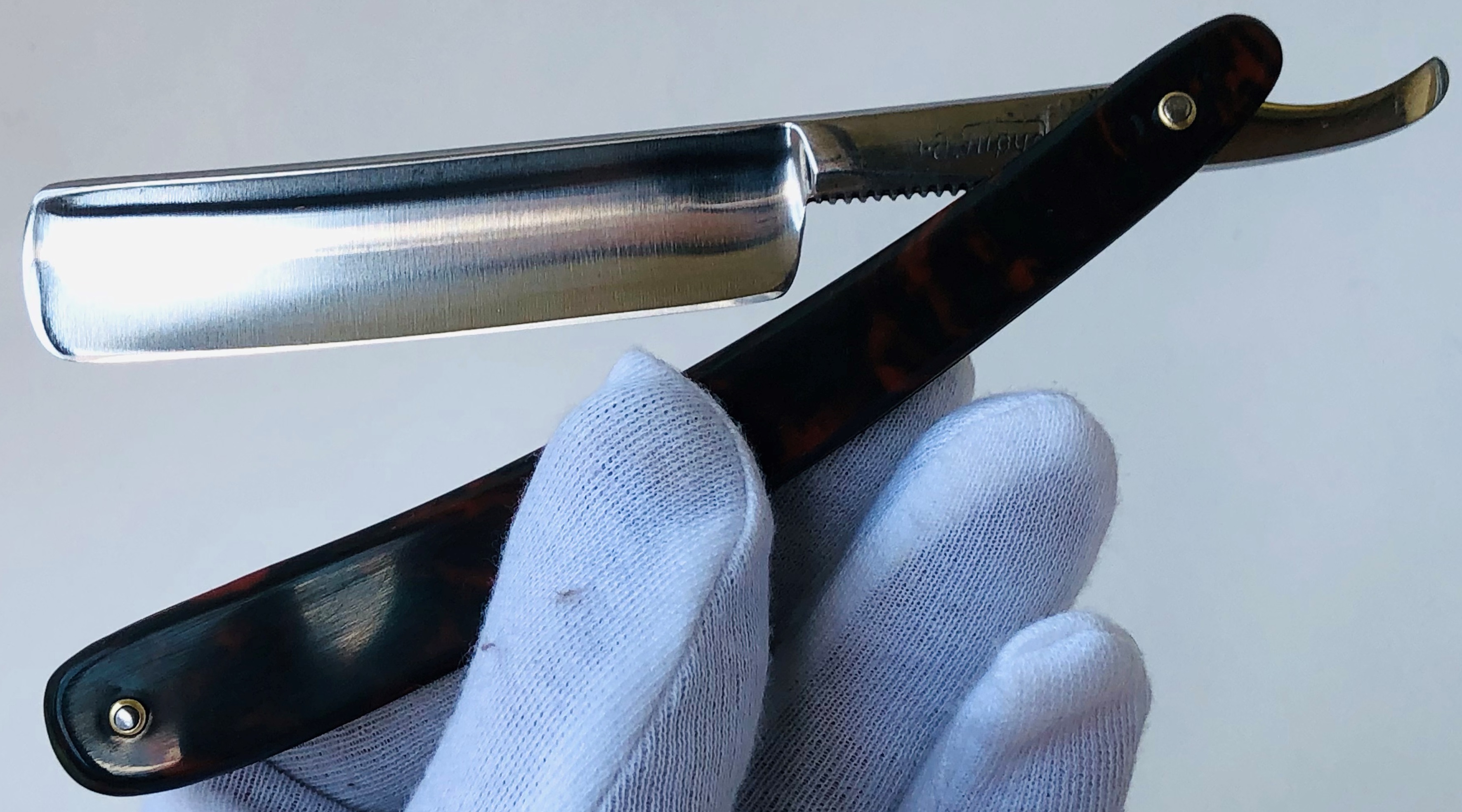 Бритва по всей видимости в пользовании не была, но требовала минимальных, косметических работ.Комбинированная продольно-поперечная шлифовка и умеренная полировка. Идеальная геометрия клинка:кромочка равномерна по всей длине и еле заметна.Тяжёлая, мощная,красивая и эффектная бритва, так что не пропустите.