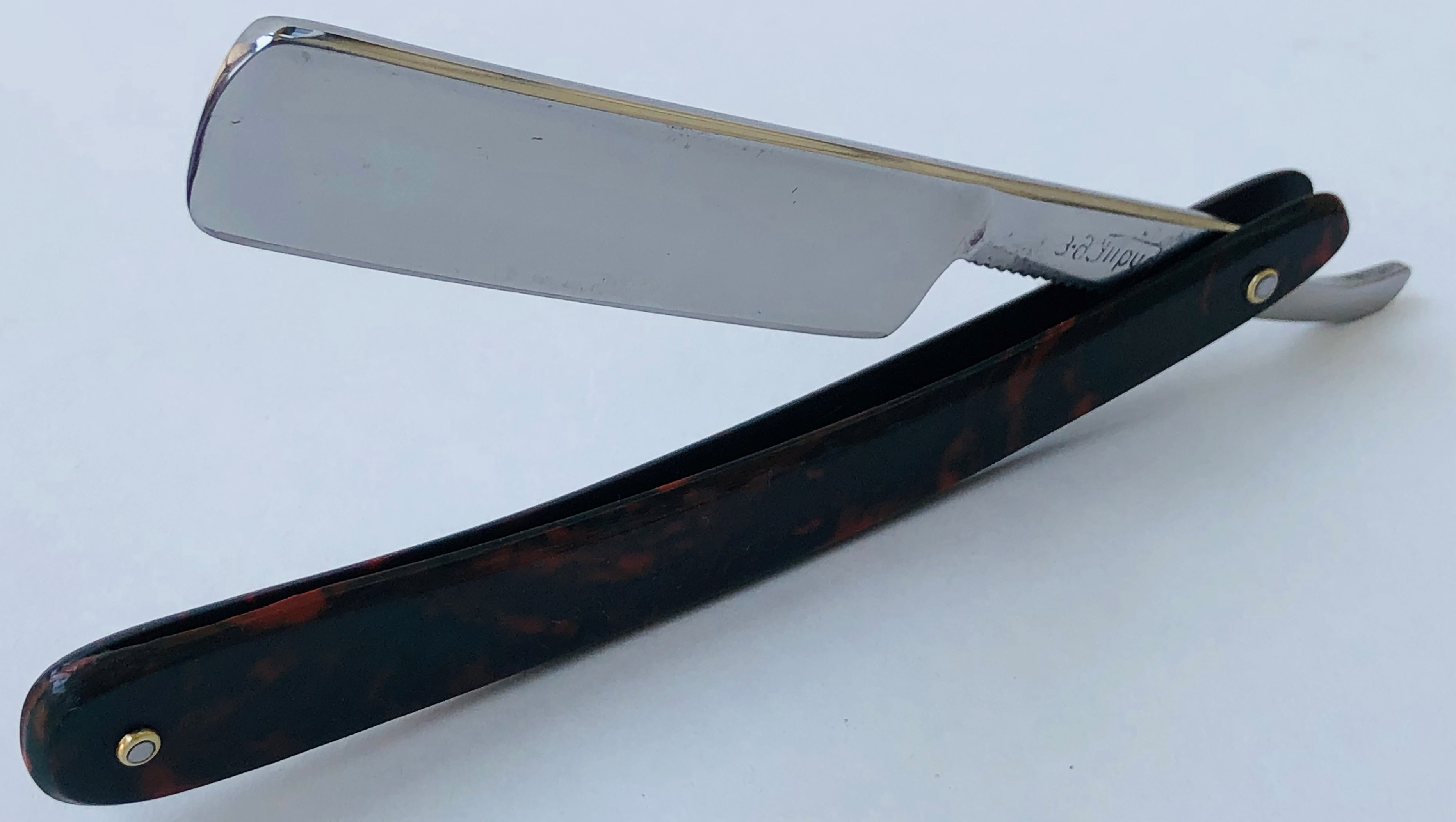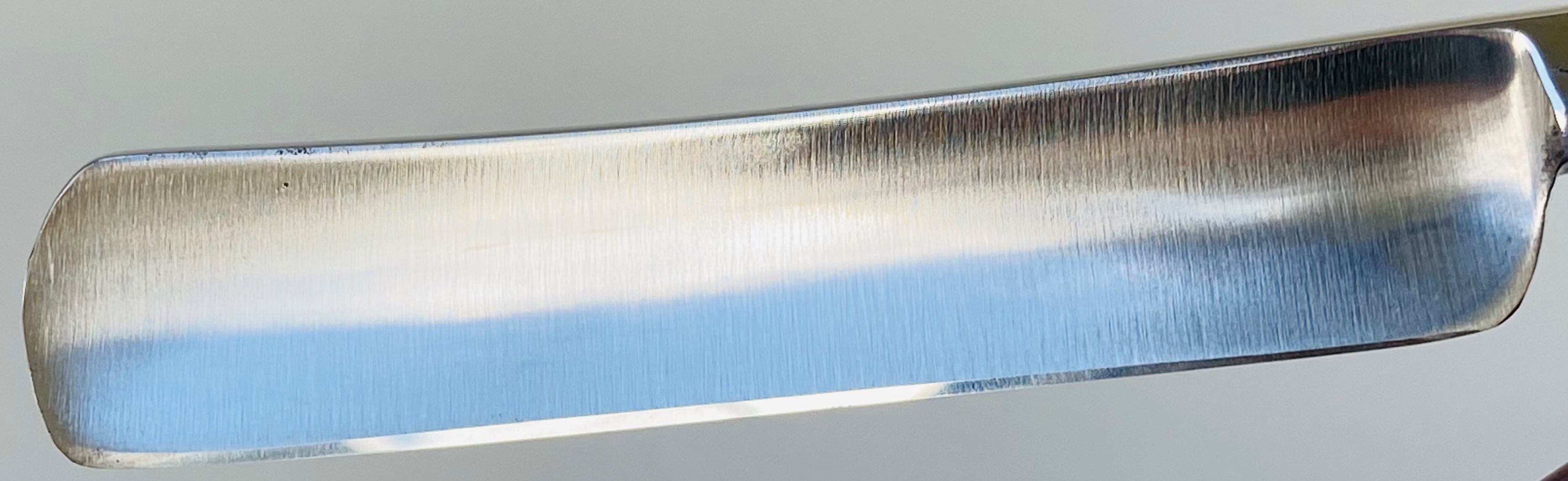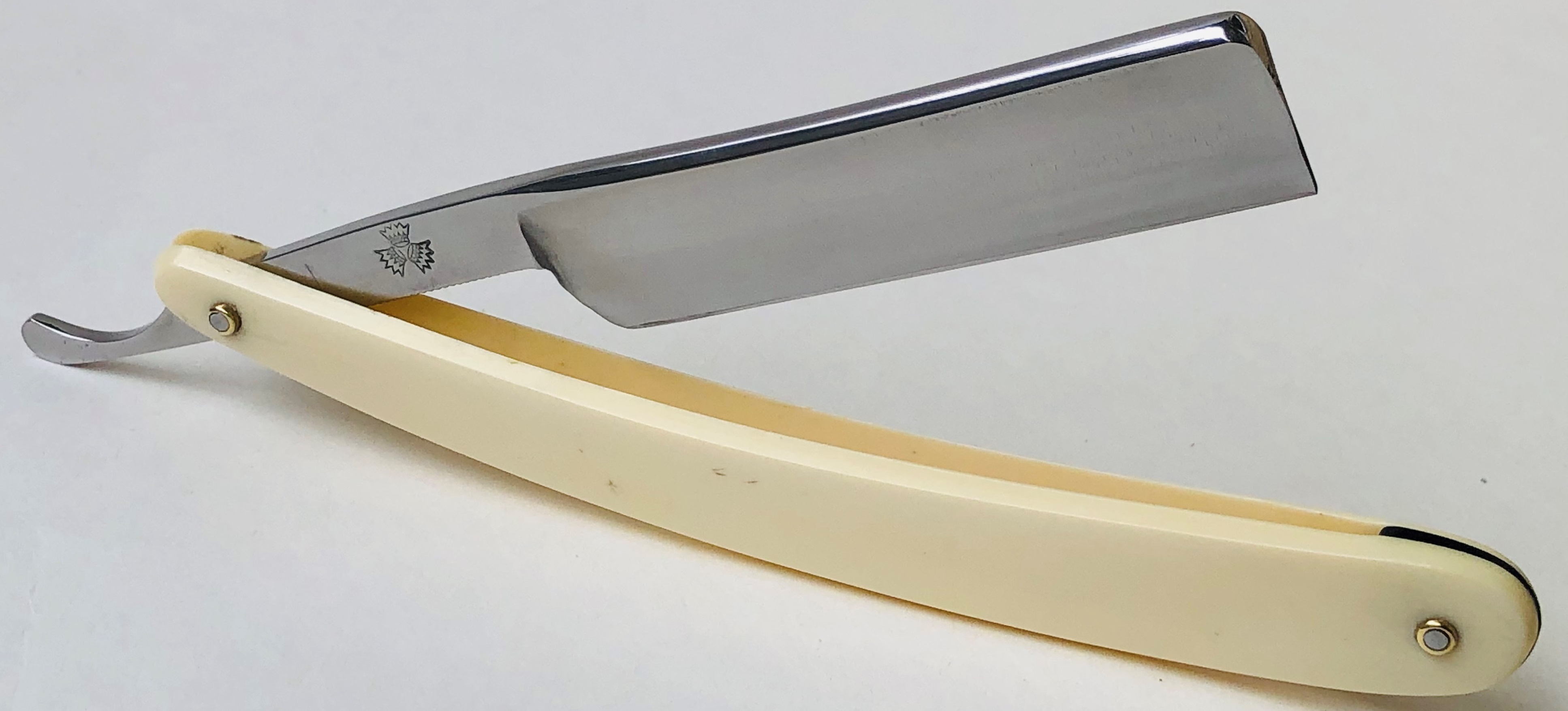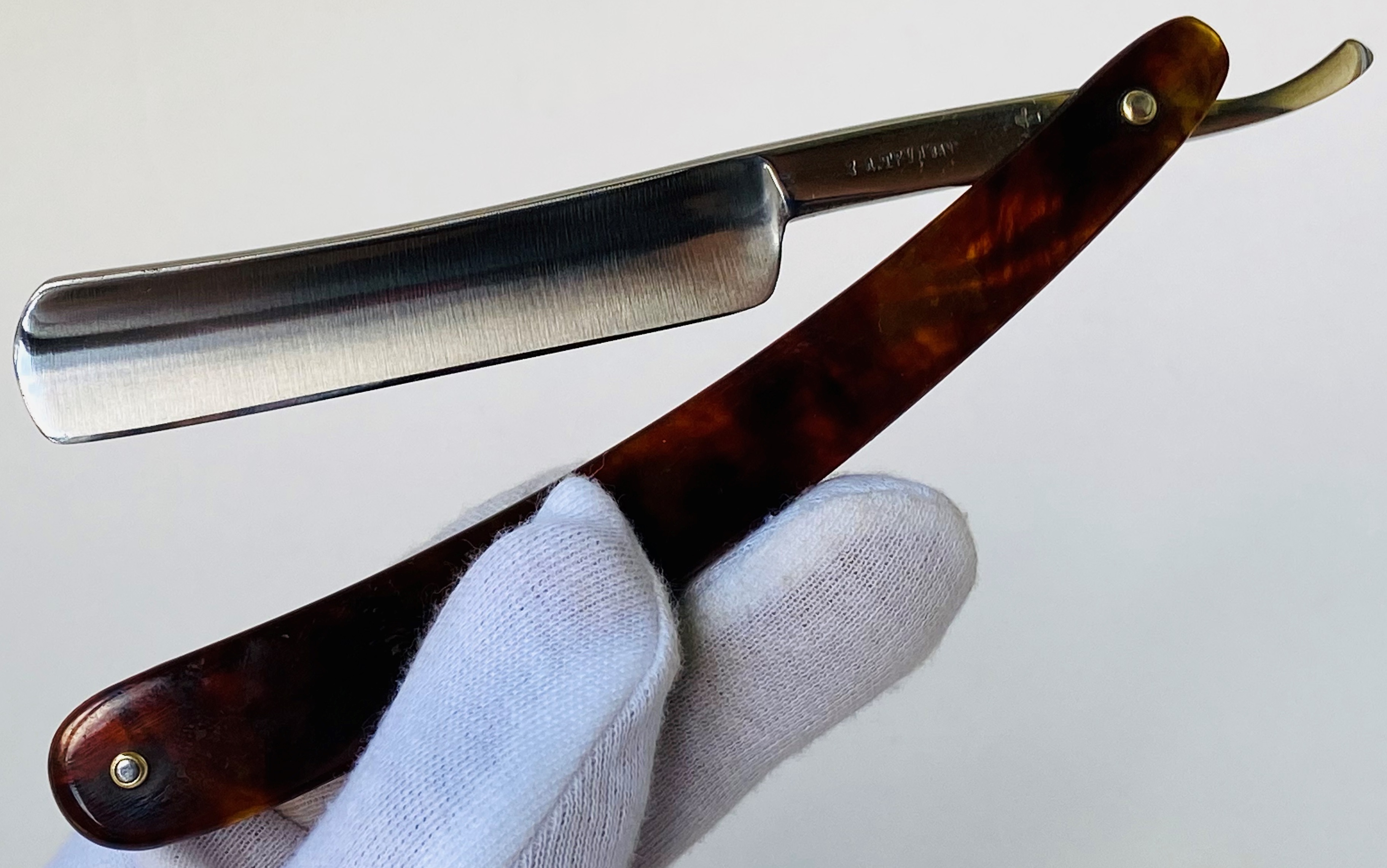 В хорошем, пользованном состоянии.Была разобрана для приведения клинка в порядок. Бритва хоть старенькая и пользованная, но по ширине полотна не потеряла.Умеренная шлифовка и полировка.Кромочка равномерна по всей длине.Новые втулки и внутренние шайбы. Родная мощная оправа имели трещину у нижнего пина, которая была удачно и надёжно проклеена с обеих сторон.Бритва будет очень удобна новичкам в плане формы лезвия и достаточного веса. Заточена и готова к бритью.