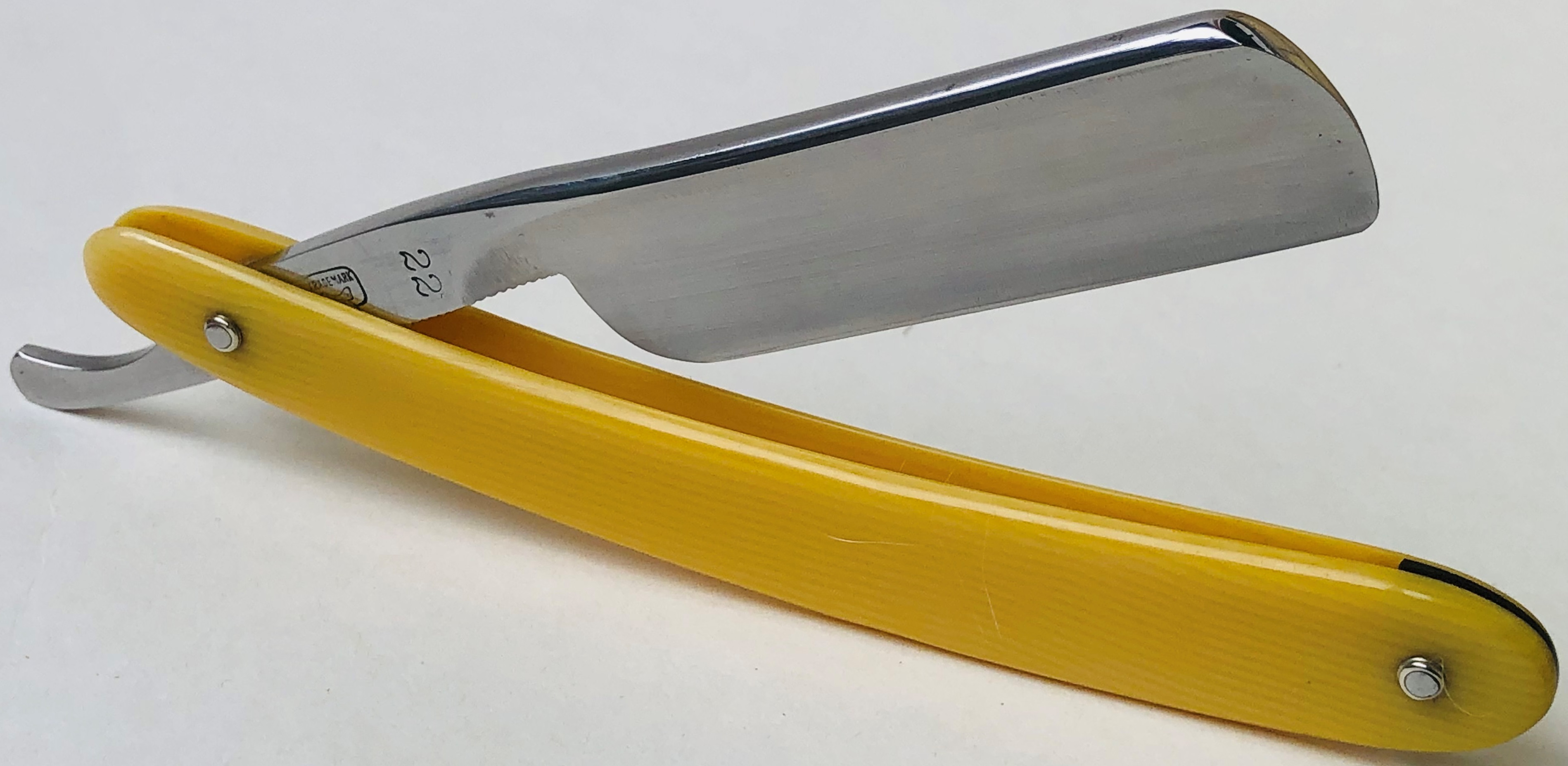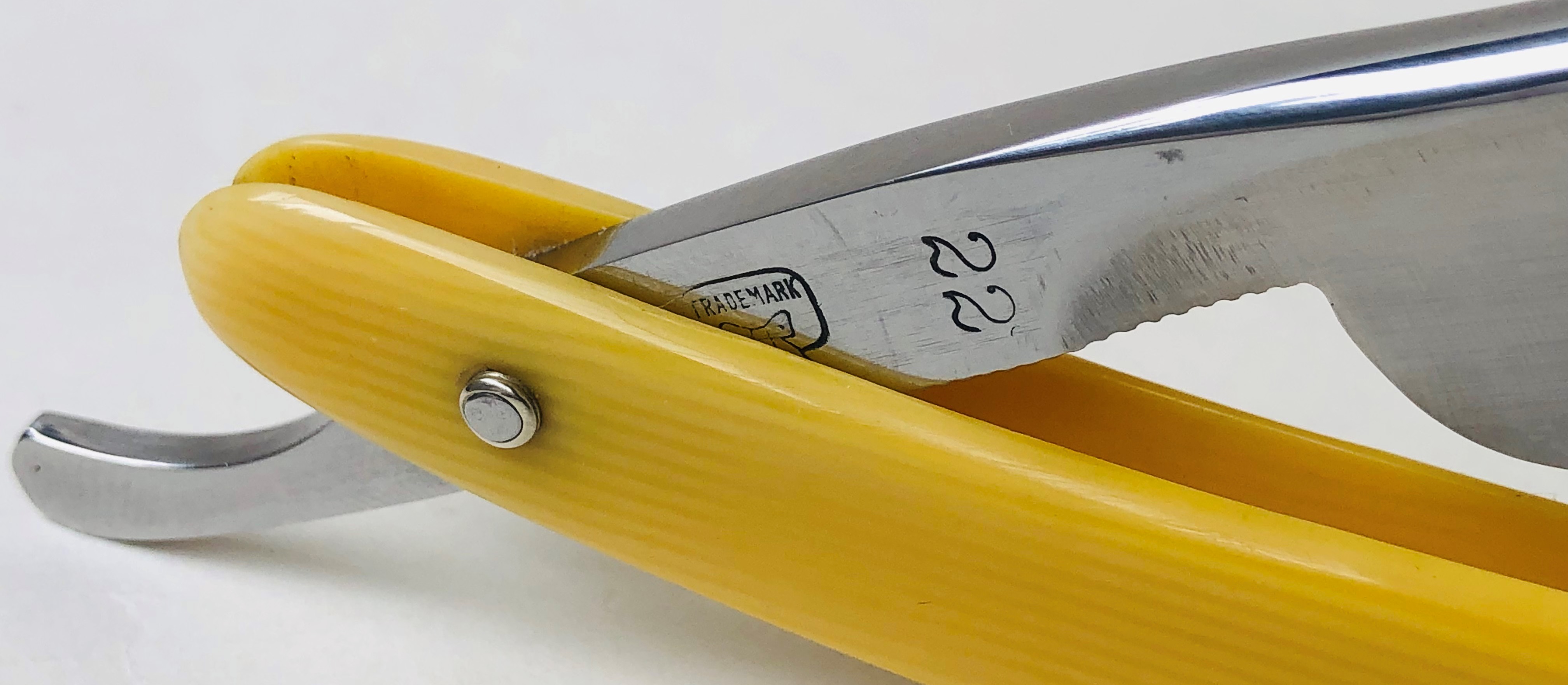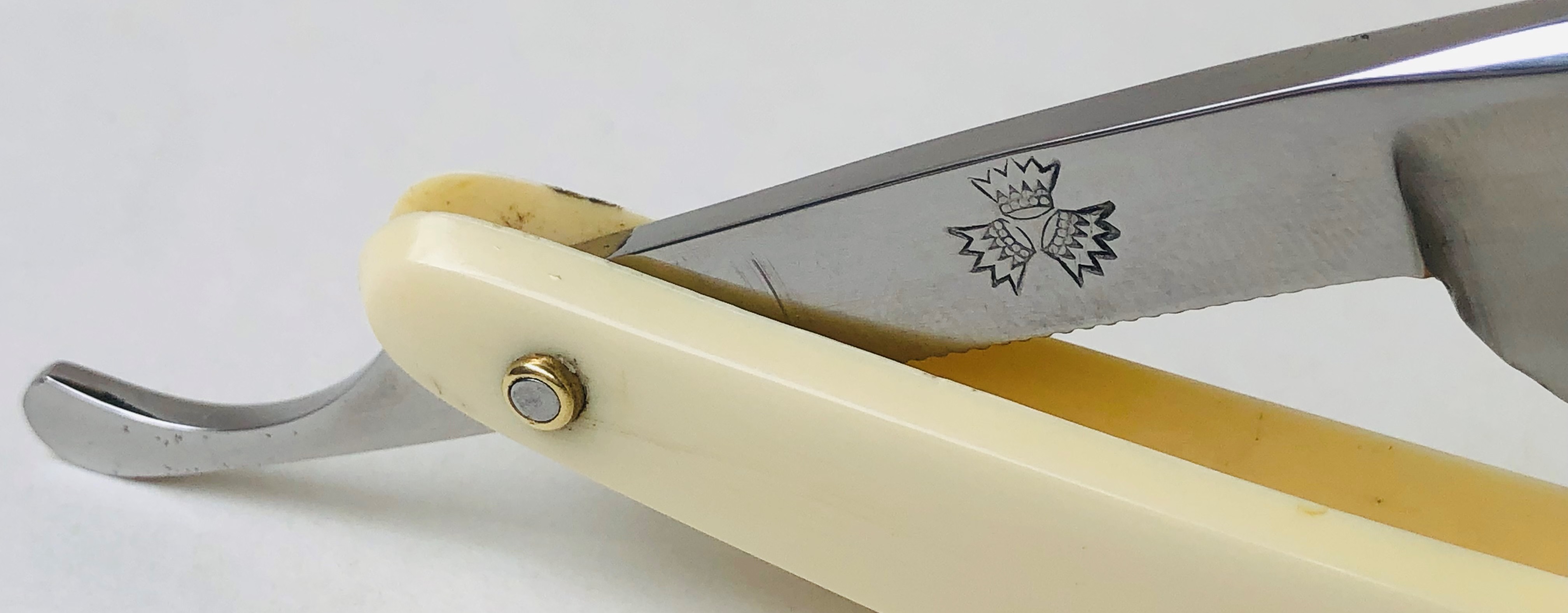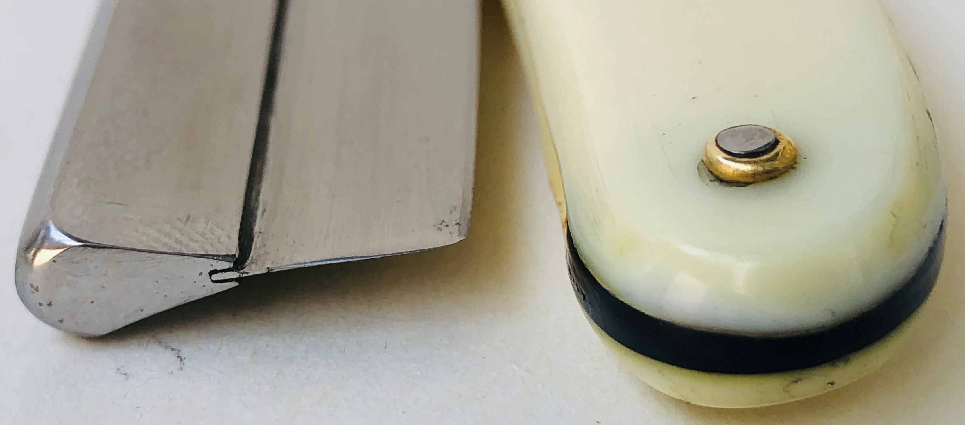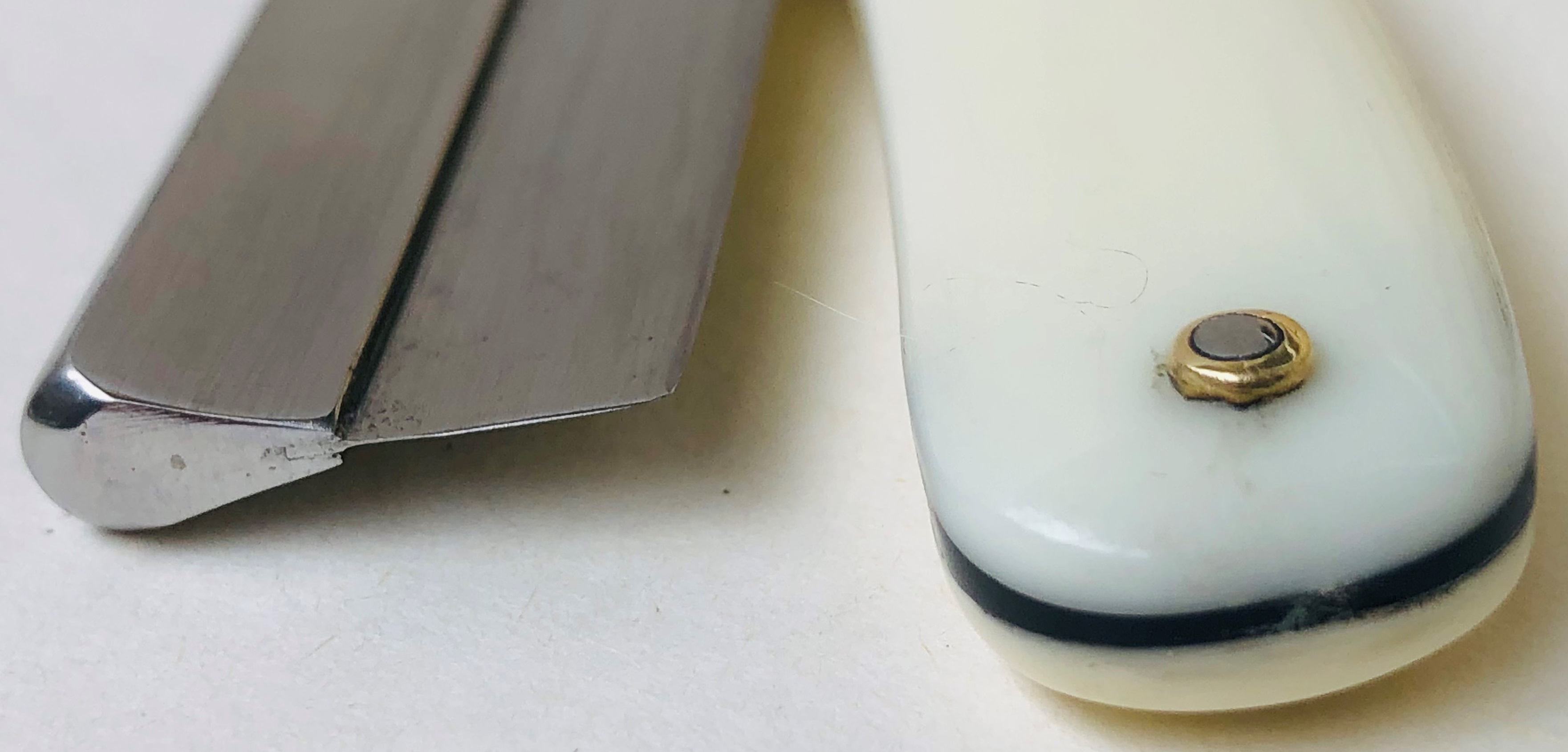 В хорошем, пользованном состоянии.Была разобрана для приведения клинка в порядок. Бритва хоть старенькая и пользованная, но по ширине полотна не потеряла.Умеренная шлифовка и полировка.Кромочка равномерна по всей длине.Новые втулки и внутренние шайбы. Родная мощная оправа имели трещину у нижнего пина, которая была удачно и надёжно проклеена с обеих сторон.Бритва будет очень удобна новичкам в плане формы лезвия и достаточного веса. Заточена и готова к бритью.