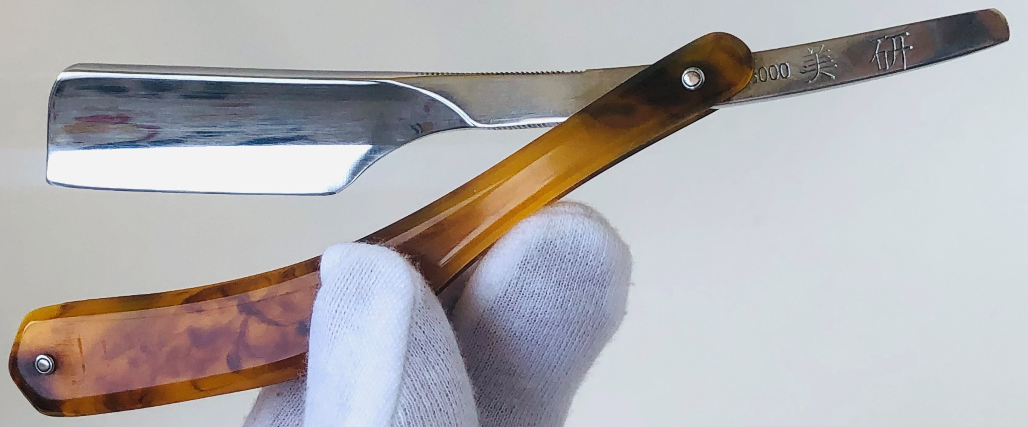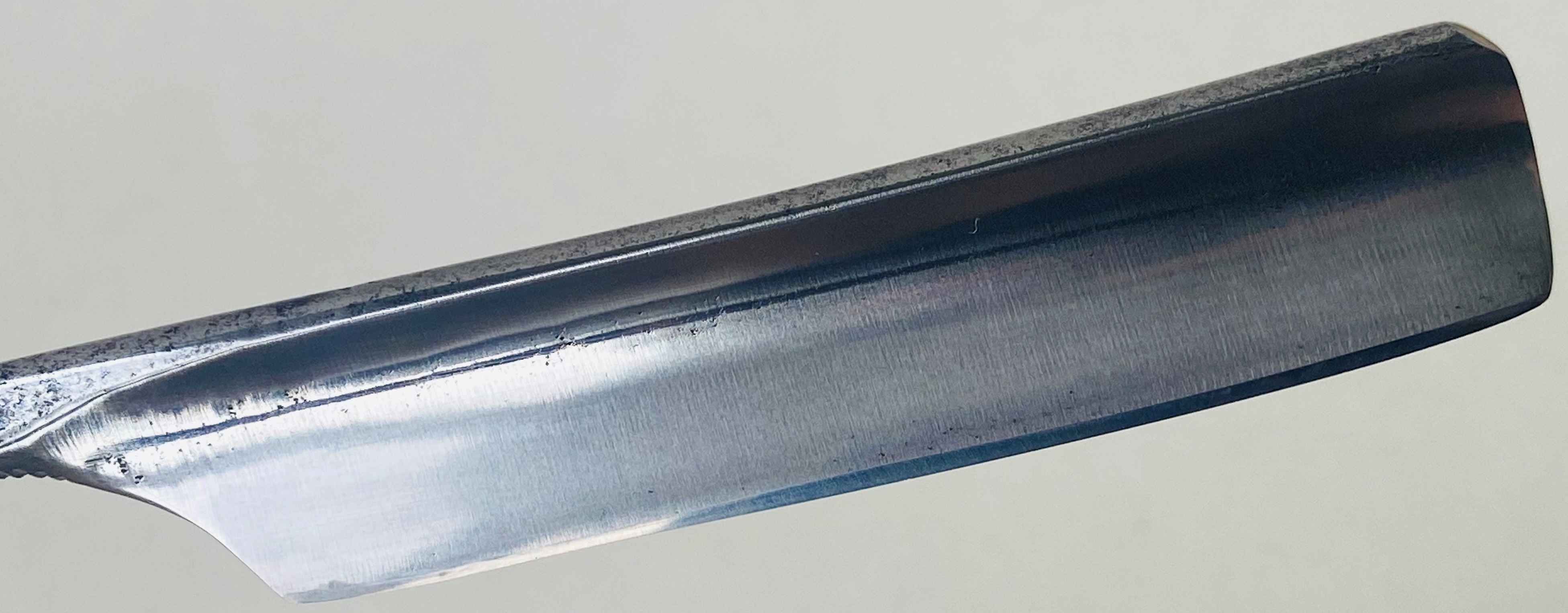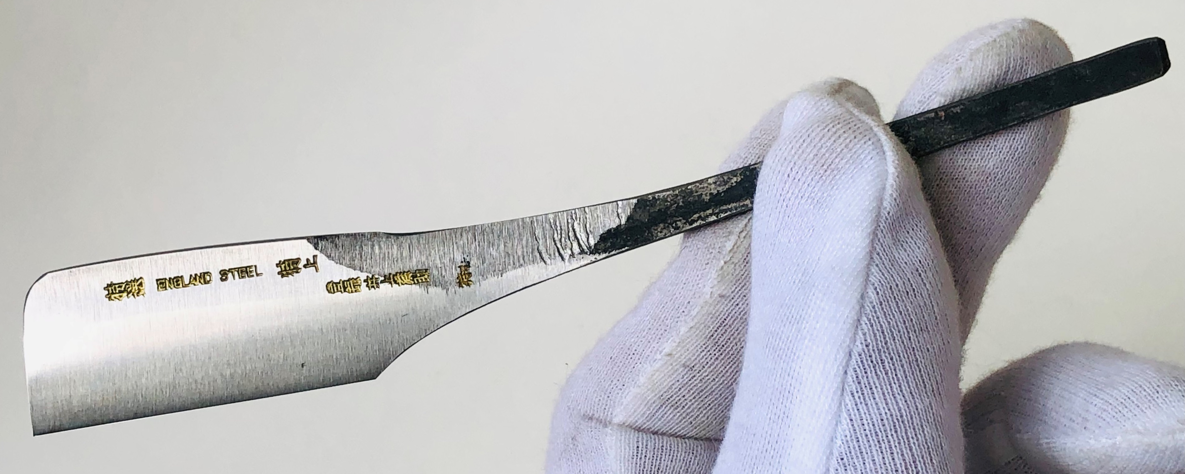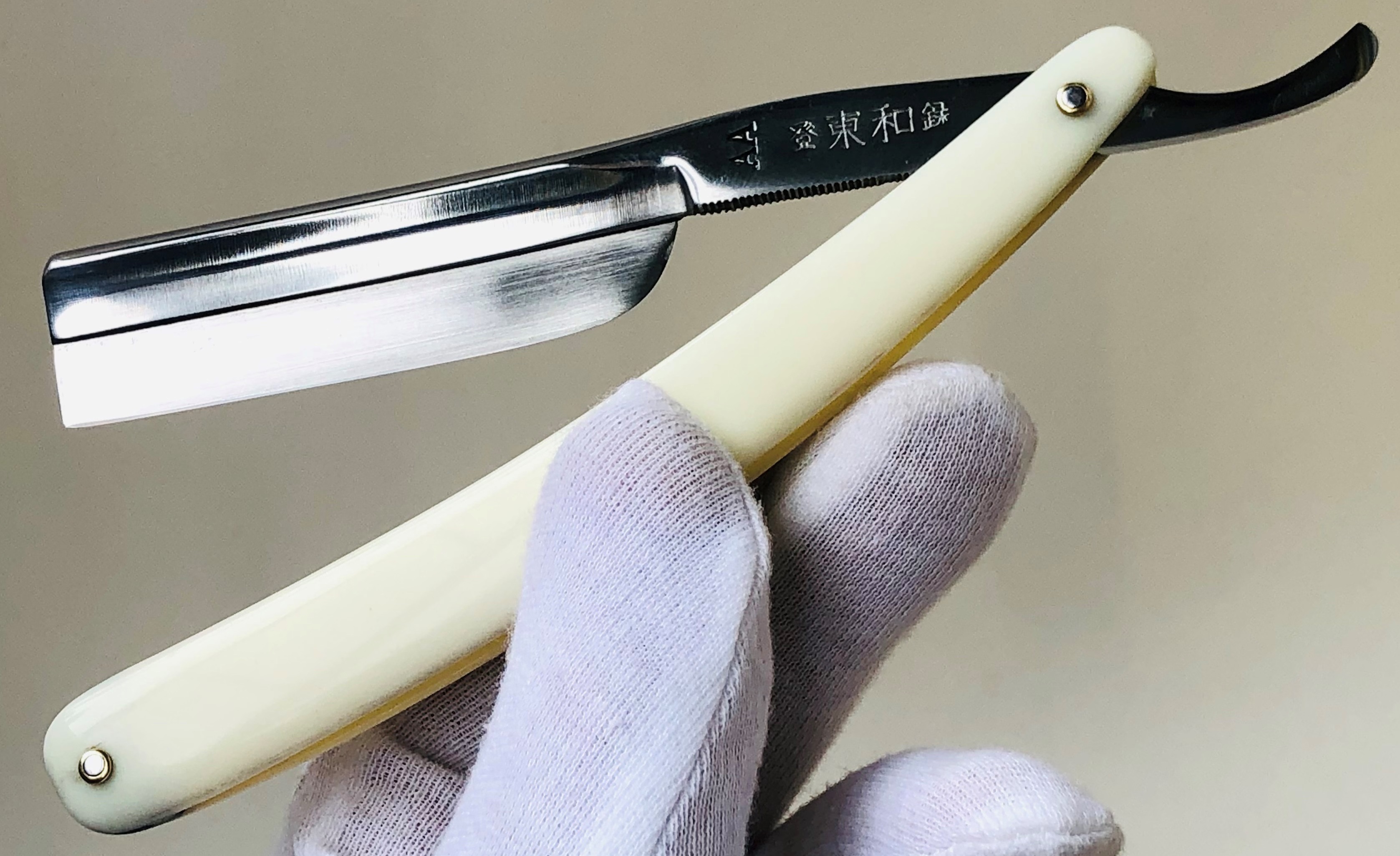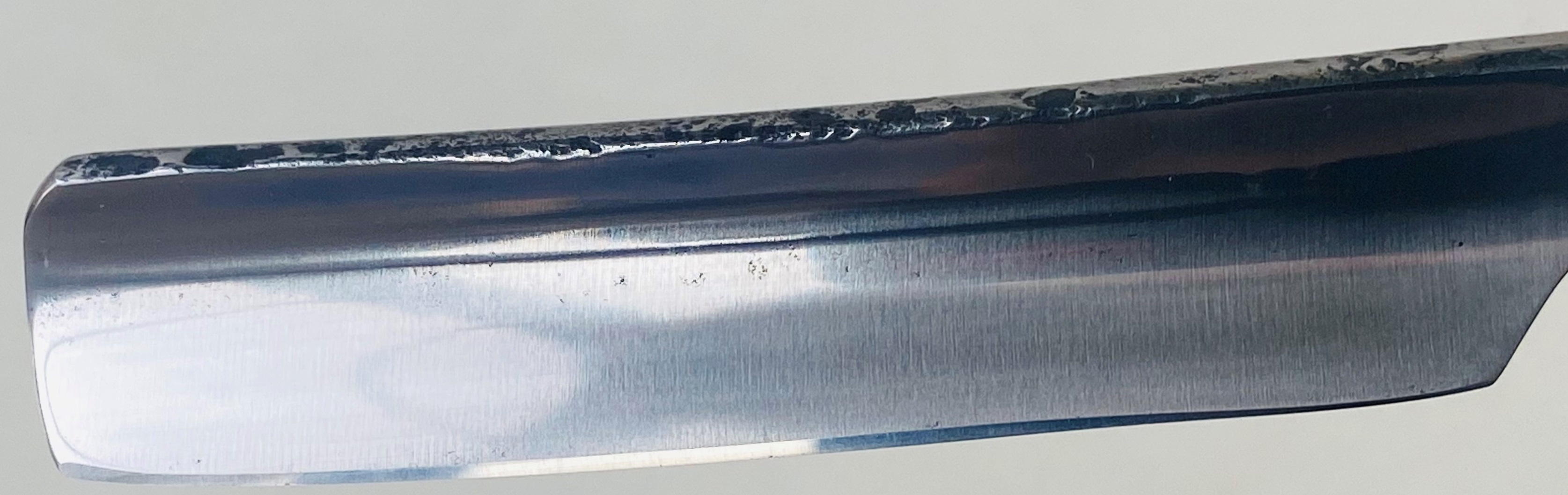Бритва с минимальными следами пользования и находится в прекрасном состоянии. Ничего не разбиралось и не ремонтировалось.Заводская(по всей видимости ручная шлифовка).Немного отполировал клинок, дабы придать былой блеск металлу.Идеальная геометрия:кромочка равномерна по всей длине .Шикарный укороченный клинок,созданный в чисто японском стиле.Практически не встречается в свободной продаже,так что не пропустите!