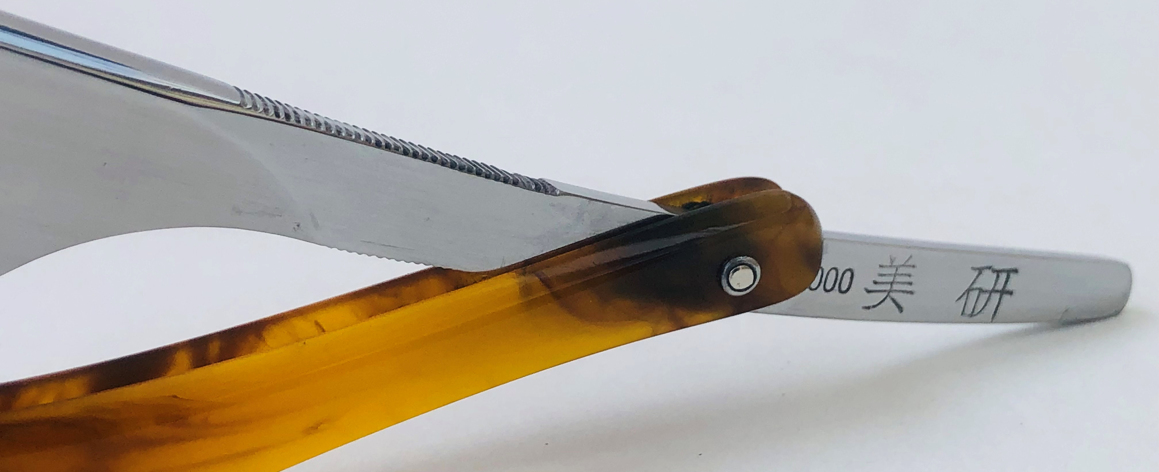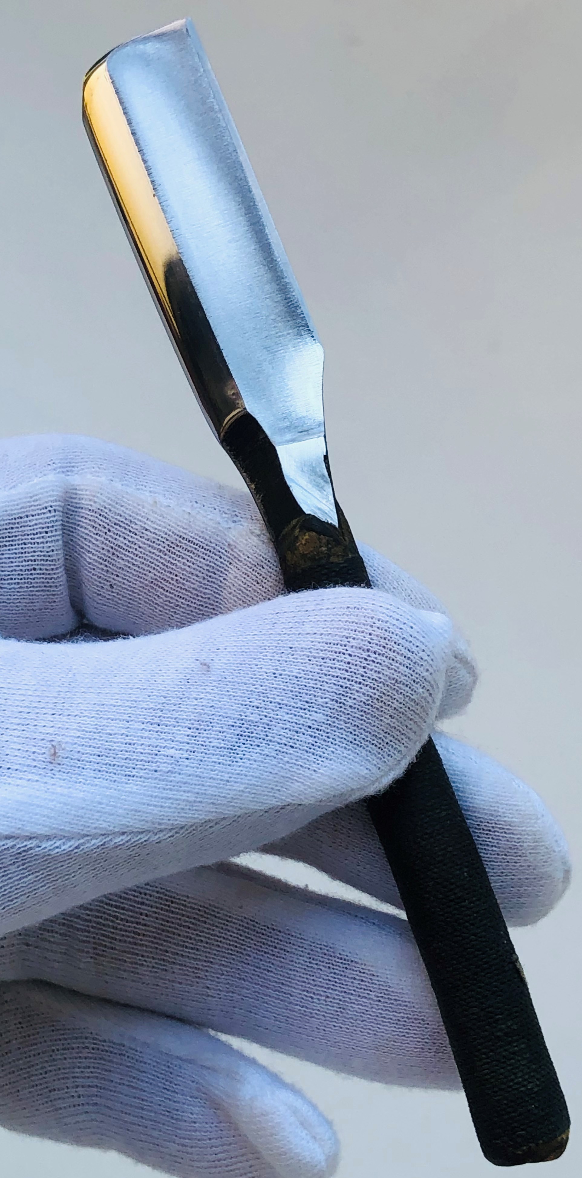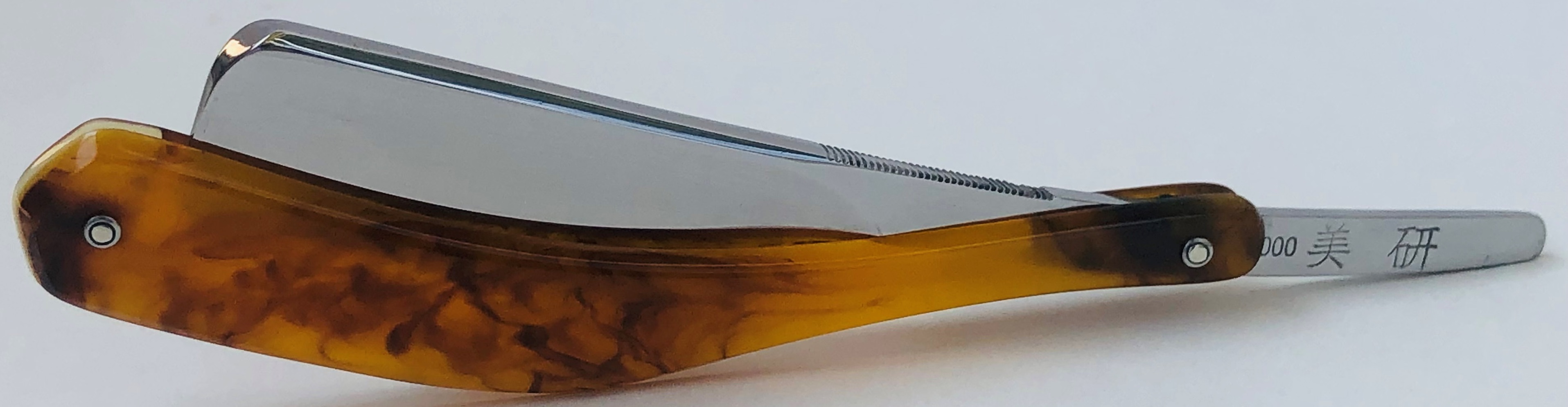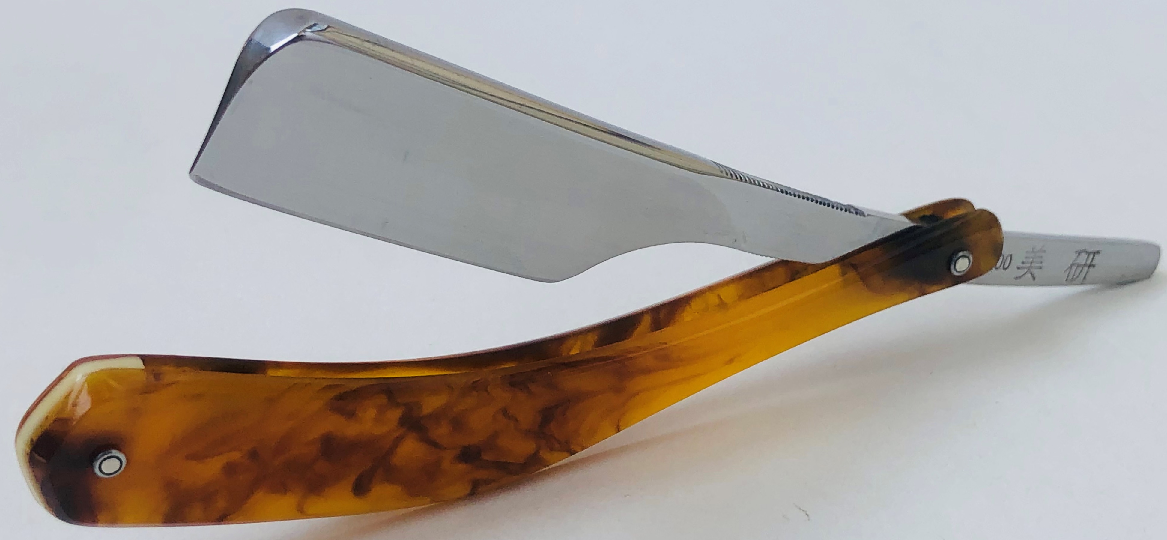 Бритва с минимальными следами пользования и находится в прекрасном состоянии. Ничего не разбиралось и не ремонтировалось.Заводская(по всей видимости ручная шлифовка).Немного отполировал клинок, дабы придать былой блеск металлу.Идеальная геометрия:кромочка равномерна по всей длине .Шикарный укороченный клинок,созданный в чисто японском стиле.Практически не встречается в свободной продаже,так что не пропустите!