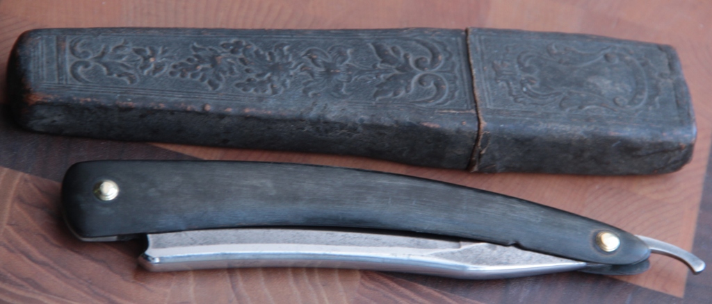 Не знаю,сколько эта бритва просто пролежала невостребованной, но пришла ко мне с достаточно толстым слоем патины( не ржавчины). Единственно что я сделал, так это немного почистил хвостовик и обушок от налёта вековой грязи, в полотно протёр полиролью вручную. Всё. Больше никаких работ не делал. Бритва полностью в оригинале: родная оправа, родные пины. Не знаю, разбиралась ли бритва за столько лет, но всё стоит качественно, без люфтов. Специально не стал зализывать полотно бритвы в зеркало, а оставил благородный налёт патины, что более красиво и естественно смотрится,для бритвы такого возраста. (ИМХО, конечно).Сама сталь не имеет коррозии , рытвин и других дефектов.Не смотря на такие размеры и такую форму лезвия, кромка и фаска на обушке достаточно равномерны, что для меня означает, что бритва была и использовалась профессионально, бережно и прямыми руками. Натуральный рог также в прекрасном состоянии, за исключением небольшой коцки снизу.Не смотря на тяжёлый клинок, ничего в конструкции не болтается и не люфтит. Имеется родной "гробик"-коробочка. Бритва заточена, проходит тест на рез волоса и готова снова встать в строй не только на полку, но и быть использованной по прямому назначению.Положительные эмоции от пользования инструментом древних предков гарантированны.