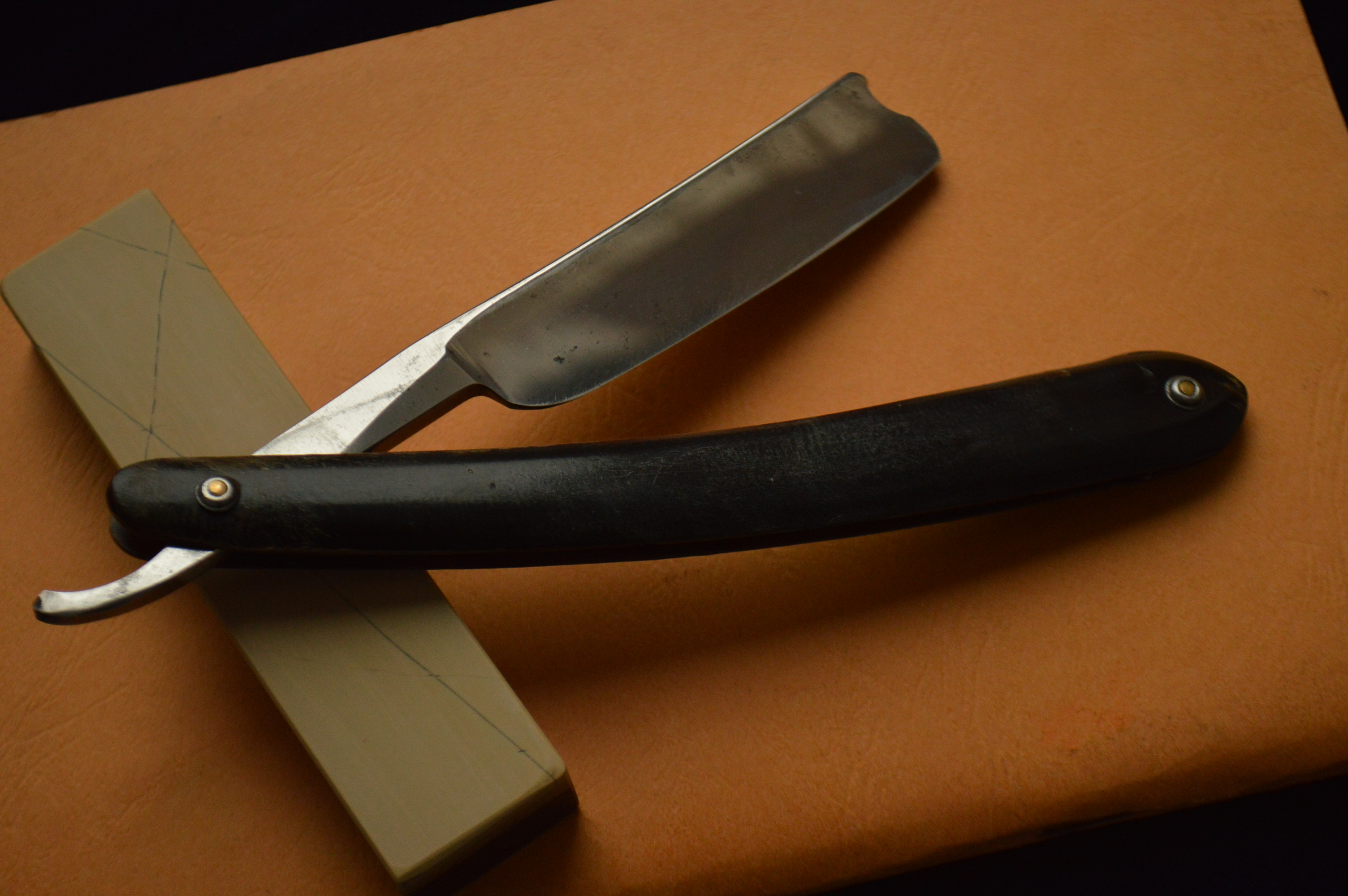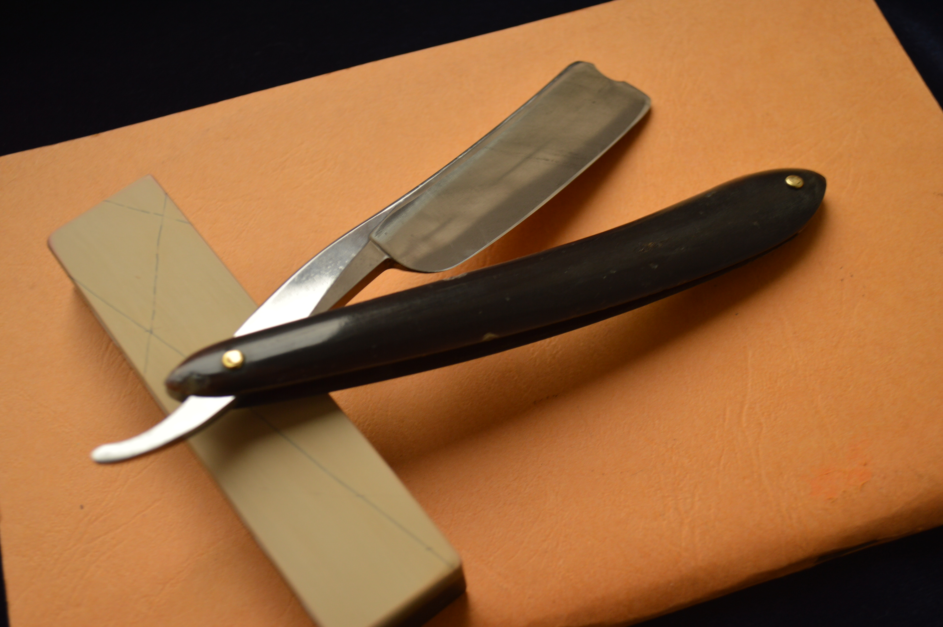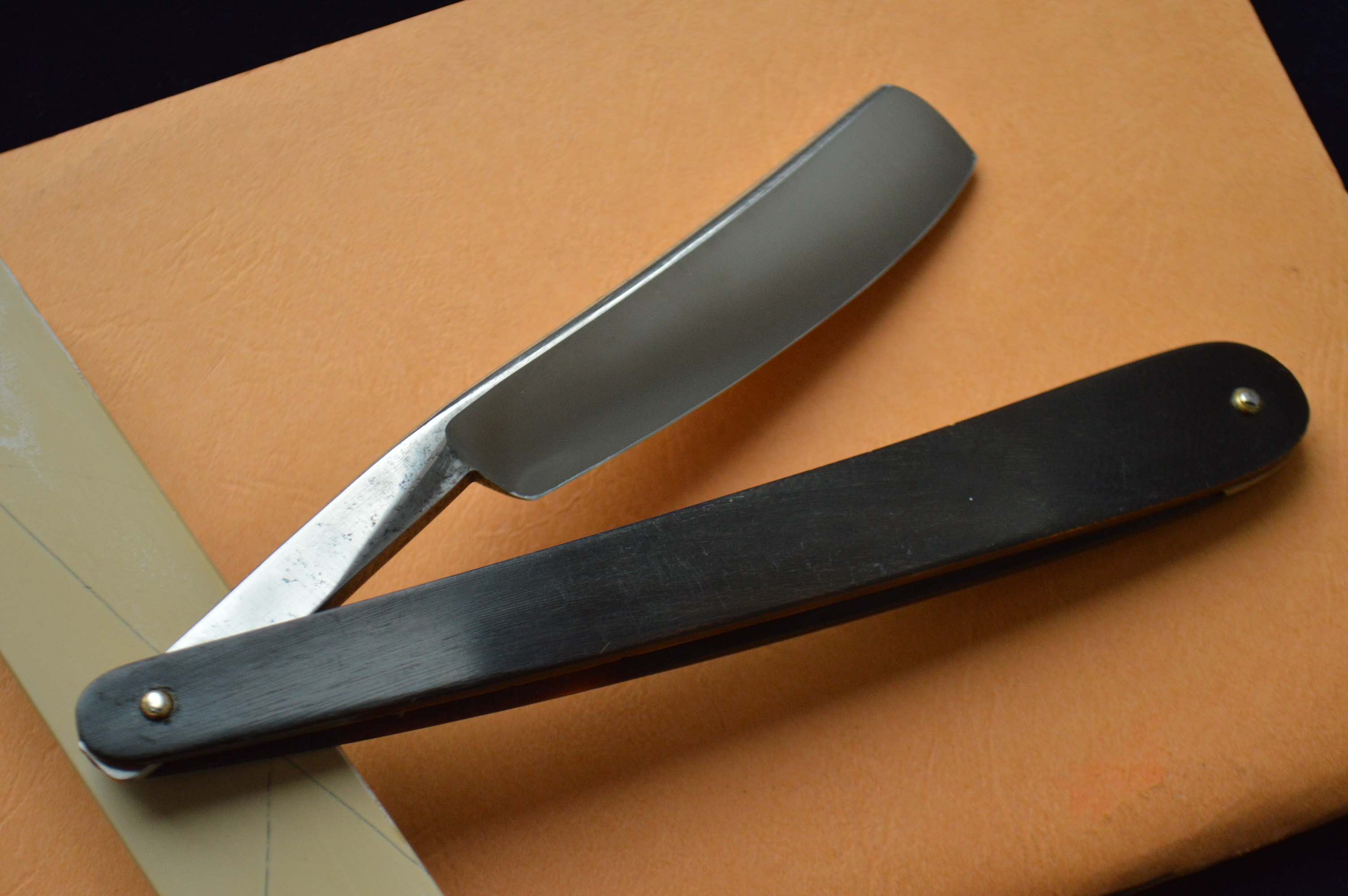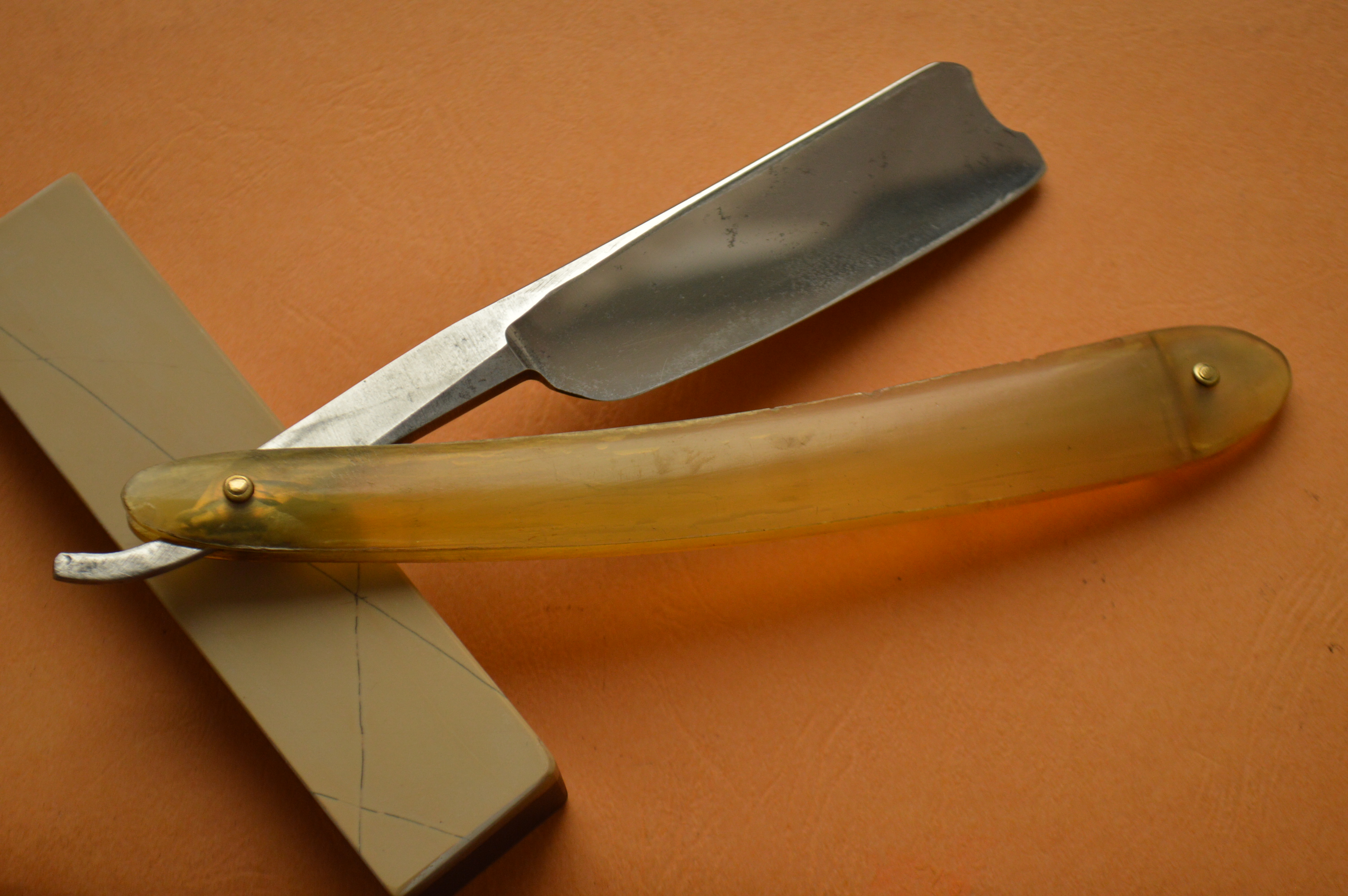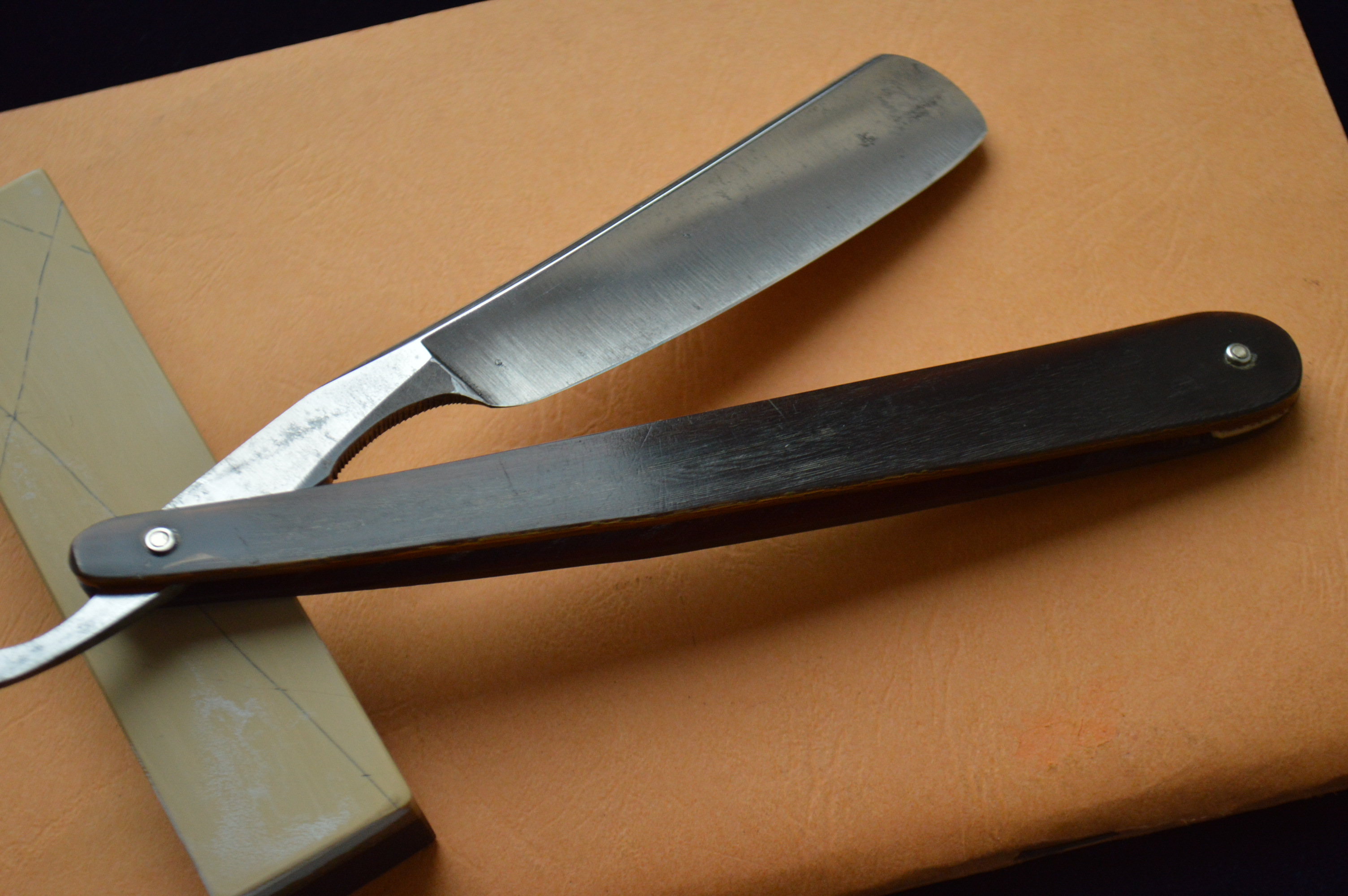 Бритва в строение клин. Ширина полотна – 7/8. Сама сталь в лучших традициях французских бритв: вязкая, мелко-зернистая, бритье превосходно мягкое и чистое. Ручка рог в замечательнейшем состоянии.