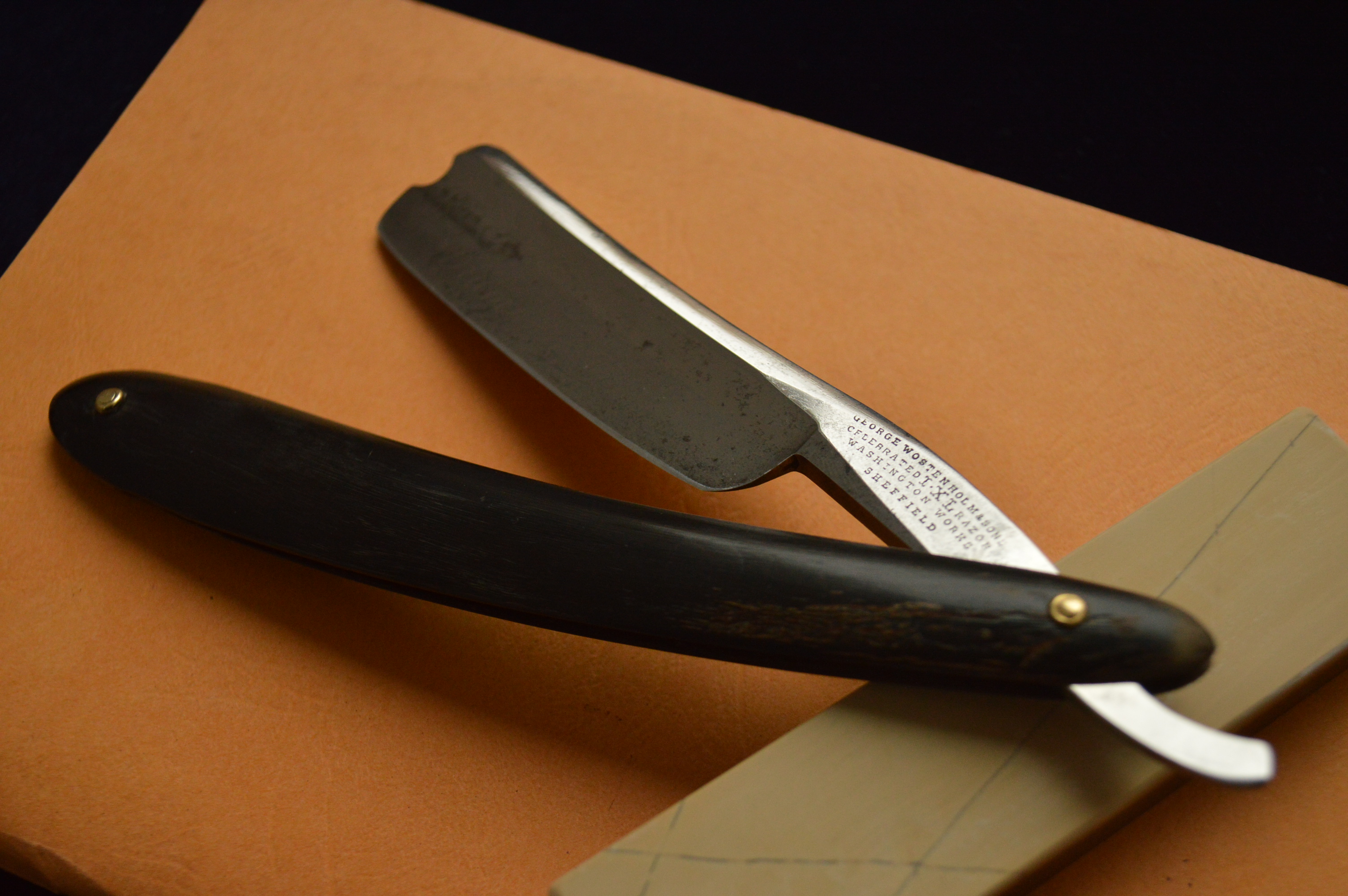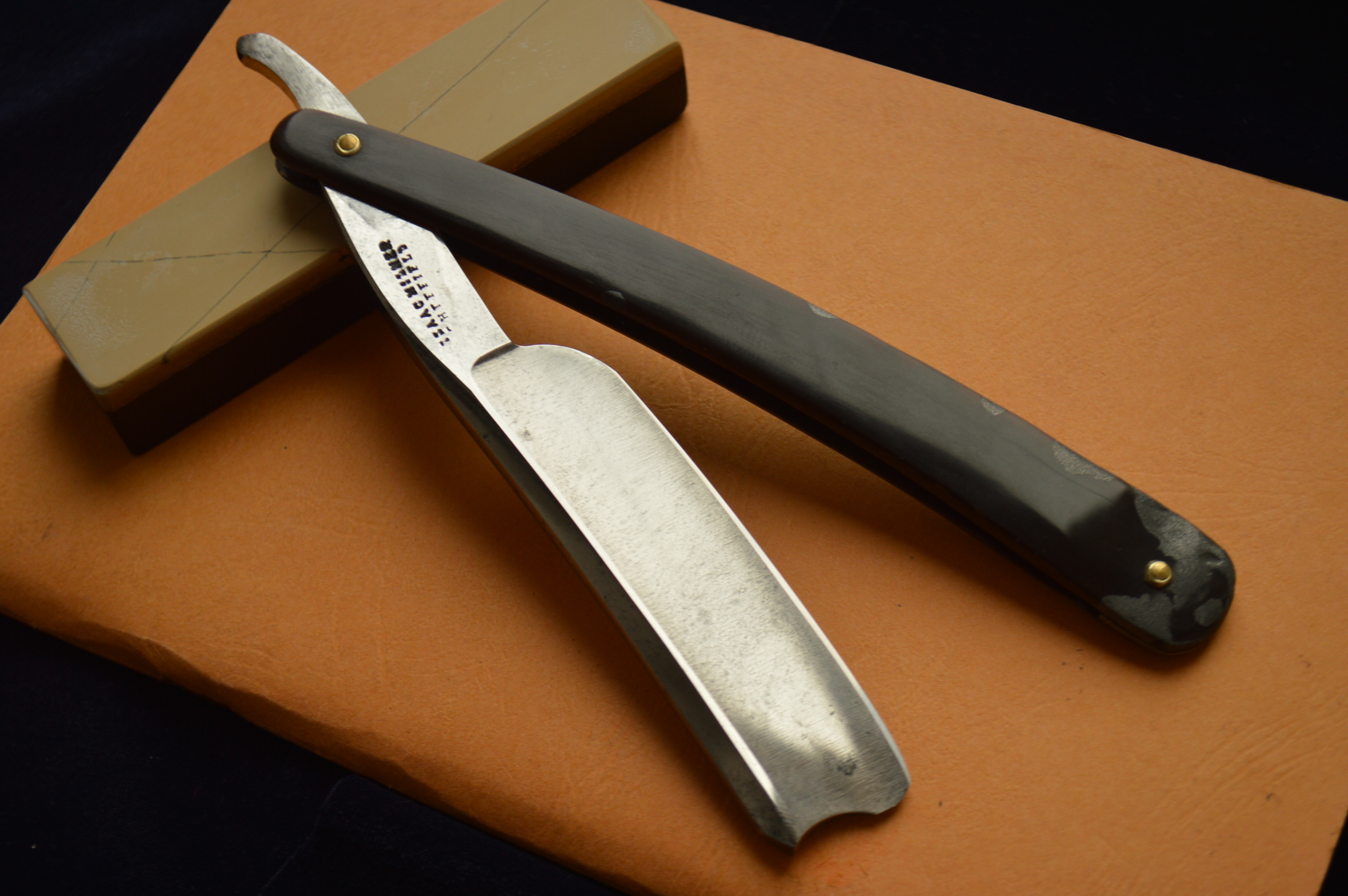 Бритва точилась впервые, аккуратная чистая модель. Не перешлифовывалась, а бережно вычищена, есть вековая патина ни на что не влияющая, добавляет старинного лоска этой бритве и совместно с сохраненным травлением на полотне дает понять, что в руках столетняя бритва нетронутая рукой восстановителя из секты "любителей наждака". Травление на полотне гласящее о том, что бритва сделана "специально для парикмахеров".