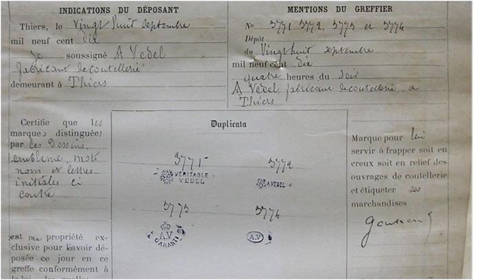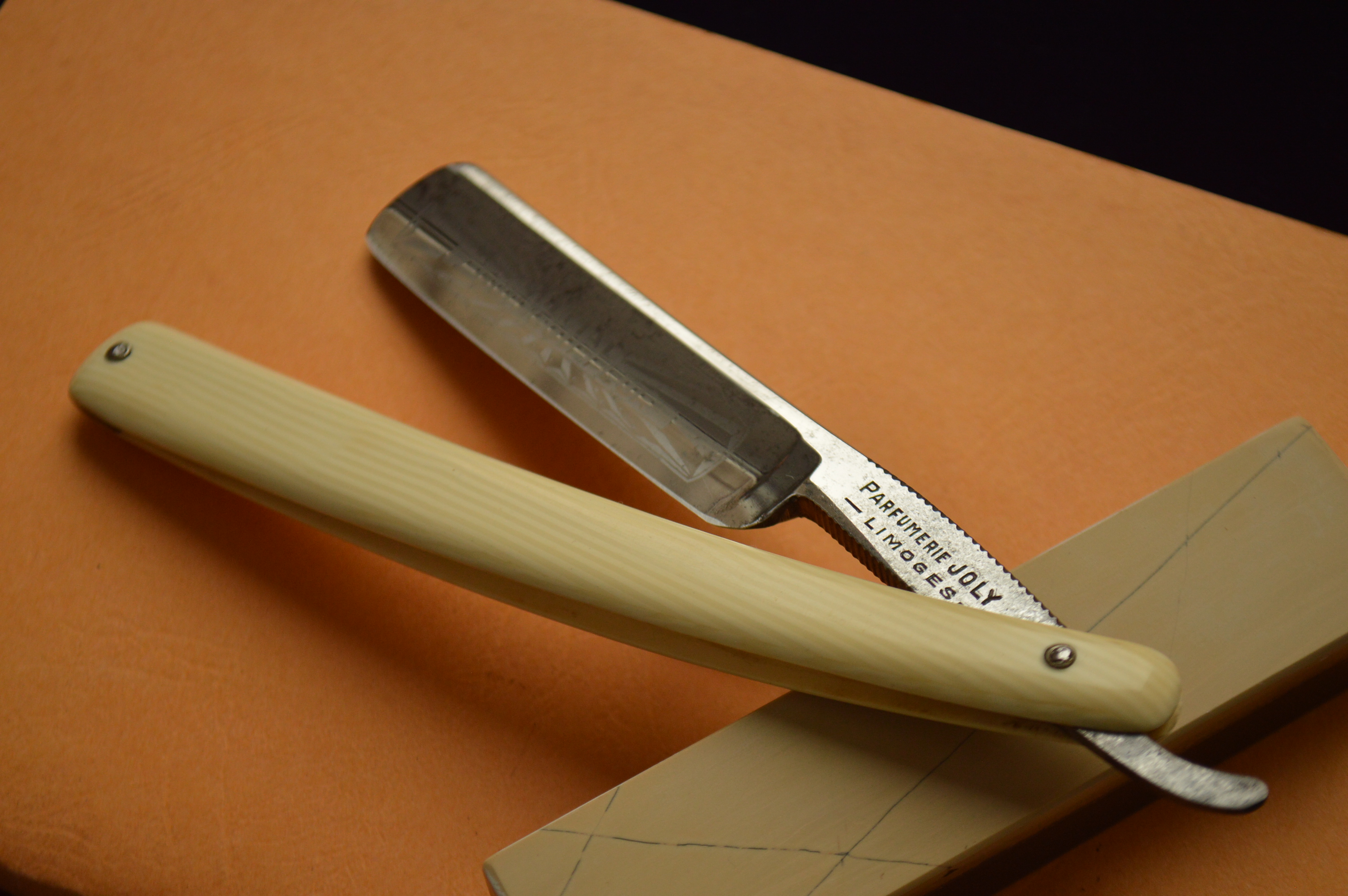 Антикварная французская бритва, сделанная производителем с торговой маркой, которая выбита на эрле с обратной стороны: @130@ для продавца: магазина Parfumerie Joly из видного французского города Лимож Традиционно были развиты коннозаводство, производство фарфора, сукна, полусукна, фланели, полушерстяных тканей, свечей, обуви и т. п. Город был важным складочным местом для товаров, идущих из Парижа в Южную Францию. В XIV—XVIII веках славился лимозинами — эмалированными вещами. Наивысшая точка развития промышленного сектора городской экономики Лиможа пришлась на период с 1850 года по 1930-е годы, о чём свидетельствует создание больших фарфоровых заводов Haviland в 1852 году на месте современного Торгового центра Centre commercial Saint-Martial, а в 1892 году в квартале Mas-Loubier. Последний из этих заводов вскоре стал самой крупной фарфоровой фабрикой в городе, имея к 1907 году, 17 печей и 800 рабочих. Параллельно формированию этих крупных промышленных объектов в Лиможе развивалась сеть малых предприятий по изготовлению фарфоровых изделий, к примеру фабрика Labesse, где в период между 1873 и 1938 годами трудились 90 человек .