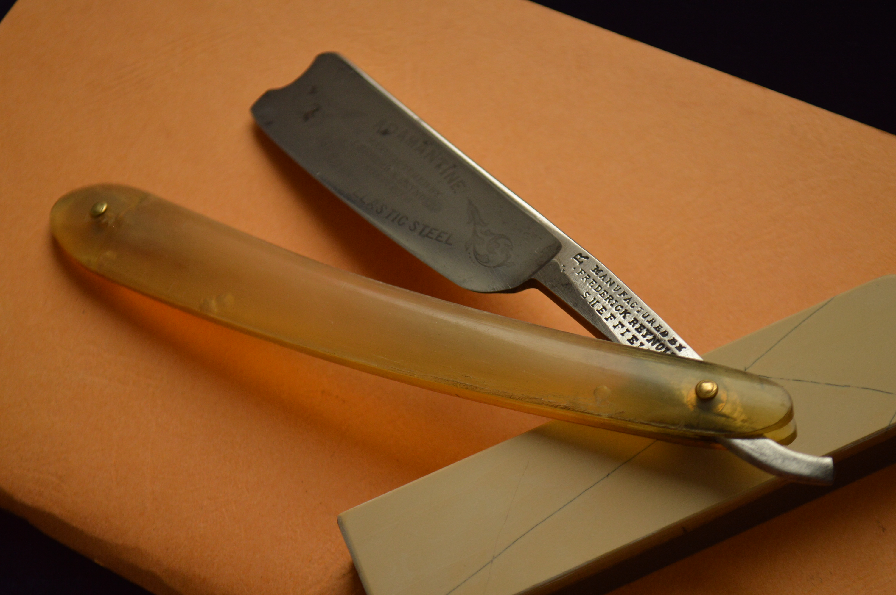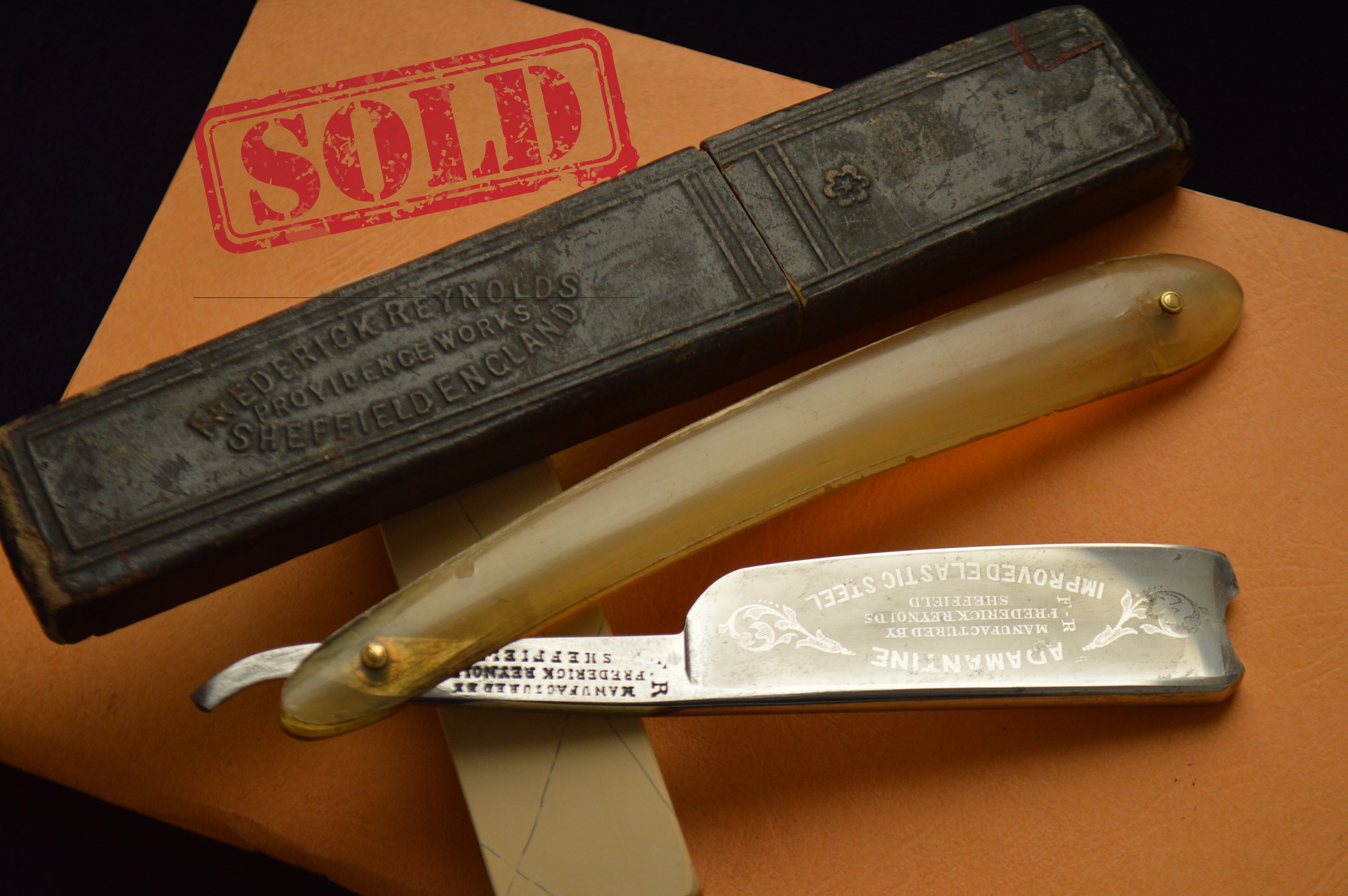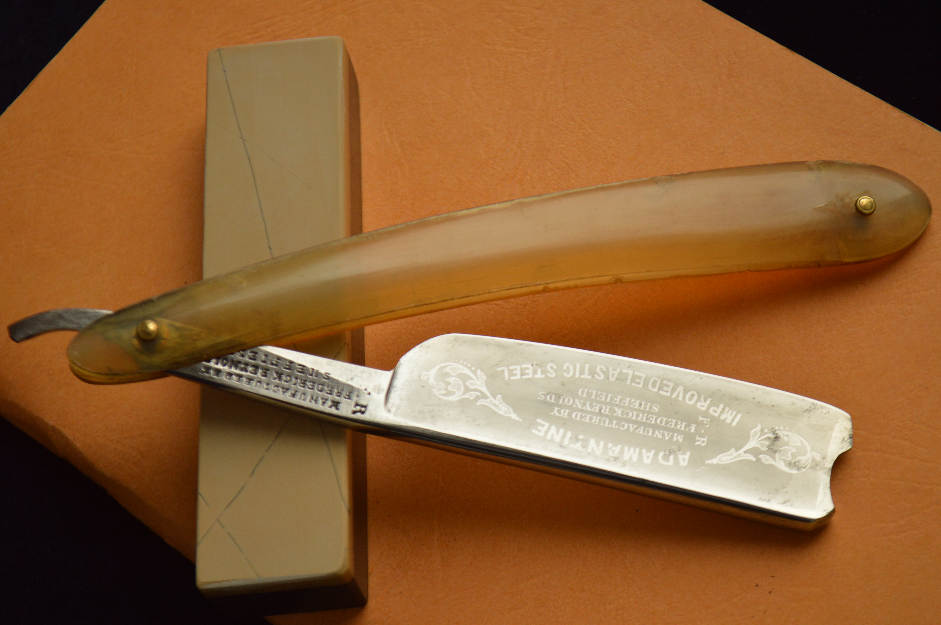 Имеет травление, гласящее о том, что бритва произведена Фредериком Рейнольдсом из улучшенной эластичной серебряной стали.