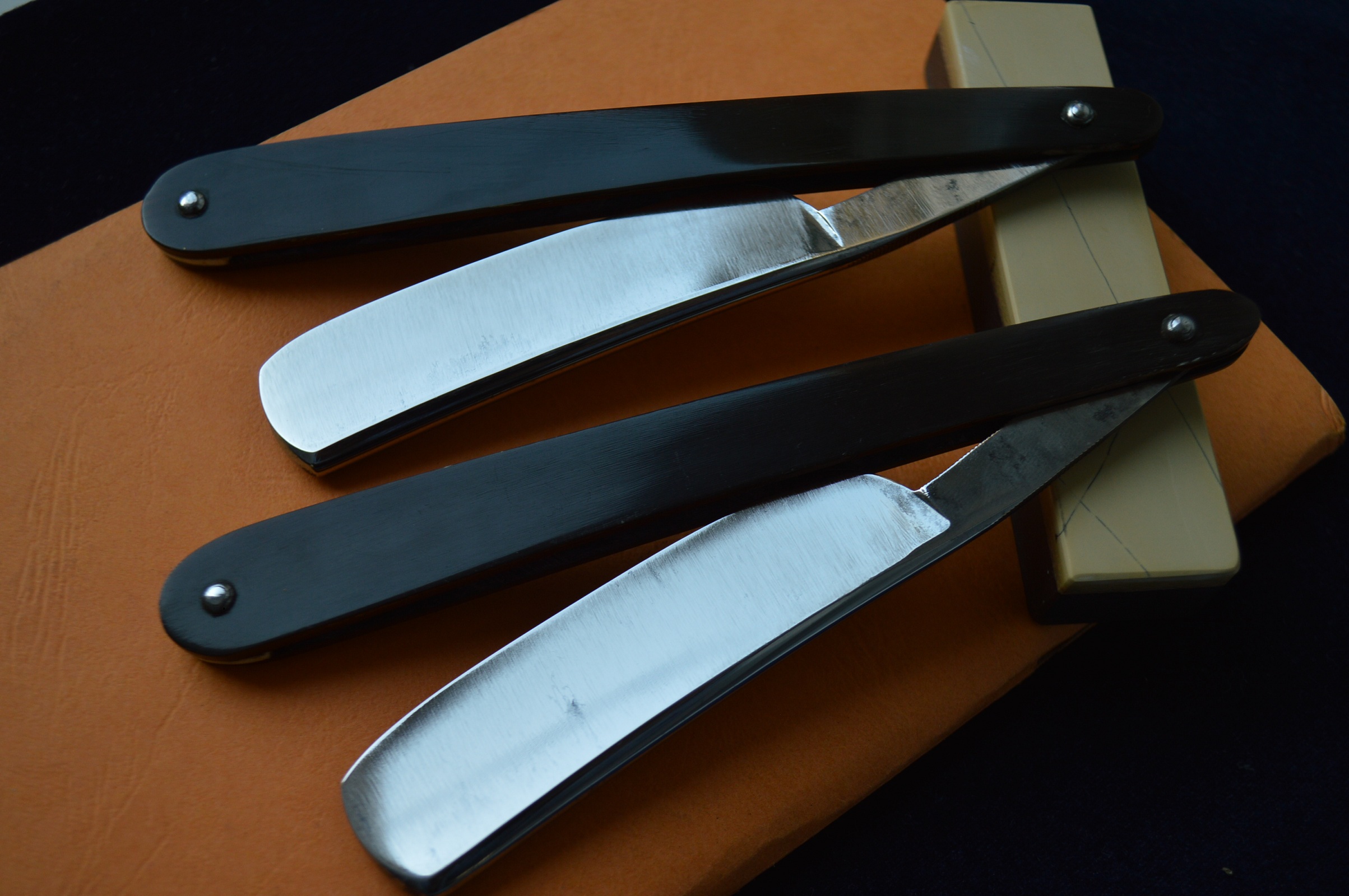 Бритвы не разбирались и чистились без применения наждачных бумаг, есть потемнения, но без надобности что-то вычищать грубыми абразивами, бритвы чистились очень деликатно, клинышек кость, ручка рог пропитана специальным средством, стальные крупные пины в замечательном сохране, все это в нетронутом состоянии добавляет шарма и дает понимание того, что в руках действительно антикварная вещь.