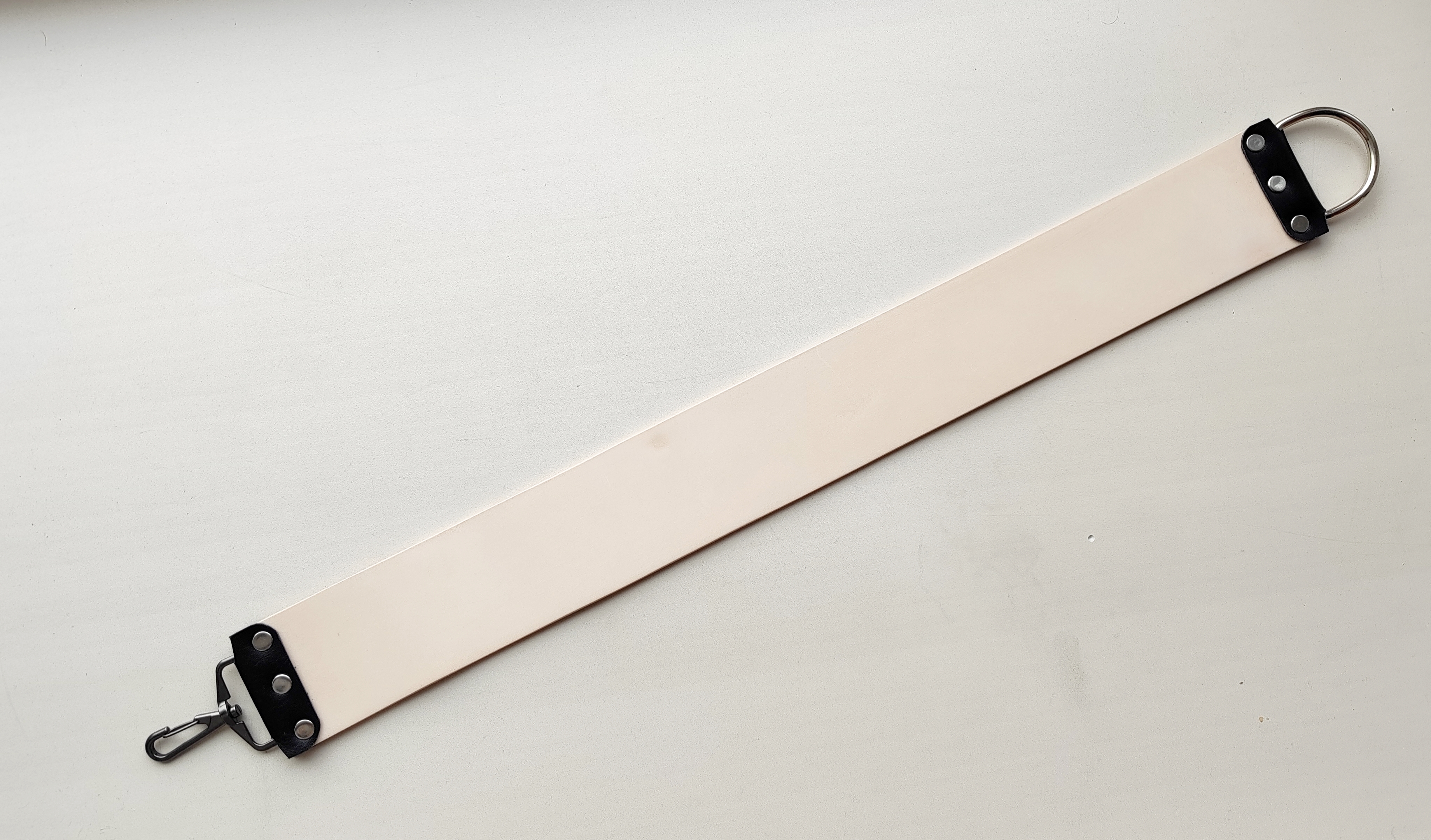 Ремень для правки опасных бритв, широкий, 63 мм, итальянская кожа КРС растительного дубления (чепрак). На ощупь ладонью ощущается очень мелкий и бархатный микроворс - под быструю и эффективную правку бритв любой твёрдости, как раз он и правит кромку.