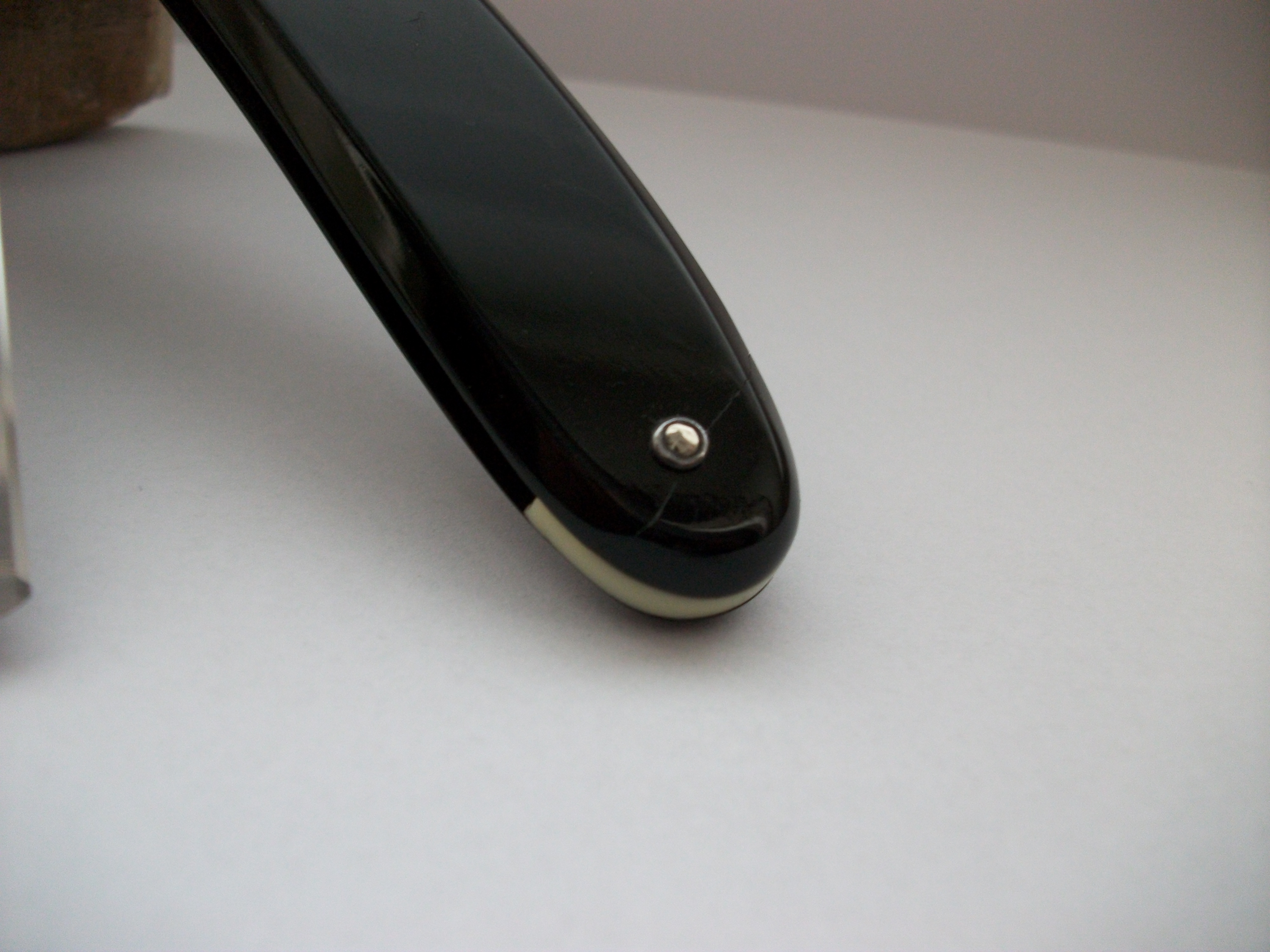 手作 ручная работа ヤスキ сталь Ясуки (от компании Хитачи) Углеродистая сталь, ширина полотна 21мм, длина режущей кромки 70мм, вогнутость ближе к клину. Прежний хозяин точил без изоленты и я это не стал исправлять, по полотну только небольшая косметика, но следы времени присутствуют. Тяжелая и мощная бритва. Ручка пластик, в районе нижнего пина есть трещина (см фото), но если бритву использовать по назначению, то она прослужит без проблем 100 лет тк нагрузки в этом месте никакой нет, пин подтянул на всякий случай. Так же на ручке есть отметка в районе осевого пина в виде трех насечек (танкисты заценят) почти уверен что бритва использовалась в парикмахерской и данная мера пресекала использование инструмента коллегами по цеху. Продано руб. Spoiler Show