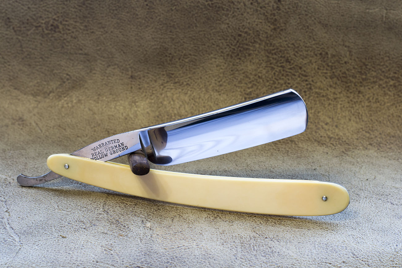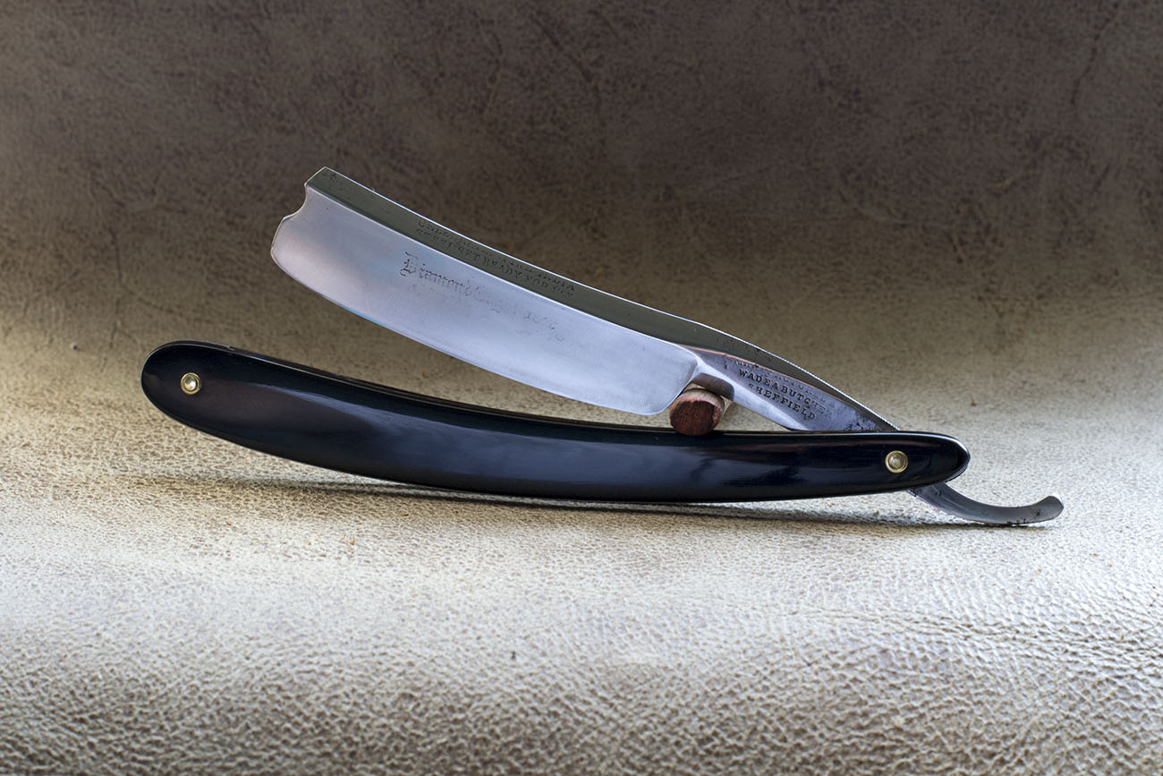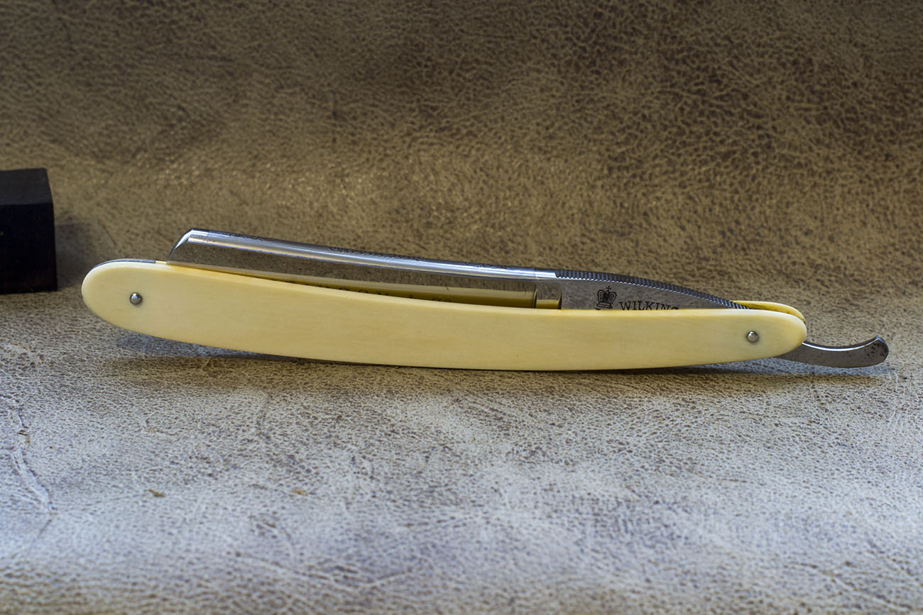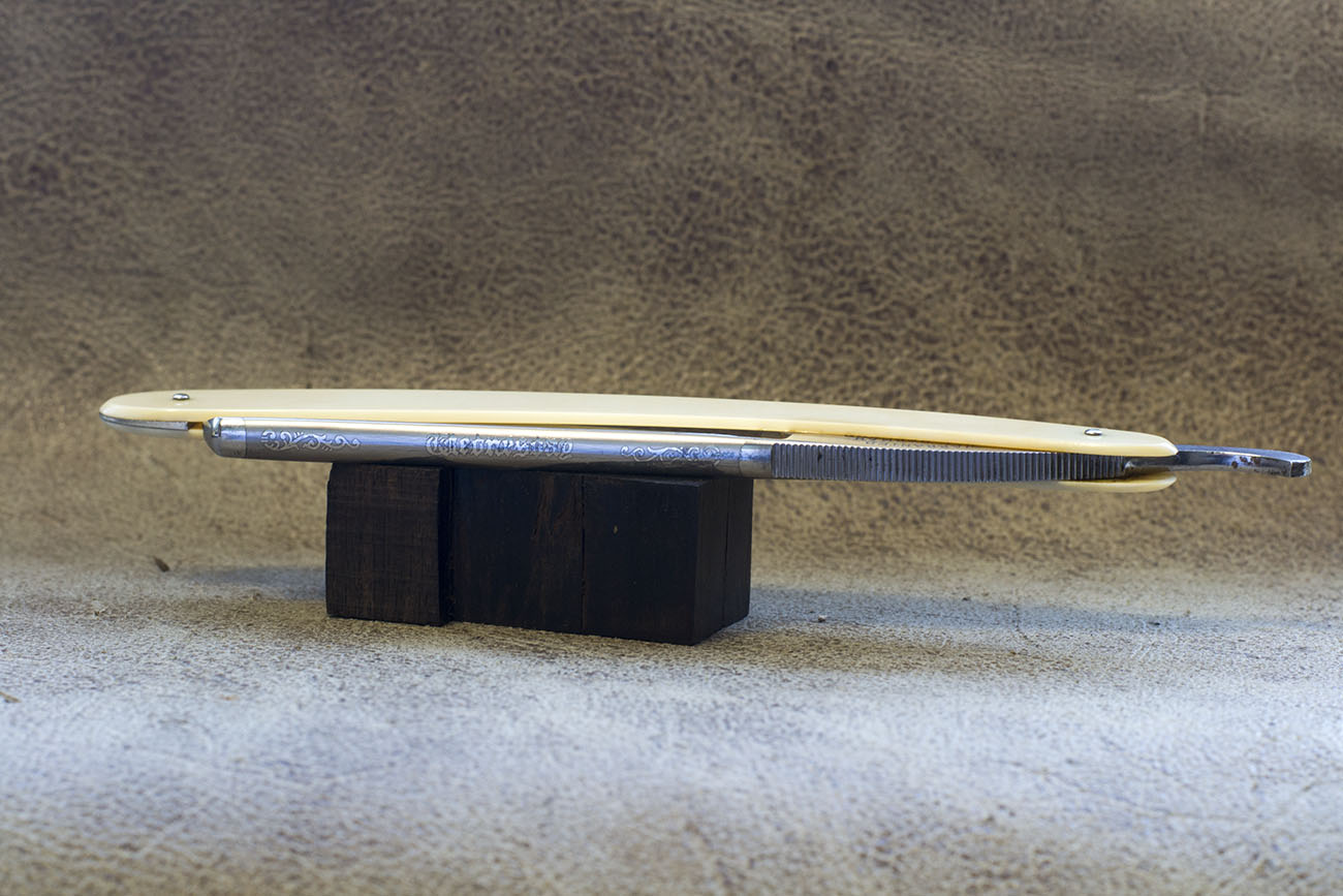 Английская бритва от известного производителя, только известен он не по опасным бритвам а по другим изделиям стальной промышленности, таким как безопасные бритвы, ножи, карманные ножи и прочая полезная в хозяйстве стальная мелочь. Бритвы весьма удачны в плане геометрии и стали – хорошо точатся, имеют довольно узкую и ровную кромку, данный экземпляр так же снабжен рукоятью из слоновой кости, ширина полотна 20 мм, бритва имеет отчетливо видную вогнутость со ступенькой, так называемый bellied ground но по сути бритва почти не отличима от таких же экземпляров с простой полной вогнутостью. Бритва была заточена мной впервые и никогда не была в использовании. Продано Lockwood Show