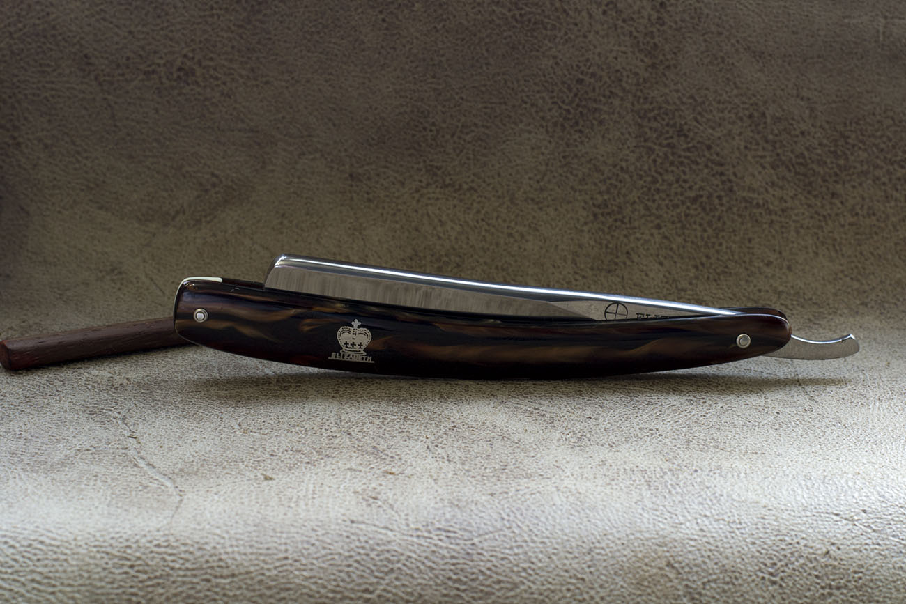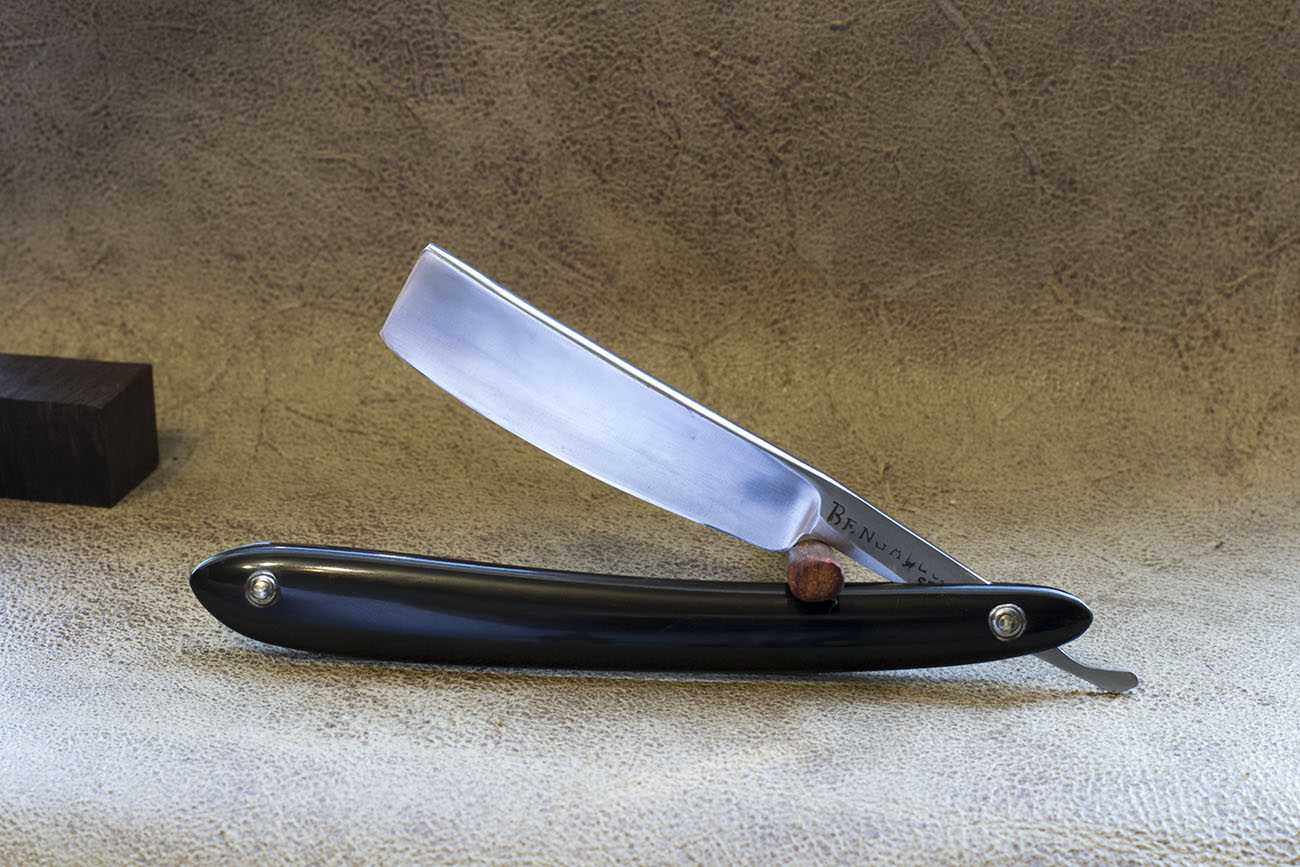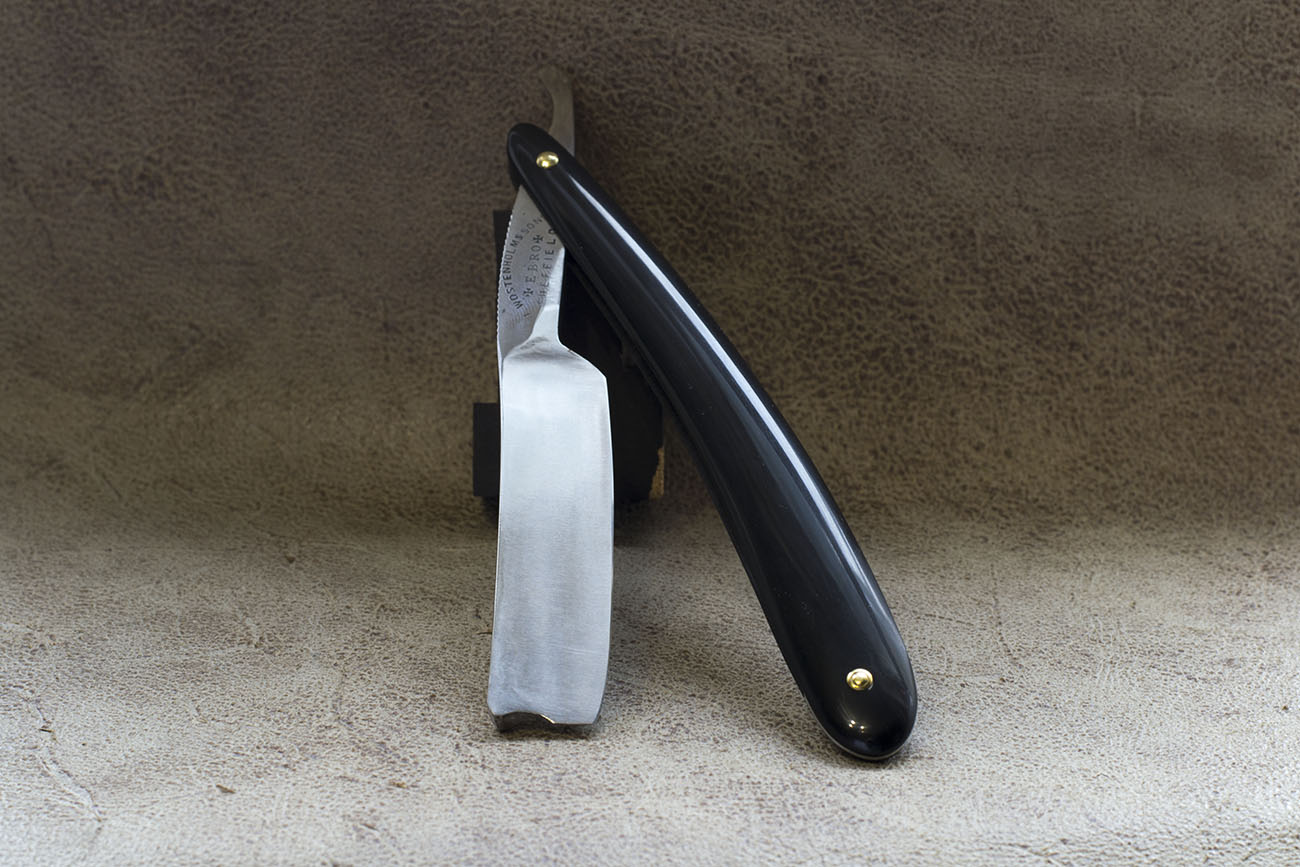 Рад представить крайне интересный французский фреймбэк от одного из наиболее известных и старых производителей бритв во Франции. Для меня Dumas 32 более известен как изготовитель бритв с вогнутостью клин от начала до середины 19 века, с разной шириной полотна, хвостовиком разного вида или вовсе без него. Во время поисков информации, наткнулся так же на интересные сведения о том, что фирма существовала как производитель ножей и различного режущего инструмента, по некоторым данным, является наиболее старым, в Тьер, брендом данной направленности, основание которой восходит аж к 16 веку. Кроме того марка существует по сей день, продолжая выпуск своей продукции, о производстве опасных бритв конечно же речь не идет. Фреймбэк является редкой формой полотна для данного изготовителя, на моей памяти это и вовсе первый образец попавший ко мне в руки. Кроме того, форма не совсем типична для французских фреймбэков и скорее отдаленно напоминает шведские бритвы подобного формата. Ширина полотна 19.5 мм, воронение. Родная роговая рукоять, которую удалось выпрямить, но в дальнейшем нет никаких гарантий от небольшого искривления. Клинышек –кость. Отличная сталь и хорошая геометрия, бритва заточена и готова к бритью. Продано Dumas Show