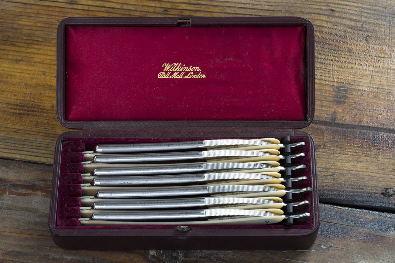 Недельный набор от очень старой и очень известной Wilkinson Sword. Фирма начала свое существование в 1772 году как оружейный магазин. В конце 19 века, фирма в числе множества другой новой продукции, начала производить опасные бритвы. Данный набор можно отнести к периоду конца 19 – начала 20 века. Судя по надписи Real German Hollow Ground часть цикла, а возможно и весь цикл производства производился в Германии. На полотне травление дилера для которого был изготовлен данный набор – Robinson & Co является крупной торговой компанией работающей в Сингапуре и Малайзии с середины 19 века. Бритвы данного набора имеют ширину полотна 21 мм. Ширину спинки 5.5 мм., вогнутость полная. 6 из 7 бритв, кроме понедельника, не были в использовании, понедельник использовался мало и аккуратно. Рукояти бритв выполнены из слоновой кости, сделаны очень качественно, бритвы до сих пор закрываются аккуратно по центру, на полотнах практически отсутствуют следы времени. Бритвы прекрасно заточились , имеют очень хорошую геометрию. Рекомендую для новичков в качестве первой бритвы а редкое исполнение этих бритв сделают их прекрасным дополнением к любой коллекции. Набор будет распродан поштучно. Цена бритв со вторника по воскресенье – 12 000 рублей Понедельник – 9000 рублей. В наличии следующие бритвы - Понедельник - Среда - Четверг - Воскресенье Фото любой бритвы вышлю по запросу. Wilkinson Sword Show