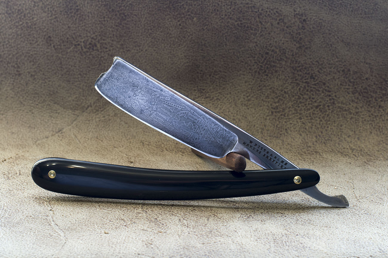 Масонский клин от W. Pitts & Sons. Sheffield. Ширина полотна 7/8 или 22 мм. Спинка 5.6 мм. Масонское травление довольно хорошо сохранилось. Очень интересная форма полотна – массивный и удобный эрль. Удалось сохранить правильную геометрию бритвы, не нанес вред травлению. Сталь по качеству ничем не уступает стали более именитых и известных шеффилдских производителей. Так же стоит отметить парикмахерский вырез сделанный наискось и хвостовик сохранивший следы ковки в виде окалины на поверхности металла, придающие бритве особую аутентичность и уникальность. К сожалению, информация о производителе не доступна в открытых источниках в сети, кроме того я не нашел ни одной другой бритвы этого производителя, что говорит о малом тираже бритв W. Pitts. Судя по форме полотна и мотиву травления – бритва довольно древняя. 30-40 гг 19 века. Отличный подарок для коллекционеров. Продано W. Pitts & Sons Show