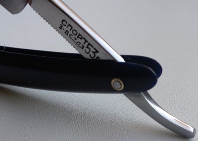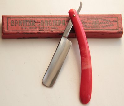 Еще один прекрасный экземпляр, "сталинских" лет.Бритва находится в очень хорошем состоянии. Следов от заточных камней на обушке нет, что дает возможность мне предположить,что бритву никто не точил никогда и не пользовался. Пришлось разобрать бритву и немного почистить в районе осевого пина.Поставил нормальные пины, со внутренними шайбами, для порядка.Сталь и кромка чистые, без видимых дефектов. Идеальная геометрия полотна:кромочка равномерна по всей длине.Бритва заточена и готова к бритью. Родная коробочка находится в идеальном состоянии для своих лет!