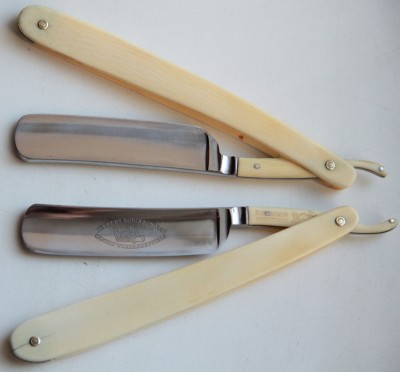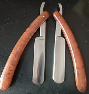 Бритвы очень красивые и находятся в прекрасном состоянии.В пользовании не были. Пришлось разобрать, поставить нормальные пины и немного освежить металл от старинной патины.Сталь и кромка чистые, без каких либо "следов времени". Идеальная геометрия полотен.Кромочка равномерна по всей длине.