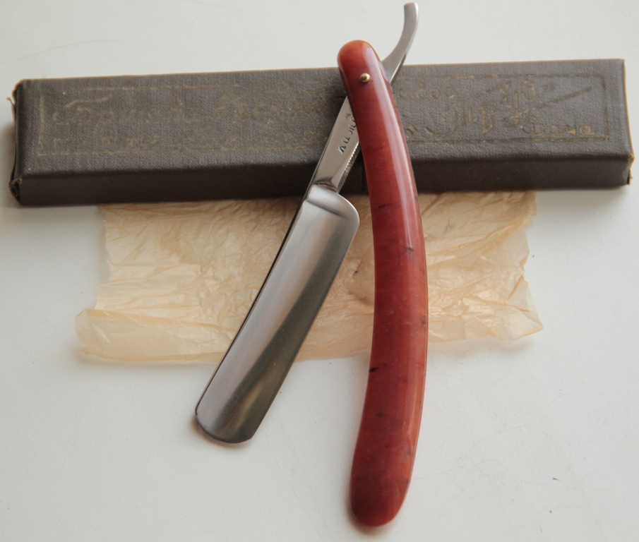 Бритва в прекрасном состоянии. По всей видимости в употреблении не была. Не разбиралась и не ремонтировалась.Крупная, мощная, но в тоже время по французски элегантная бритва, с отличной сталью и удобной формой лезвия.Идеальная геометрия полотна. Кромочка равномерна по всей длине и еле заметна. Сталь чистая, без проблем.Очень красивая бритва не оставит равнодушным никого. Заточена и готова к пользованию.