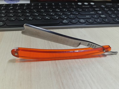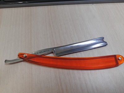 Надпись на полотне не видна, видно её только под наклоном. Возраст - (примерно, по чисто визуальной оценке) от 10-х до середины 30-х годов 20-го века. Самое интересное - это рукоять. Это первая серийная фабричная рукоять (моего производства), которую у меня можно заказать и просто купить. Качество в разы выше чем у официальных с Золингена и Тьера. В том числе выше чем у старинных. Будут высококачественные копии ВАЧИ и СТИЗа, Тьер Иссара и многих других. В пластике и в дереве. Из разных пород дерева и разных цветов пластика. Рукоять из такого пластика очень сложно сломать. Пока производство рукоятей только налаживается. Пока заказы не принимаю. Предзаказы только. Цена бритвы 4500 руб. (Цена без заточки, заточка отдельно) (Продана)