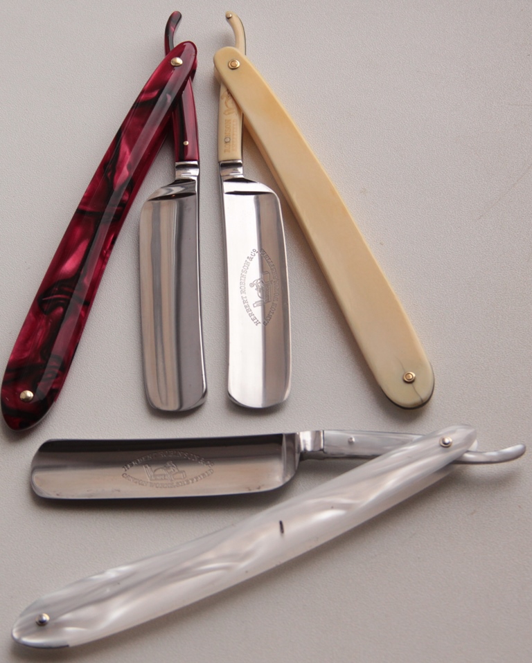 Всего три бритвы остались, среди которых одна в полном оригинале-накладка и оправа-слоновая кость. Другие две клинка были украшены шикарными ручками из современного материала-киринит, выполнены нашим мастером и просто хорошим человеком-Алексеем Беляковым(aka Aleksey7 from britva.ru). Специально не стал искать какой то аутентичности для этих бритв, а попытался совместить эти прекрасные и непользованные клинки начала века, с таким красивым и очень надёжным материалом, как киринит.На мой взгляд, получилось очень достойно, за что огромное спасибо Алексею, за такую ювелирную и профессиональную работу. Я не смог передать всю красоту бритв по фото, но наяву они выглядят потрясающе, в чём смогут убедиться новые пользователи этих экземпляров.Как было сказано, бритвы не были в пользовании. Немного освежил металл полиролькой и проверил геометрию изготовления, с которой тут всё нормально.Сталь и кромка чистые. Бритвы перед отправкой будут заточены и подготовлены к бритью.