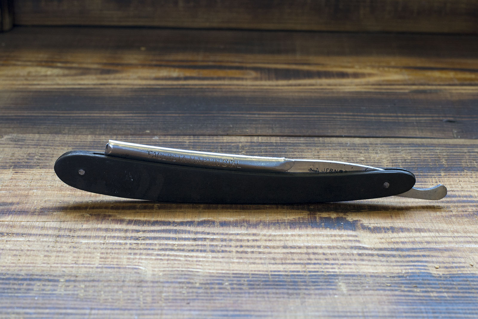 Бритва малоизвестного французского бренда, основанного в начале 20 века в городе Тьер, неким Guillemin Mallaret вероятно производство существовало и в более ранее время, просто в 1915 Малларе зарегистрировал еще несколько торговых марок, в том числе и Canon 75 G.M. Клинок сделан по классическим французским технологиям, форма так же традиционна для Тьера и Франции в целом, но эрль имеет удобную подпальцевую выемку, что является редкостью. Улыбчивая форма клинка с расширением от пяточки к носику обеспечивает очень комфортное, качественное бритье за счет имитации так называемого "косого реза". Для изготовления использована качественная литая углеродистая сталь, Magnetic Extra в данном случае является не более чем маркетинговым ходом того времени, магнитных свойст полотно не проявляет. Рукоять бритвы изготовлена из рога, вероятно буйвола, клинышек традиционно белый, но уже не из кости а какого то неизместного для меня материала. Бритва сохранилась практически в нетронутом, первозданном виде, обух не имеет следов заточки, можно предположить что бритвой не пользовались, так же на полотне есть травление - Magnetic Extra, с несколькими царапинами, но все еще читаемое. Ширина 20 мм (6/8+) Бритва заточена и готова к бритью, рекомендую новичкам, решившим освоить клин, так же интересна как экземпляр коллекции ввиду редкости. Продано Пушка Show