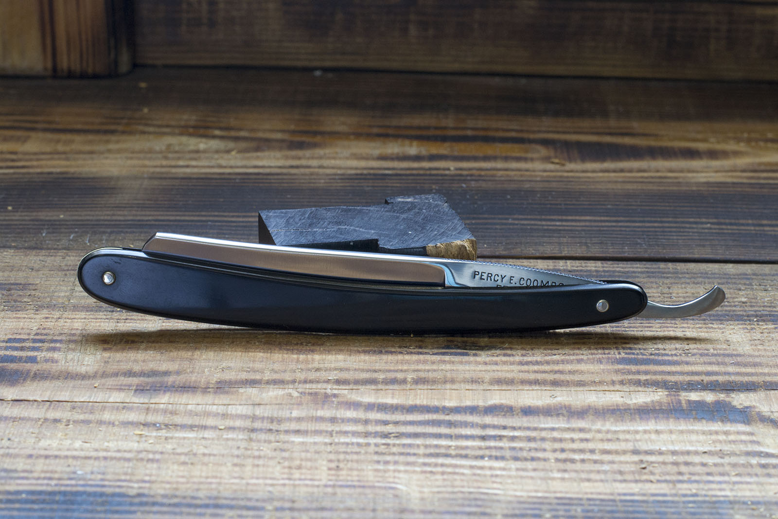 Германская опасная бритва, судя по клейму изготовлена из шеффилдской тсали на одном из производств в городе Золинген. Персиваль Комбс скорее всего был заказчиком, проживающим в городе Фрум (Frome), Англия и не имел отношения к производству. Период изготовления сложно определить с большой точностью, но скорее всего это конец 19 - начало 20-го века. Как упоминал ранее - бритва изготовлена из шеффилдской углеродистой стали, имеет полную вогнутость, ширина полотна 17.7 мм. Рукоять изготовлена из эбонита, клин - целлулоид, оригинальные шайбы из нейзильбера(сплав никеля и цинка). Геометрия полотна близка к идеальной, фаска режущей кромки ровная и равномерная. Бритва заточена и готова к бритью, будет интересна новичкам достойная бритва за небольшие деньги. Продано Coombs Show