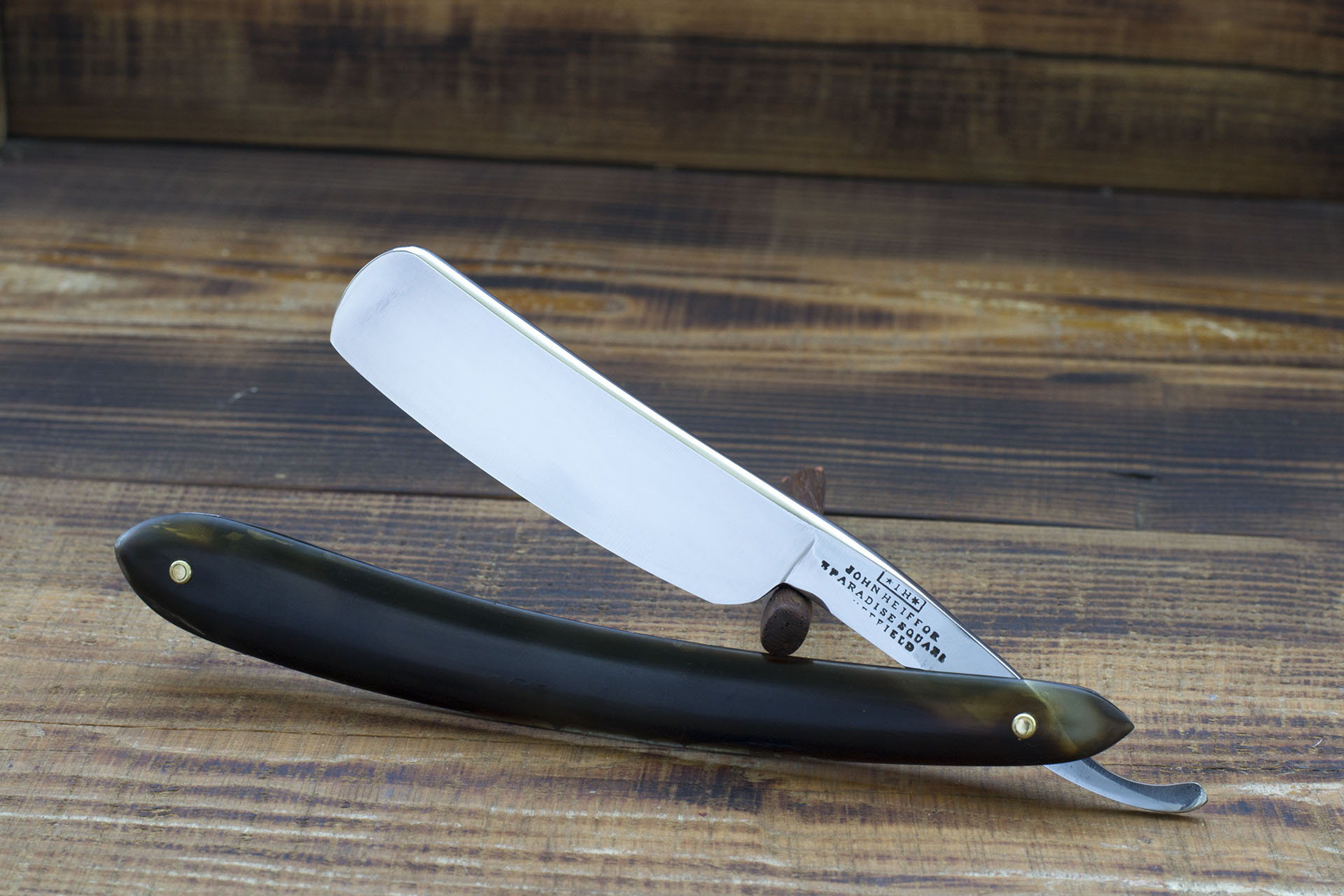 Знаменитый армейский клин от шеффилдского производителя John Heiffor. Бритва изготовлена во второй половине 19 века, после переезда фирмы на Paradise Square, в 1849 основатель марки John скончался и производство перешло в руки его сына Thomas. К 1852 году Thomas Heiffor значился как производитель армейских бритв, по моему мнению данный экземпляр как раз был сделан в 50-60 гг 19 века. На момент поступления бритва имела равномерный грубый сатин от гриндера и незначительные очаги коррозии, практически не имея явных следов заточки. По сути это NOS бритва, с учетом естественных факторов старения. Бритвы от Heiffor не являются исчезающе редкими, но в подобном состоянии армейские клины встречаются крайне нечасто. Ширина полотна 21 мм, родная роговая рукоять с некоторыми расслоениями, которые удалось проклеить. Так же удалось сохранить родные шайбы, элемент клейма, напоминающий арабскую вязь является торговой маркой фирмы. Бритва полностью сохранила родную форму, с радостью предоставлю фото исходного состояния клинка. Отличная геометрия и качественная шеффилдская литая углеродка являются залогом комфортного, качественного бритья и долгого удержания остроты кромки. Одна из тех бритв, от владения которой улучшается аппетит и обостряется зависть к самому себе. Бритва заточена и готова к бритью. Отличный коллекционный экземпляр. Продано Made for the army Show