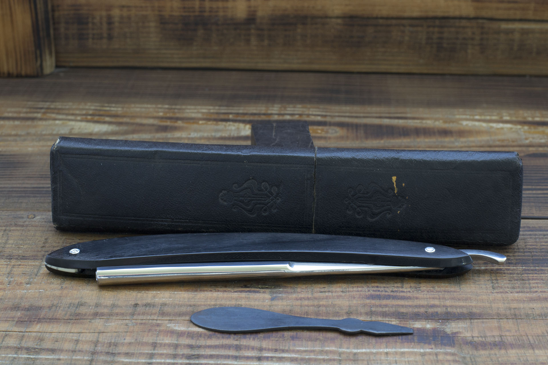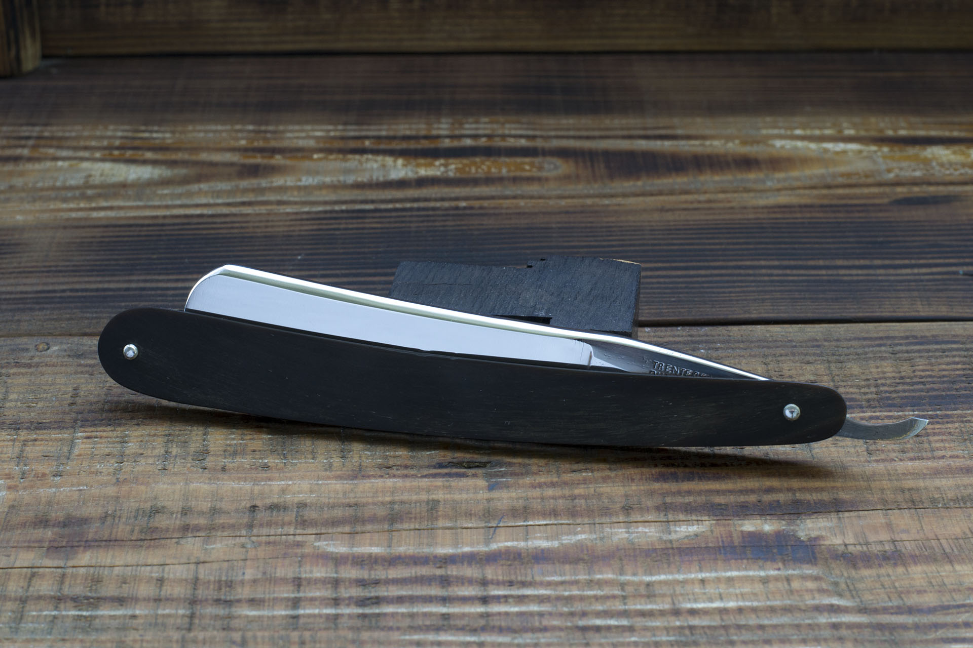 Французский клин от Vincent et Veuve Pény торговой марки IC Vincent Garanti. Прекрасный французский клин сильно улыбчивой формы, ширина 22.5 мм. родная роговая рукоять, шайбы конусом. Долго думал стоит ли выставлять бритву на продажу так как полотно имеет существенный дефект в виде трещины, выходящей на режущую кромку в 13 мм. от пяточки. Решился взять бритву на тест и после испытаний хочу сказать что вовсе не почуствовал какого то дискомфорта, волос не цепляла, после использования не образовались сколы по краям трещины и тд., т е все мои опасения оказались излишними, бритва вполне годна для использования. Кроме того, трещина расположена довольно близко от пятки, на участке который в бритье используется исключительно редко. Примечательно что трещину обнаружил только на позднем этапе работ, не было сколов и прочих признаков ее наличия, вероятно образовалась из за возможных нарушений в процессе ковки, думаю что просто лишний раз стукнули по остывающей заготовке. Бритва имеет прекрасную геометрию, сталь французская литая углеродка высочайшего качества. Отличный вариант для тех кто желает попробовать нечто подобное, бритва выставлена с огромной скидкой из за небольшой трещины возле пятки. Заточена и готова к бритью. Продано IC Show
