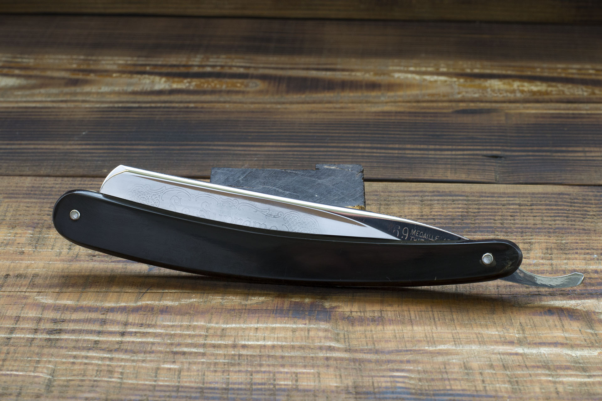 Французская опасная бритва от фирмы Thiers-Issard, изготовленная на одном из известнейших предприятий города Тьера, торговая марка 69 MEDAILLE ARGI. Предприятие было основано Пьером Тьером в середине 80-х годов 19 века, примечательно что Пьер был учеником мастера - изготовителя бритв а так же сам в последствии получил подобное звание в Гильдии. Нужно отметить что изготовление бритв и режущего инструмента было семейным бизнесом и вероятно Пьер, основав свою марку, в первую очередь преследовал цель межевания и отделения от семейного производства. Данный клин изготовлен в конце 19 века, имеет ширину полотна 20 мм и родную роговую рукоять. Клинышек бритвы изготовлен из целлулоида, что показывает постепенный переход предприятия от традиционных материалов к более современным, в остальном же - технология производства данного клина полностью аутентична и старомодна. Геометрия - традиционный для Франции клин с легкой улыбкой и небольшим парикхерским вырезом, форма рукояти так же полностью традиционна, геометрия полотна на высшем уровне - фаска режущей кромки тонкая и равномерная. Мягкая кованная углеродистая сталь, произведенная во Франции традиционным способом, идеальна для бритв с вогнутостью клин. Бритва заточена и готова к бритью, отличный коллекционный экземпляр - ранняя бритва знаменитой фабрики, продолжающей работать и по сей день. Продано 69 Show