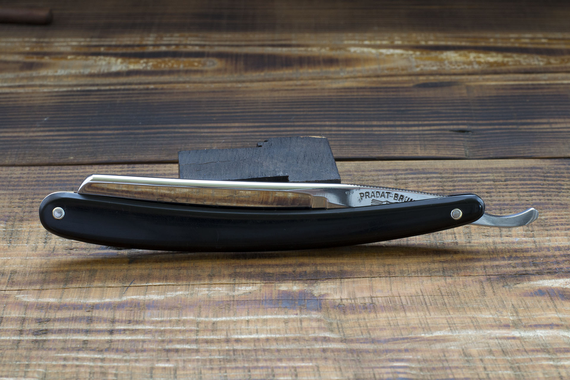 Бритва известного французского бренда Pradat Brun с товарным знаком в виде помазка. Так же на полотне бритвы изображена еще одна торговая марка, представлявшая Pradat Brun, это девочка на самокате. Не встречал точного названия марки, но некоторые французы просто называют ее "Fillette a Trottinette " что собственно и есть "Девочка на самокате". Судя по всему бритва довольно старая, вероятно изготовлена до 30-х годов 20 века. Более поздние варианты имели более четкий рисунок девочки, а в данном случае, понять что это девочка да еще и на самокате почти невозможно, конечно если не знать что это именно она. Я сначала подумал что это какой то шотландец, бредущий по каменистой земе своих предков и только долгие поиски в сети прояснили дело, Очевидно что девочка на самокате являлась не слишком частоиспользуемой торговой маркой Pradat Brun. Бритва иммет ширину 19 мм. (6/8), родную пластиковую рукоять, вогнутость полная. Судя по всему, бритва нетронута и не точилась до меня, я лишь щадяще отполировал полотно и произвел заточку. На бритве остались некоторые мелкие каверны, совершенно не влияющие на функциональность Продано Brun Show