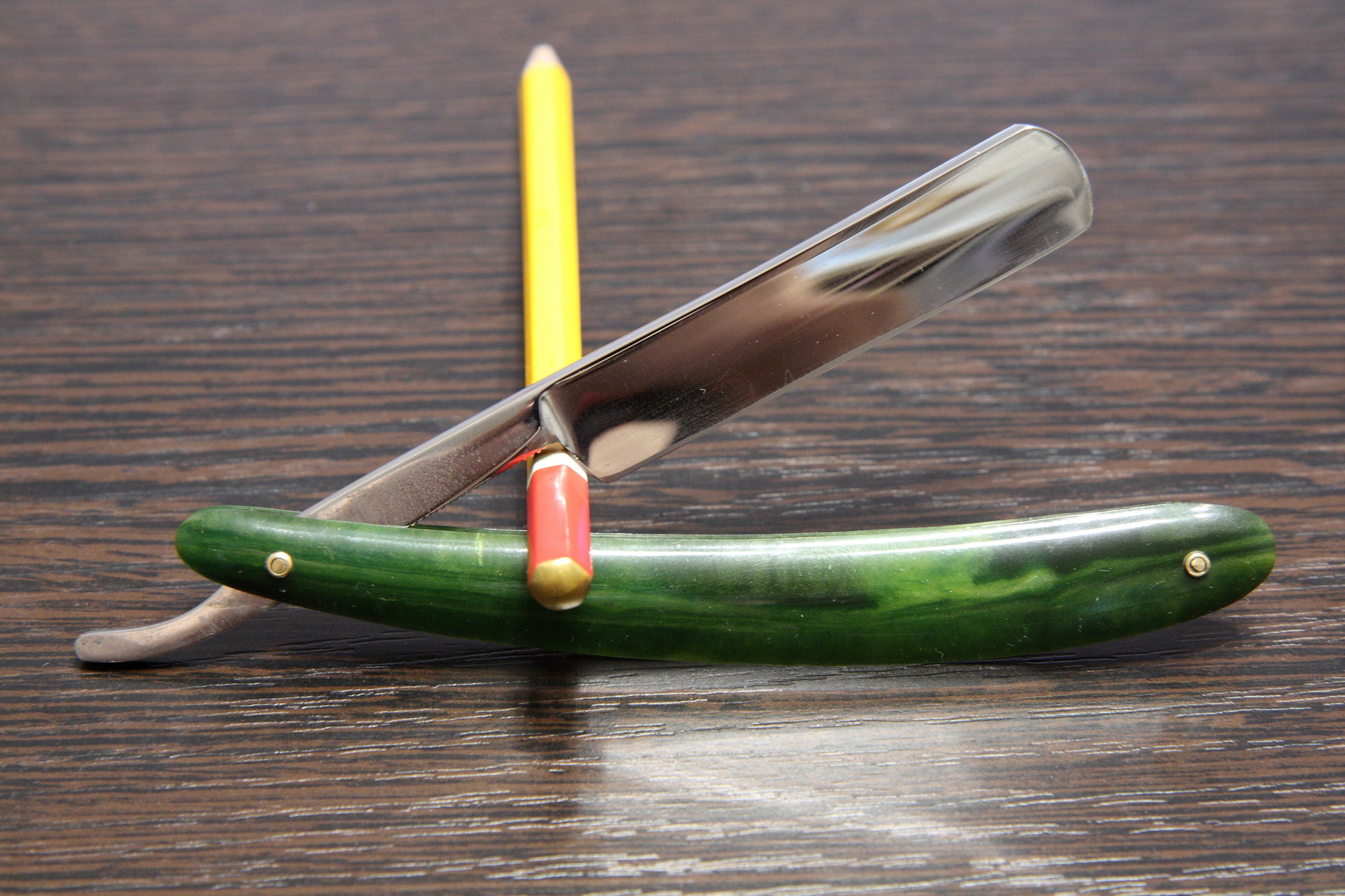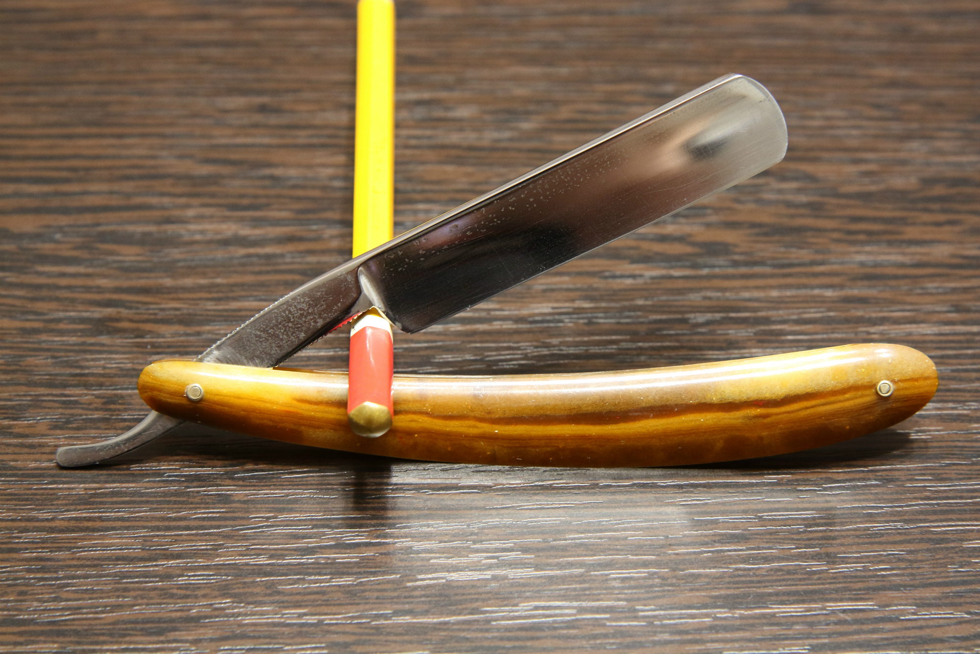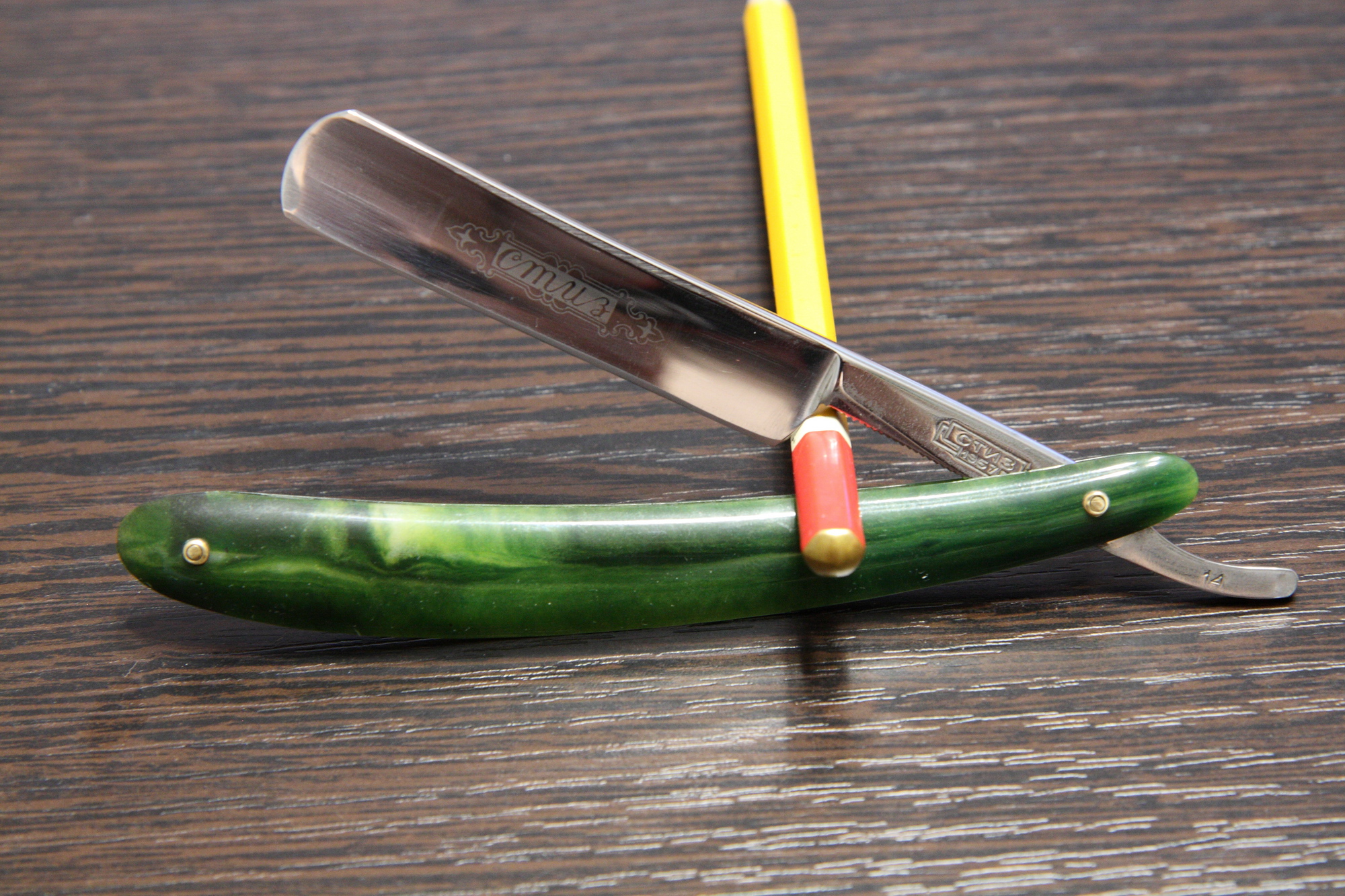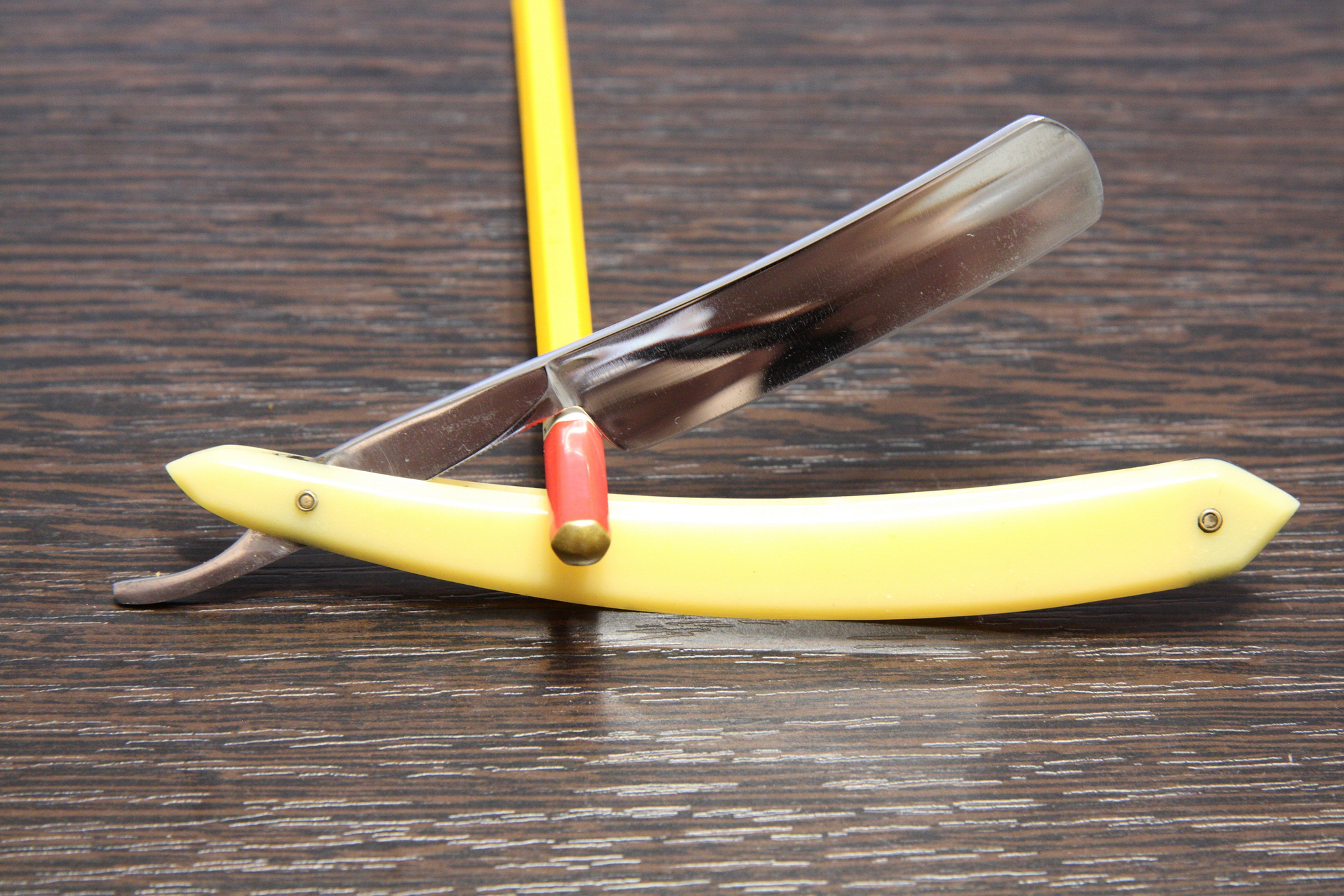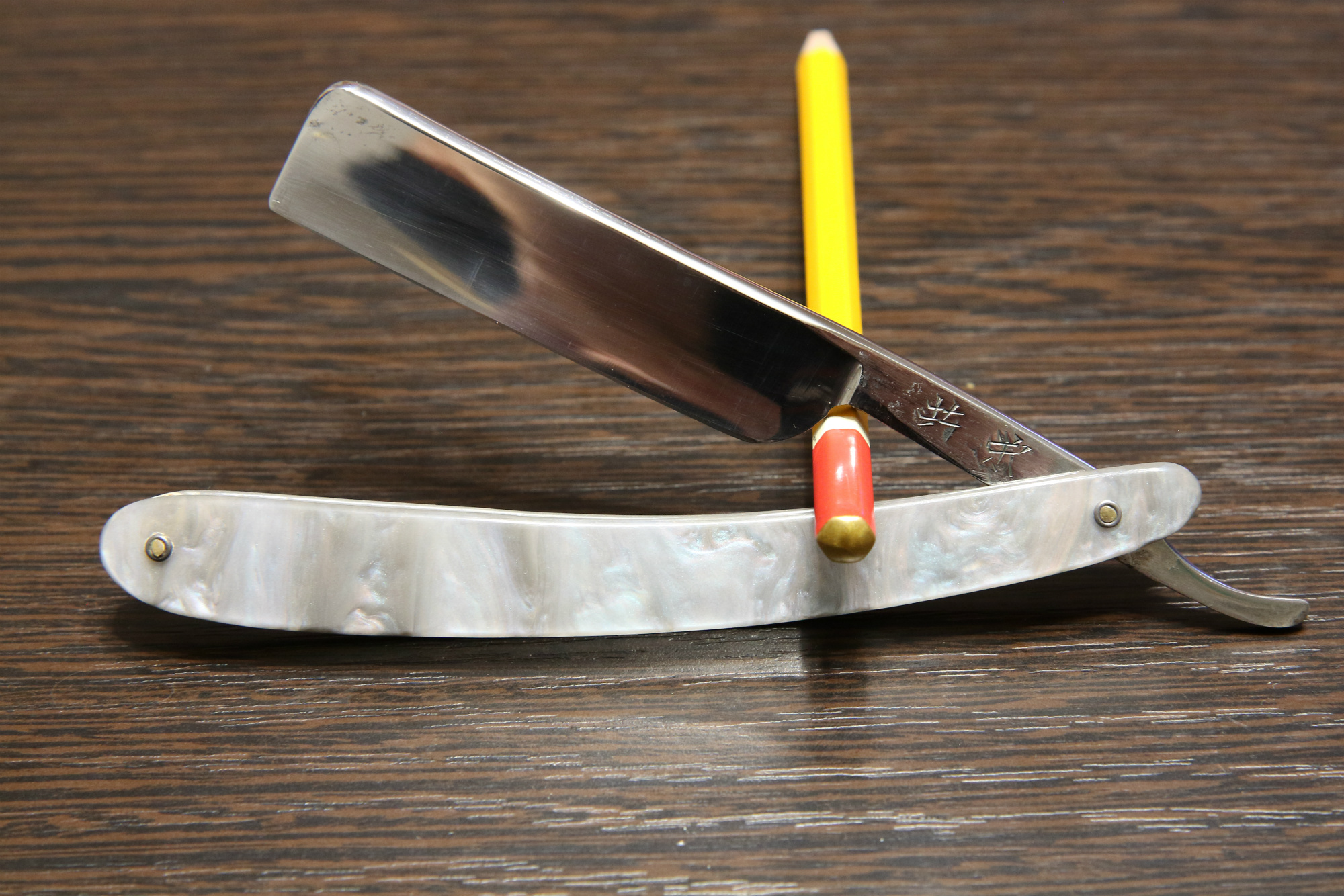 Опасная бритва ручной работы, не серийка, сделана в Японии в какой то общине, ширина полотна 20 мм, профиль полуклин, ручка из перламутрового пластика, все родное. Сталь Ясуки, их традиционная твердая углеродка. Подготовлена мной к бритью (сносит любую щетину как бульдозер за счет веса и профиля). Цена - руб.