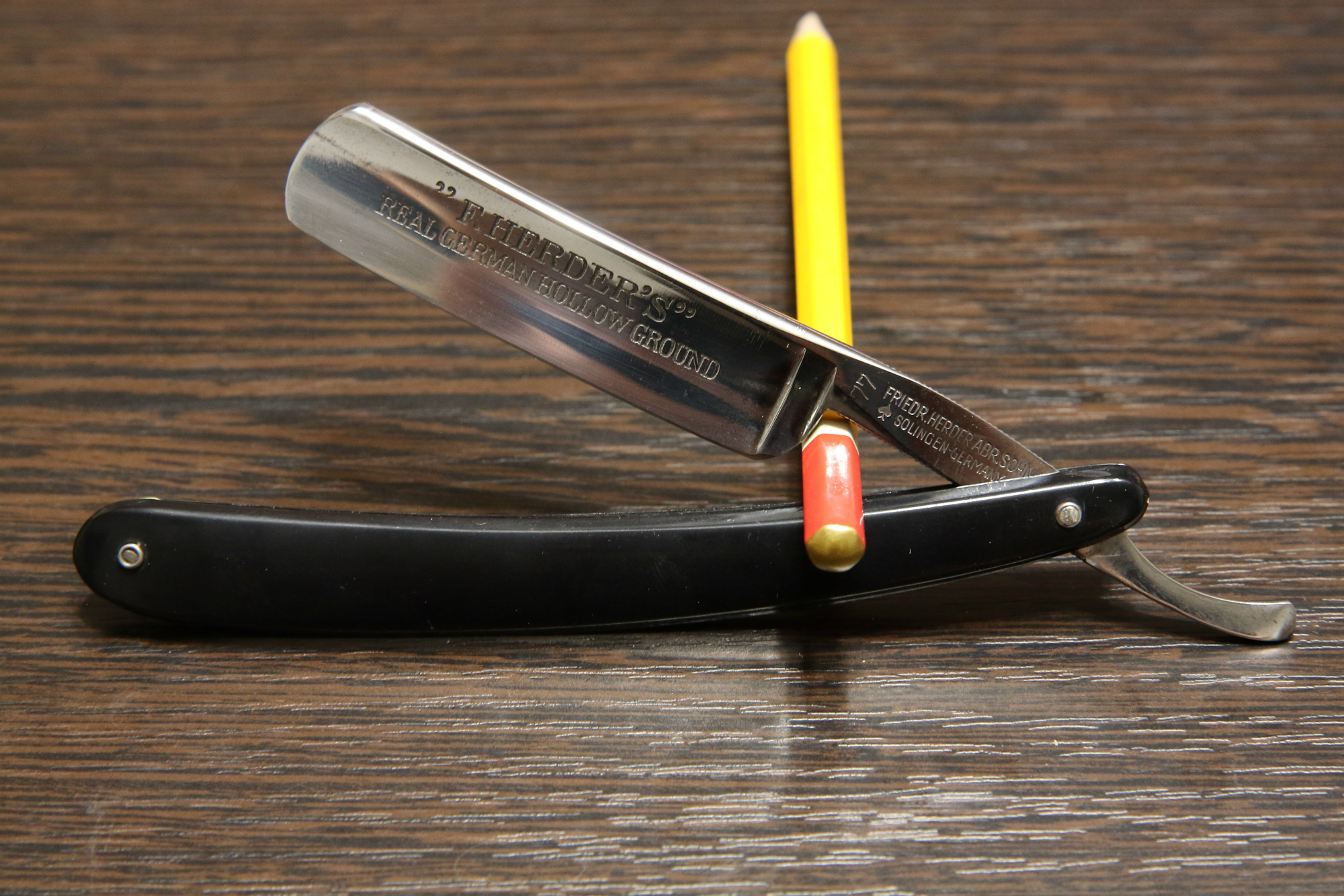Опасная бритва F.Herder 77, сделана в г. Золинген (Германия), ширина полотна 19 мм, отличная углеродистая звонкая немецкая сталь, полная выборка, легкая улыбка, все родное. Подготовлена мной к бритью (бреет отлично, чисто и не агрессивно). Один из старейших и самых почитаемых брендов Золингена. Цена - руб.