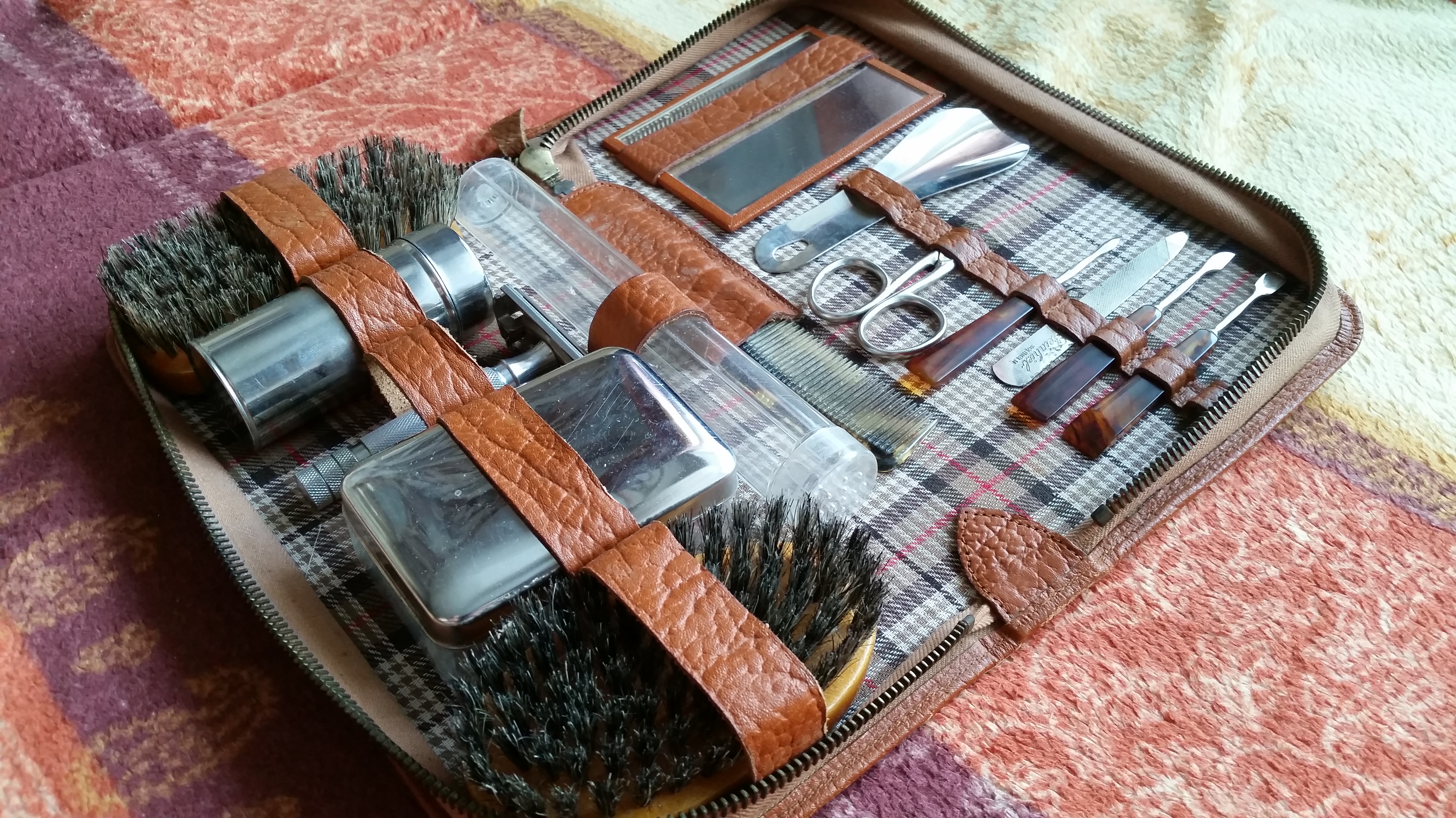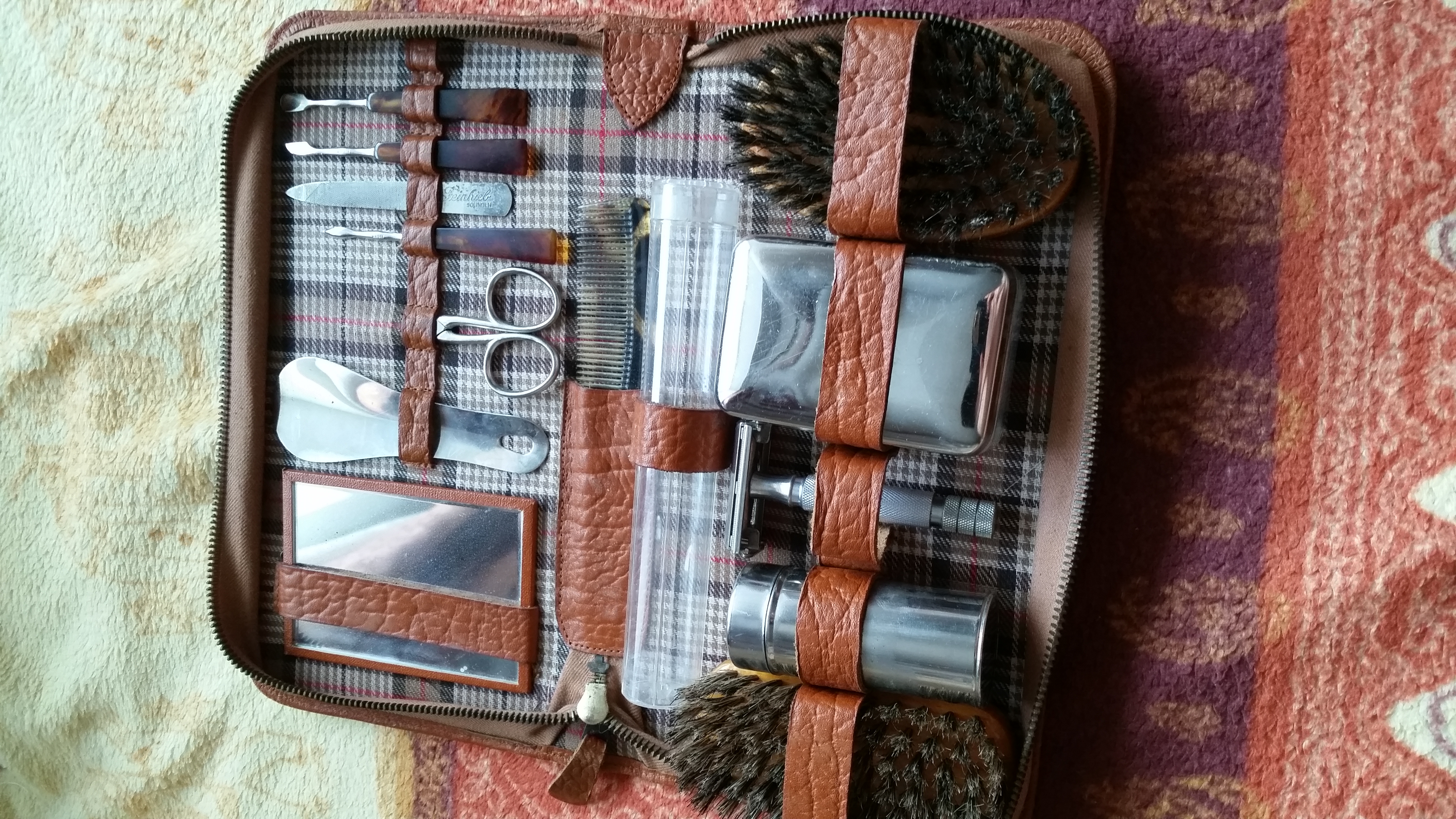 Несессер настоящего джентльмена из прошлого. В комплекте т-станок Gillette Rocket (конструкция бабочка, полностью рабочий, сделал ему дезинфекцию Стериллиумом), две щетки, металлический тубус с помазком, емкость под мыло, длинный прозрачный тубус, расческа, зеркальце, ложка для обуви, инструменты для маникюра (ножнички, пилочки, лопаточки и т.д. с маркировкой Made in Germany или "Solingen"). Все это находится в сумочке под кожу на молнии, состояние всех вещей хорошее (все предметы оригинал и из тех времен). Несессер был куплен в г. Бонн, Германия, потом привезен сюда (было это все до появления коронавируса). Шикарный винтажный комплект, можно не только бриться и ухаживать за собой, но и получать эстетическое наслаждение от обладания и созерцания данной вещи. Цена - руб.