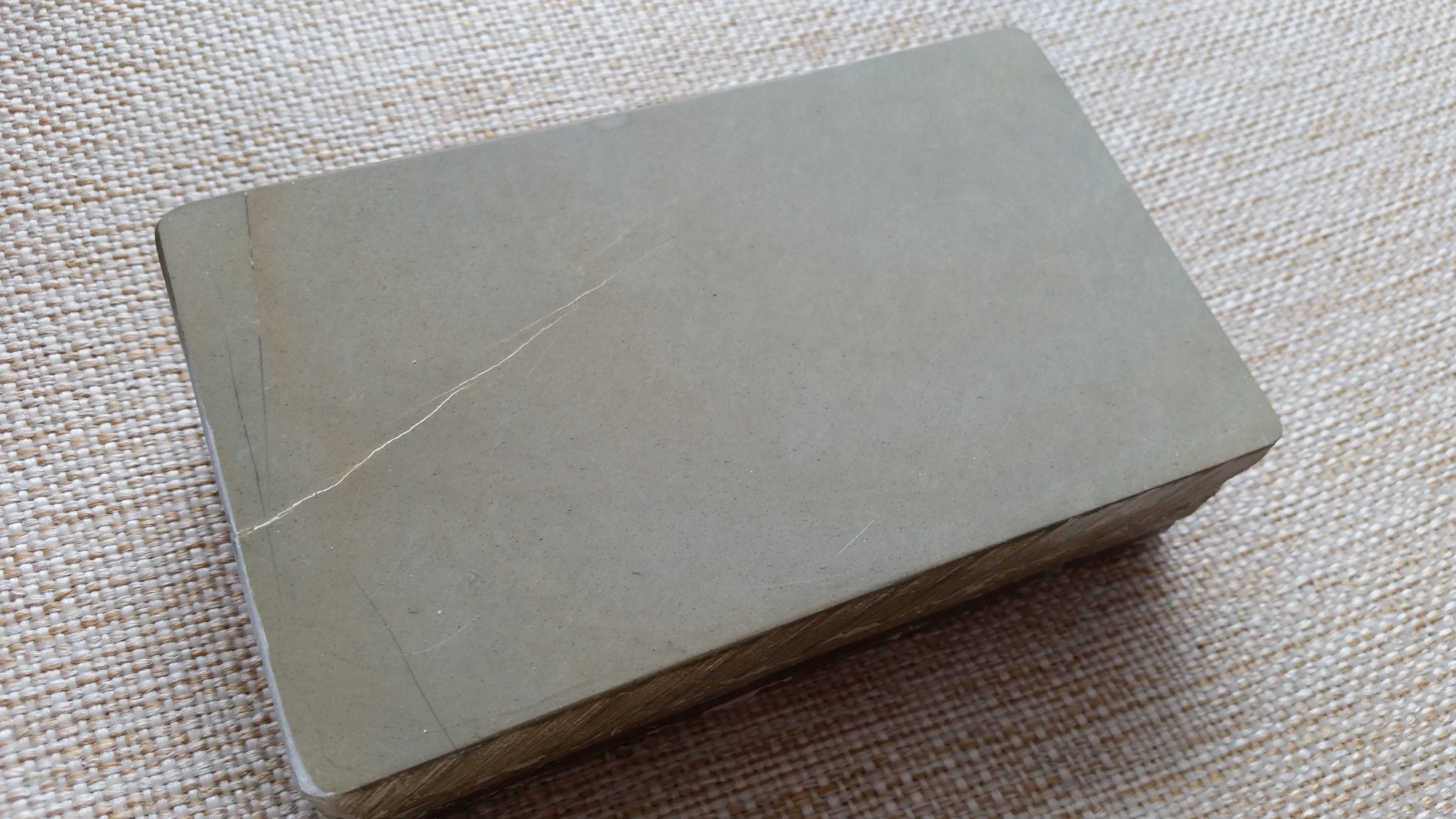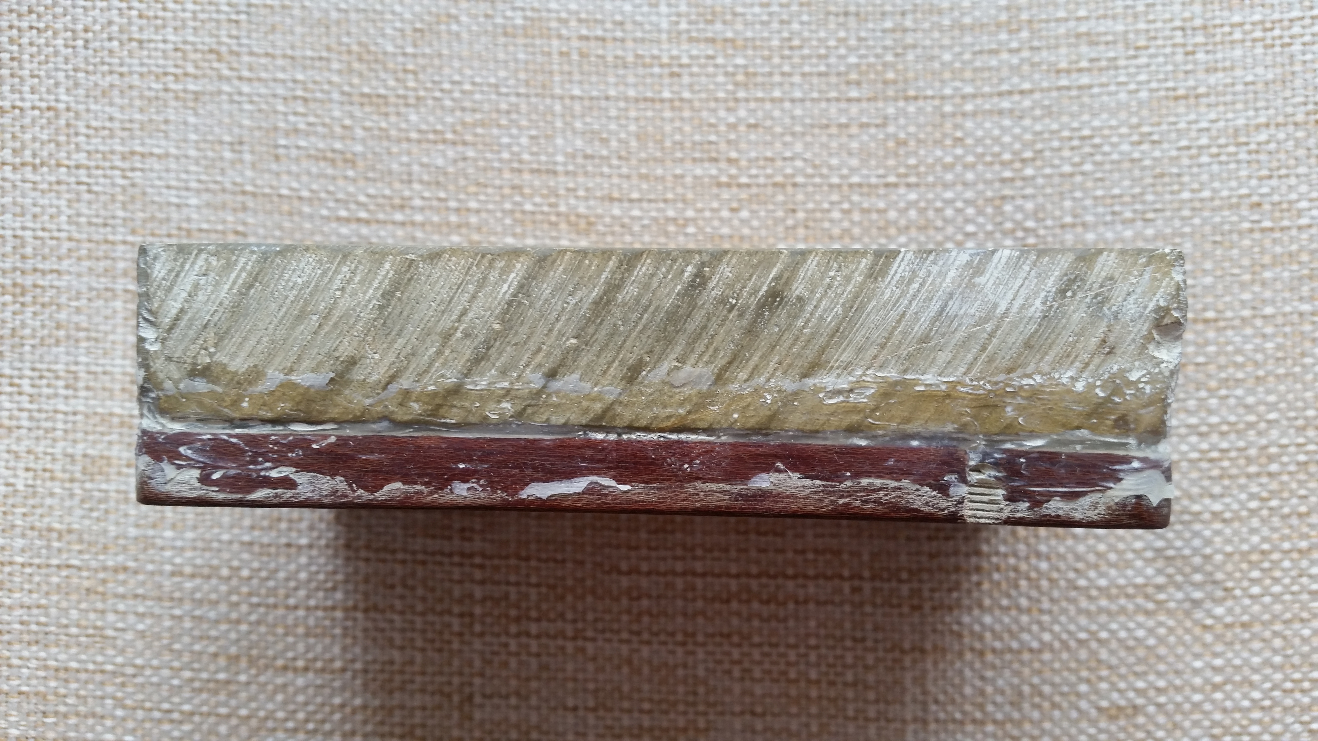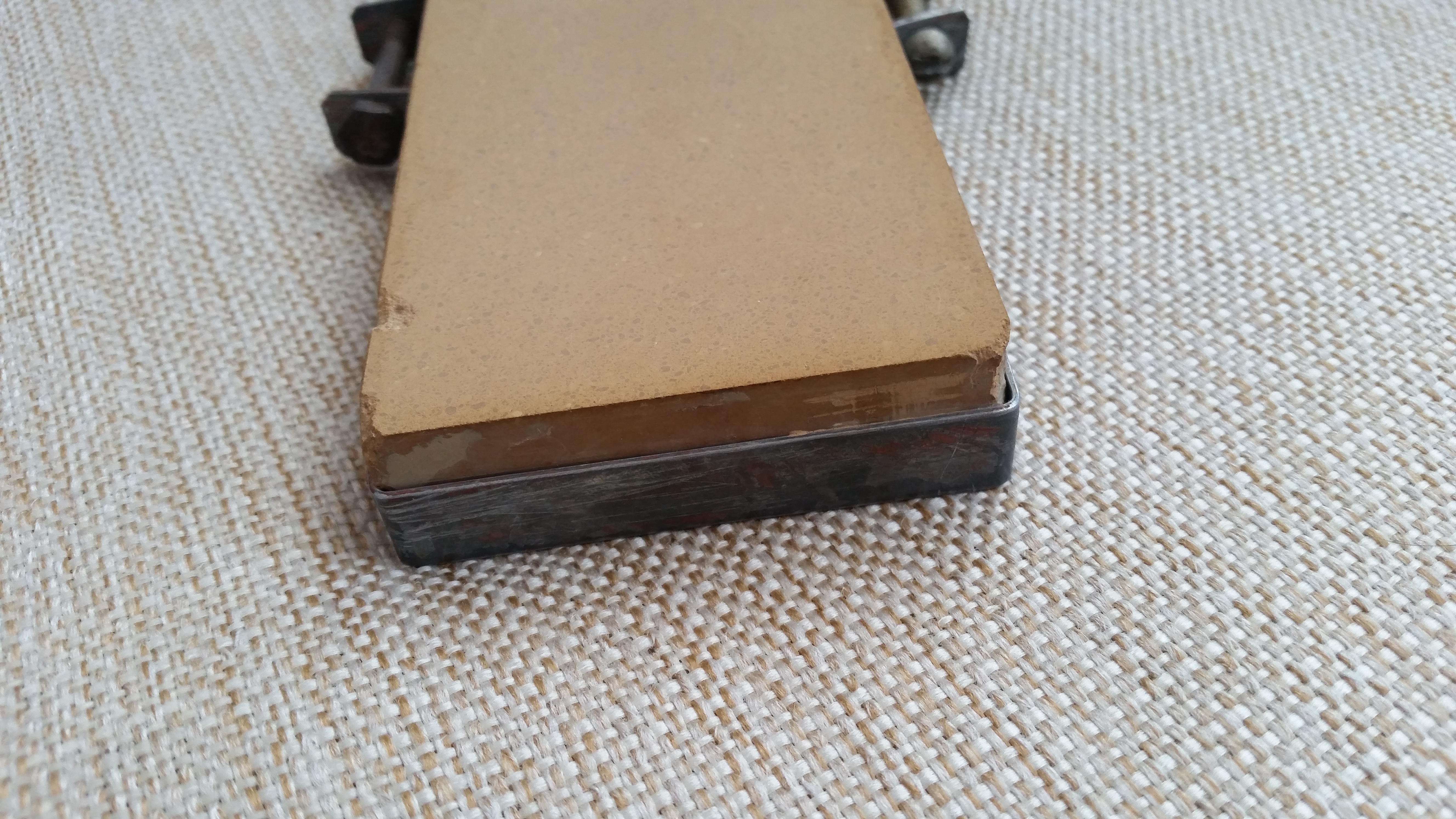 Синтетический японский водник King, зернистость 4000 по JIS, старого производства (сейчас именно такие не делают). Куплен на аукционе в Японии. Размеры 210х70х22 мм. Раскололся пополам от падения, сделал ему стяжку из оцинковки и подготовил поверхность. Трещина забьется суспензией и будет работать штатно. Есть скол одного угла и скол на одной грани, на фото видно. Связка бакелитовая, много воды не пьет, сохнет быстро. Использовал его с суспензией (ботан или синтетический слурик) после 1000 для затирания рисок, справляется за 6 - 7 минут и готовит кромку к тонким природникам или 8000 синтетику. Вообще, отличный камень, после его раскола, заменил его суитой, поэтому к нему так и не вернулся. Цена - руб.