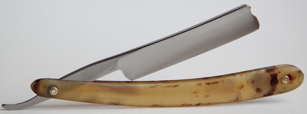 Бритва в очень хорошем состоянии, для своего, почти 100-летнего возраста.Была разобрана, немного почищено полотно от старой патины. Ржи практически не было, так что работы минимальные. Пины поменял на более надежные немецкие втулки, с добавлением внутренних шайб.Сталь и кромка чистые. Идеальная геометрия. Роговая оправа не только красива, но и находится также в отличном состоянии.Заточена и готова к бритью.