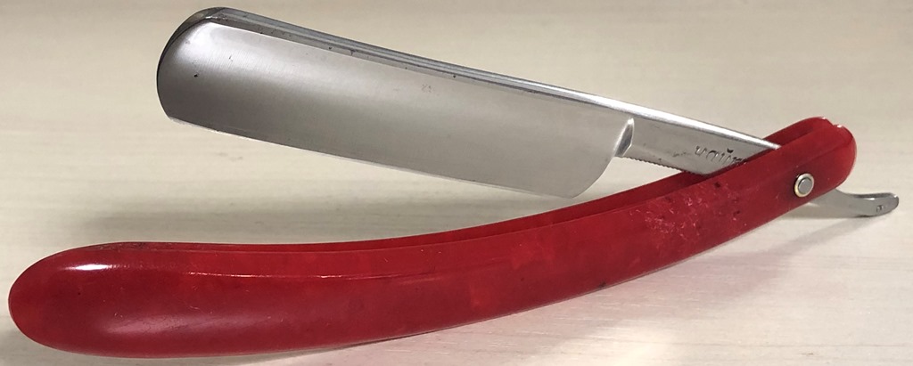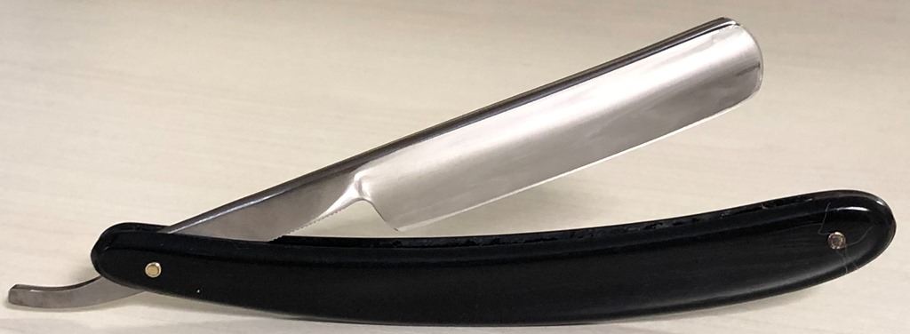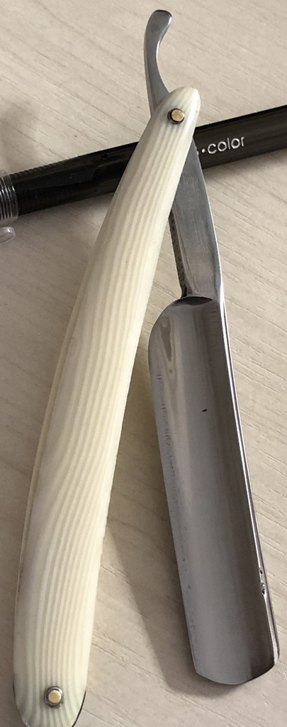 Очень долго лежали у меня две бритвы,на которые я совершенно не обращал внимания, по причине того, что чисто интуитивно они мне не понравились, а визуально сталь клинков показалась мне какой то странной. Но, недавно решил ими заняться и, честно скажу, в этот раз опыт и интуиция меня подвели. Помимо того, что обе бритвы были совершенно непользованными,но со "следами времени", то и сталь прекрасно точилась, доводилась на тонких натуральных абразивах, естественно с прохождением всевозможных тестов. Но, самое главное, первое бритье превзошло все мои ожидания. (обычно, когда у меня есть вопросы и сомнения по поводу той или иной бритвы, то после заточки, на момент бритья, беру с собой ещё одну проверенную бритву,чтобы нормально завершить процесс и не мучить себя некачественным бритьём).Бритье показалось близкое к эталонному, без каких либо неудобств, раздражений и прочих неприятных ощущений. К тому же, сама бритва имеет средний размер и по многим показателям идеально подойдет для новичка,ну а для опытного товарища вообще говорить не приходится. Так как первая бритва так и не дошла до моей темы продаж и была сразу продана, то представлю второй экземпляр.