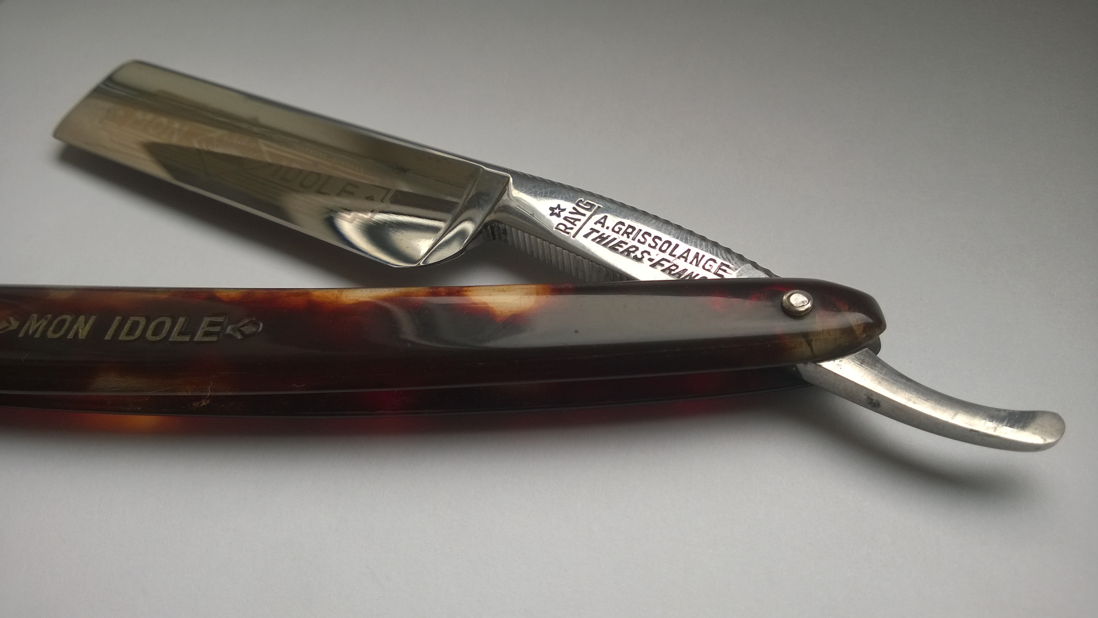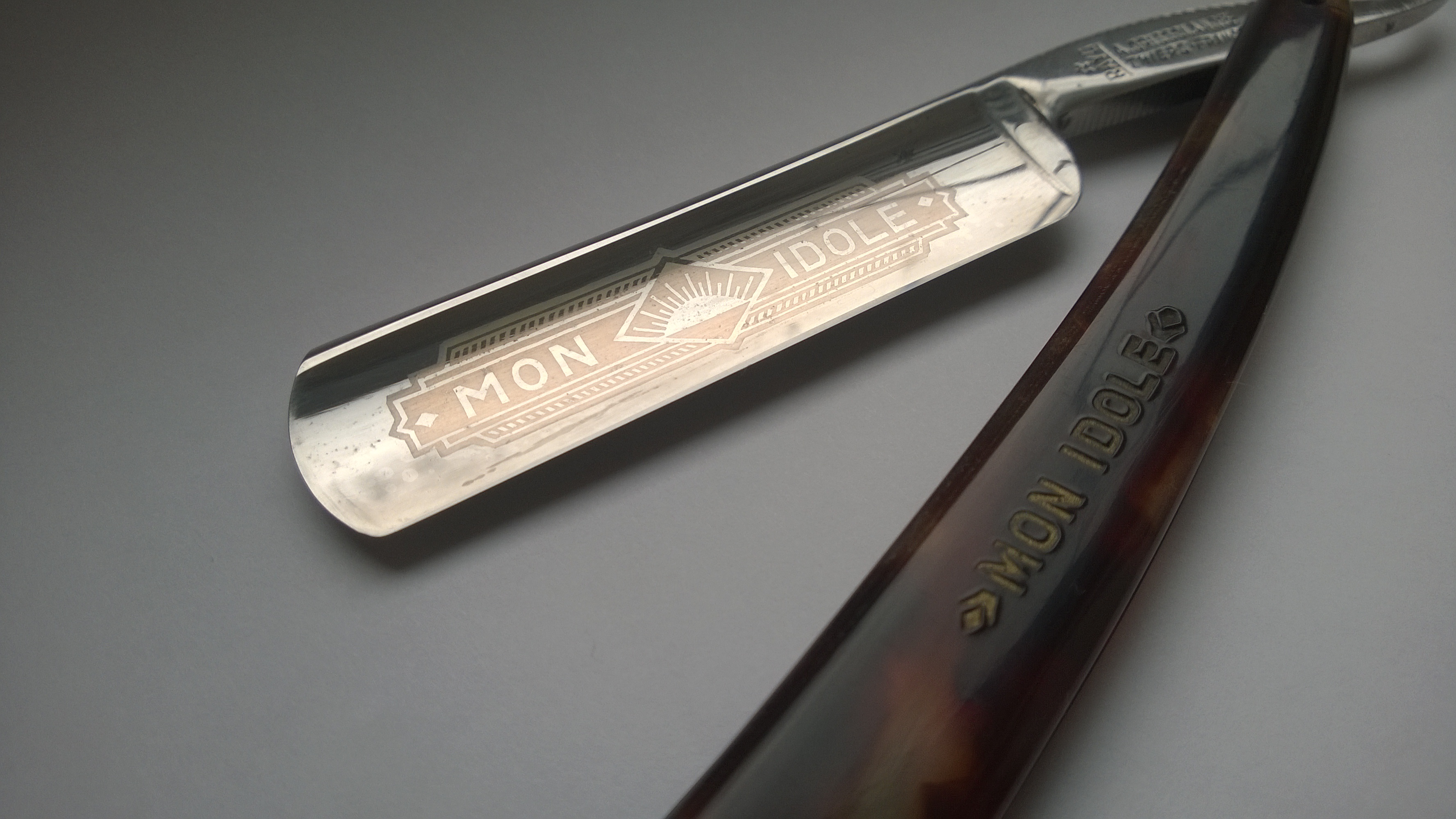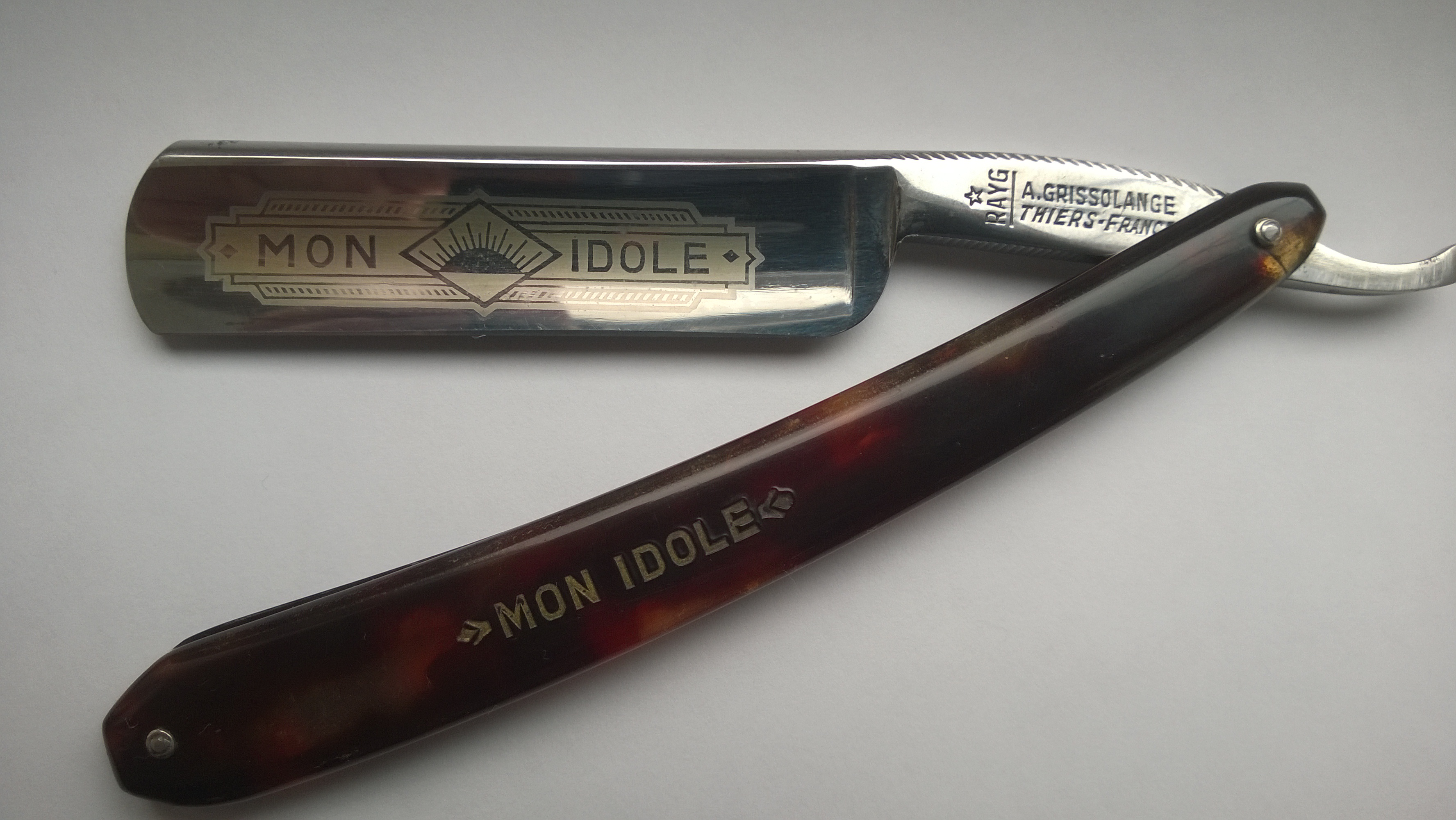 Отличный редчайший француз "Мой Кумир". В интернете за последние 5 лет видел еще один экземпляр в очень плачевном состоянии. Углеродистая сталь, ручка под черепаху (а может и сама черепаха, не с чем было сравнить). Отличная геометрия. Ширина полотна 19,5мм, длинна режущей кромки 70мм. Заточена и готова к улётному бритью.