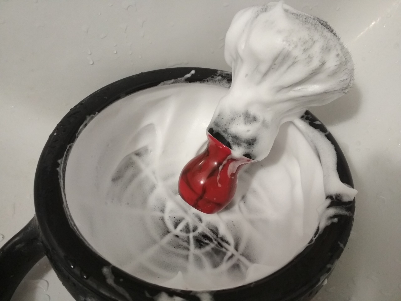 Пена должна быть густая, не просто много жидкой пены а именно густая пена с большим количеством мыла, в противном случае первый проход будет нормально брить, а на втором проходе будет подтормаживать бритва. Я так с мылом КатринДо "ошибся", пены вроде много, а мыла набрал мало и даже была мысль "разоблачающий" пост писать, что все не так, как нам продают ). Вот только определить качество пены возможно только исходя из практики, я читал что должна быть густота жидкой сметаны, что бы типа как шапка стояла - но с малым количеством мыла и немного дольшей работой помазка этого добивался. Но только достаточное количество помогает бритве скользить, не экономьте мыло - это больно (по крайней мере на начальном этапе)