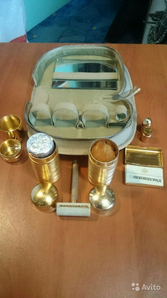э-э-э... это обычный дорожный советский набор. Такие на авито регулярно всплывают, за лето по Москве штук шесть видел по цене 400-1000 руб в зависимости от комплектации и жадности продавца. Они выпускались разными предприятиями и отличались немного дизайном (кто какой штамп изготовил) комплектацией. Не думаю, что это советское изобретение, скорее реплики каких-нибудь западных образцов. Там было пара таких цилиндрических контейнеров, один для "мыльных палочек" (стиков) второй был с мини-помазком. плюс один-два контейнера для лезвий плюс контейнер для кровостанавливающего карандаша (квасцы) иногда был еще один контейнер неясного для меня назначения.