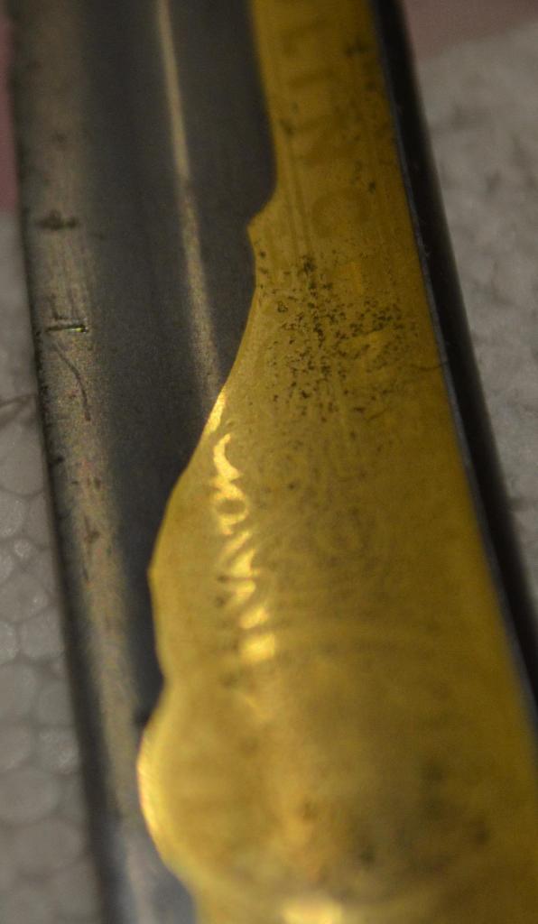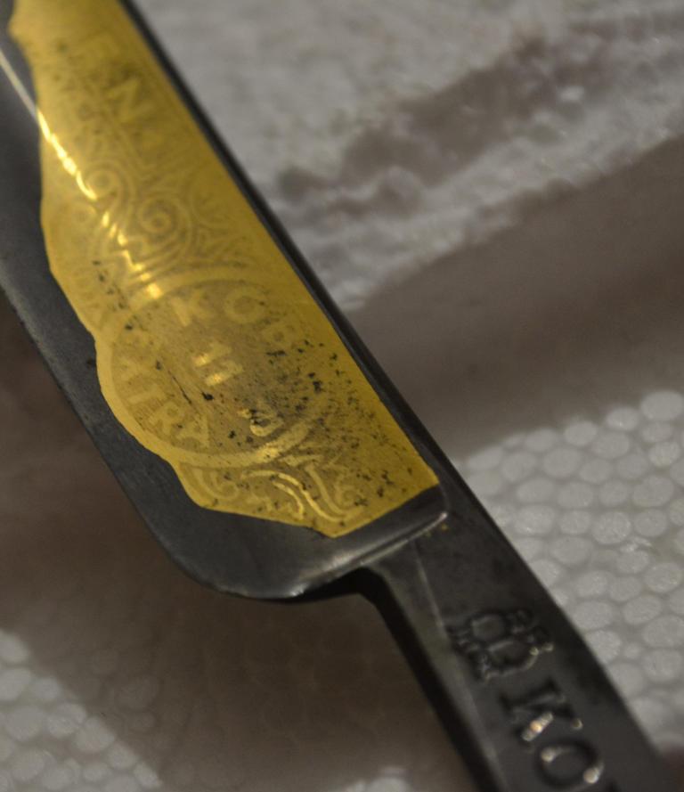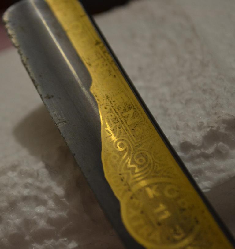 Re: Чем снять ржавчину и сохранить рисунок?Эту паутинку не стоит трогать. Кромку не задела, и хорошо. Наждачка все равно не уберет ее до конца. Главное, чтобы каки не было. Будет тебе бритва с аутентичностью.