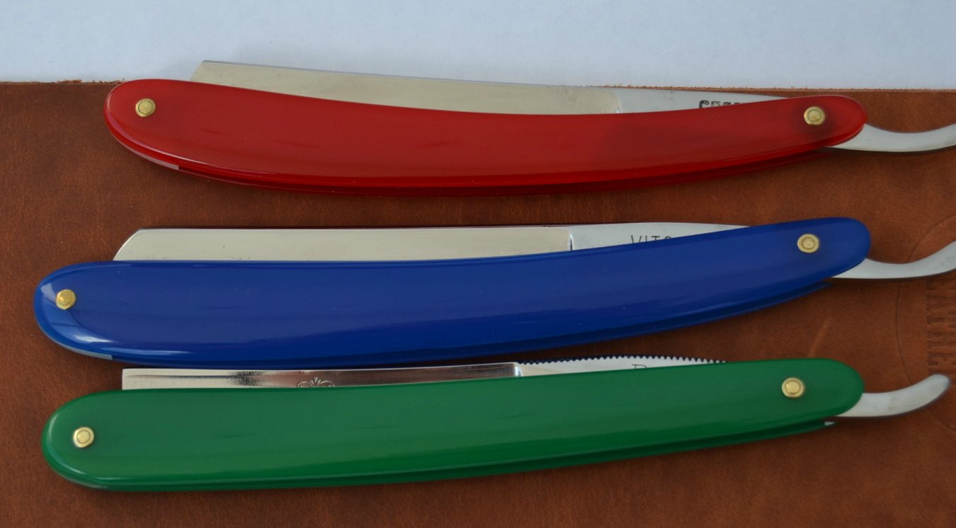 Цвета яркие, нетрадиционные, но то желание заказчика.. Были еще пластины цвета кости, но все заготовки я испортил во время обучения. А вот с этими вроде все получилось. Spoiler Show Re: Ручка - ремонт, замена, изготовлениеОтличные цвета и свежее решение. И как следствие-бодрый вид бритовок. Молодца!