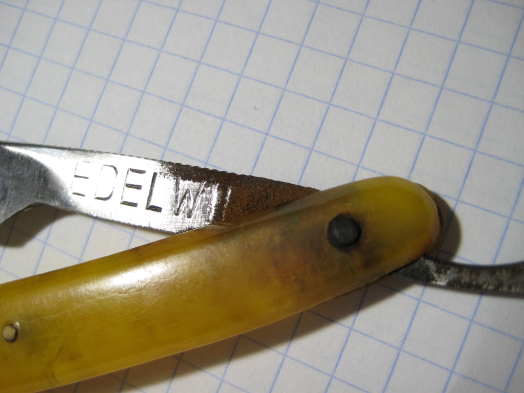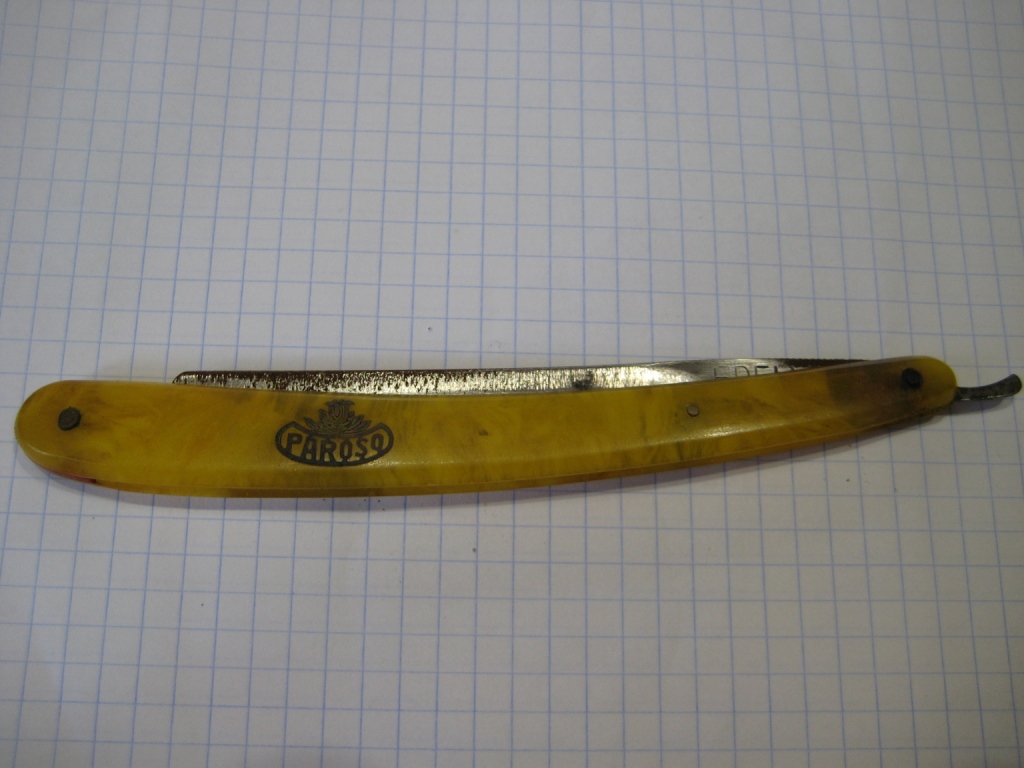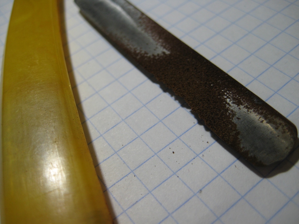 Внимание, целлулоид - убийца бритв.Довожу до сведения форумчан, что есть такая опасность, как старый целлулоид, который спустя десятилетия становится активным пожирателем стали. Вот фото такого откровенного жора. Бритва лежала сухой, в правильном шкафчике, специально оставил её для эксперимента и показа, что делает химия с бритвой ( эксперимент длился 1-1.5года).