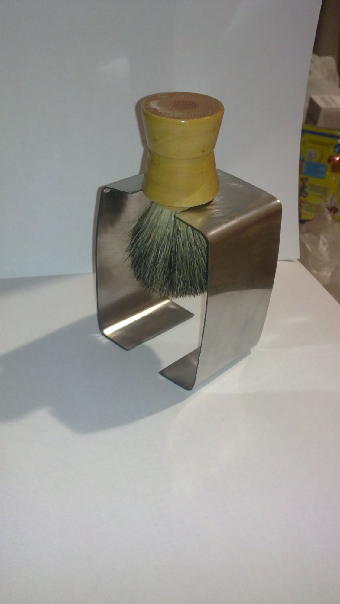 Сделал две подставки с нержавейки. Та что первая оставил для своего маленького помазка, вторую другу подарил - у него помазок покрупнее, да и смотрится посолидней. Толщина метала 0,5 мм, вырезал знакомый на "плазме" , по моим чертежам. Я снял заусенецу (она там крупной получилось), отполировал и согнул.
