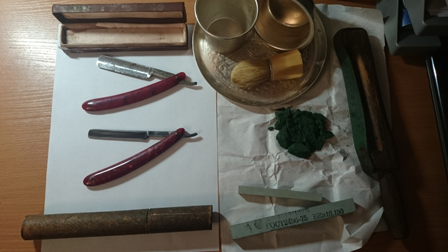 Вот все что мне привезли. Две бритвы: одна была в пользовании последний раз 5 лет назад, вторая вроде как вообще никогда (сразу видно где какая по следам коррозии). Стаканчики и помазок. Ремень с пастой (ремень самоделка и узковат). Сама паста в виде зеленого порошка. Два каких-то камня (зернистость не знаю). Все еще советское.
